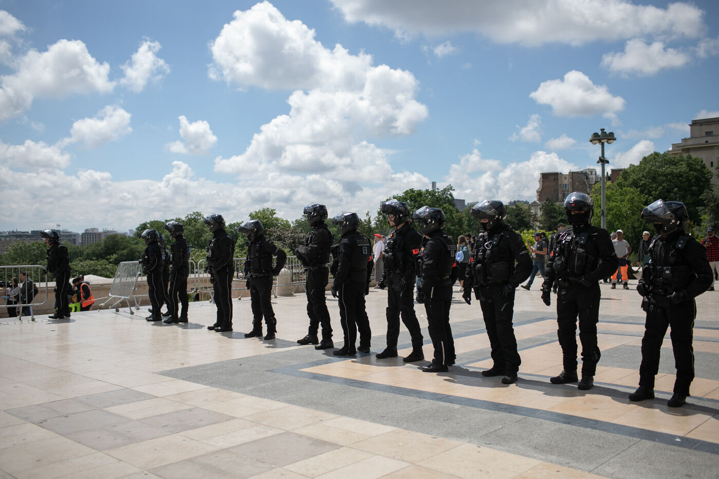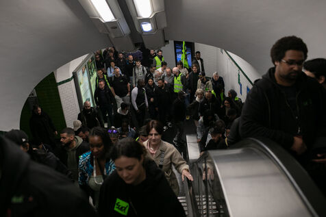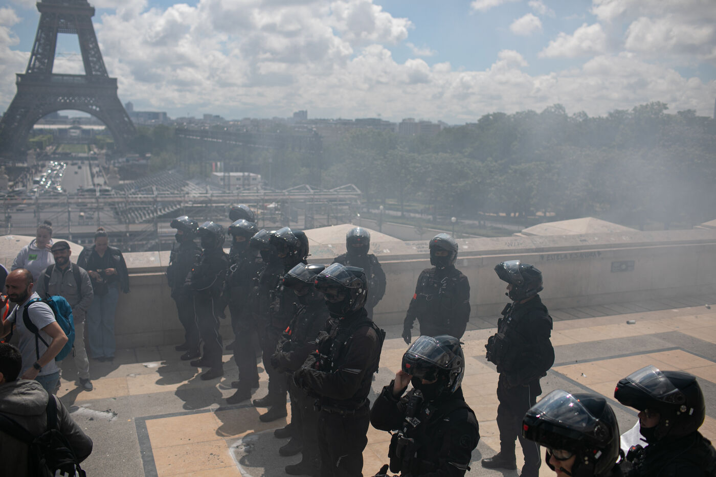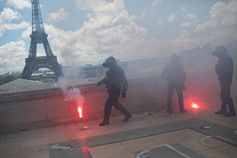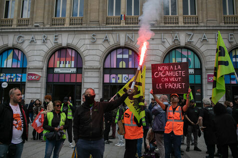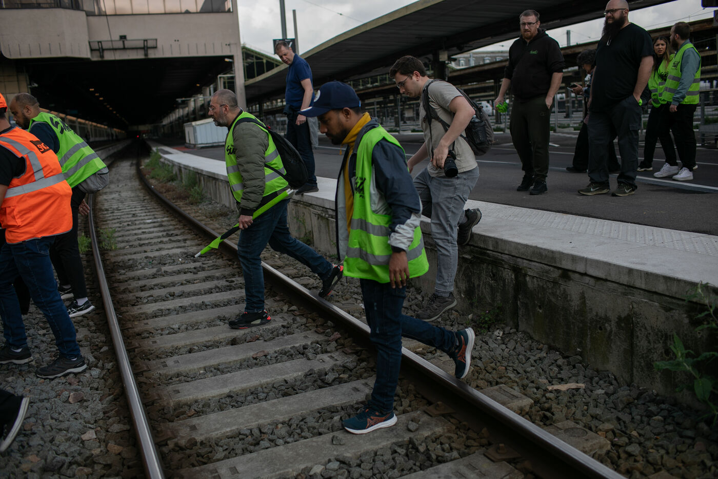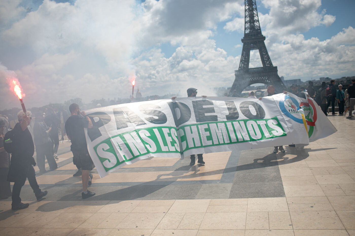 RAIL WORKERS ON STRIKE ACTION IN FRONT OF THE EIFFEL TOWER