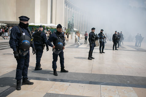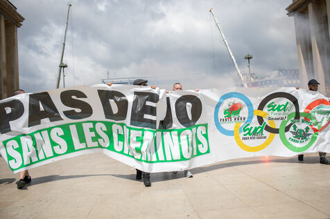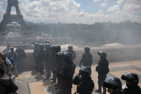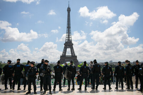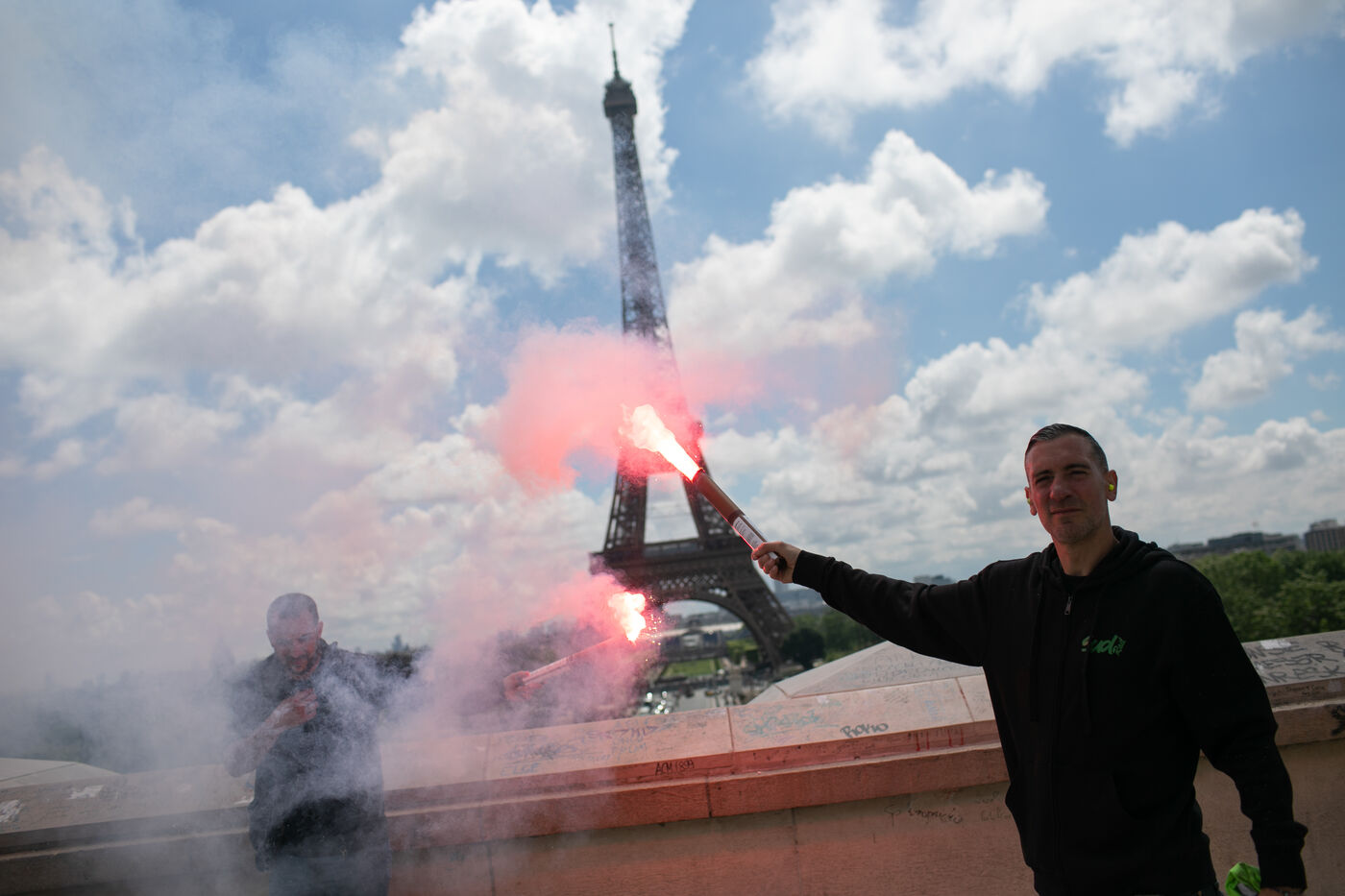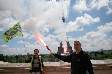 FRANCE, Paris 21 mai 2024, action by railway workers on strike in front of the Eiffel Tower. Railway workers demand JO bonuses for those who will be working during the Olympic Games.