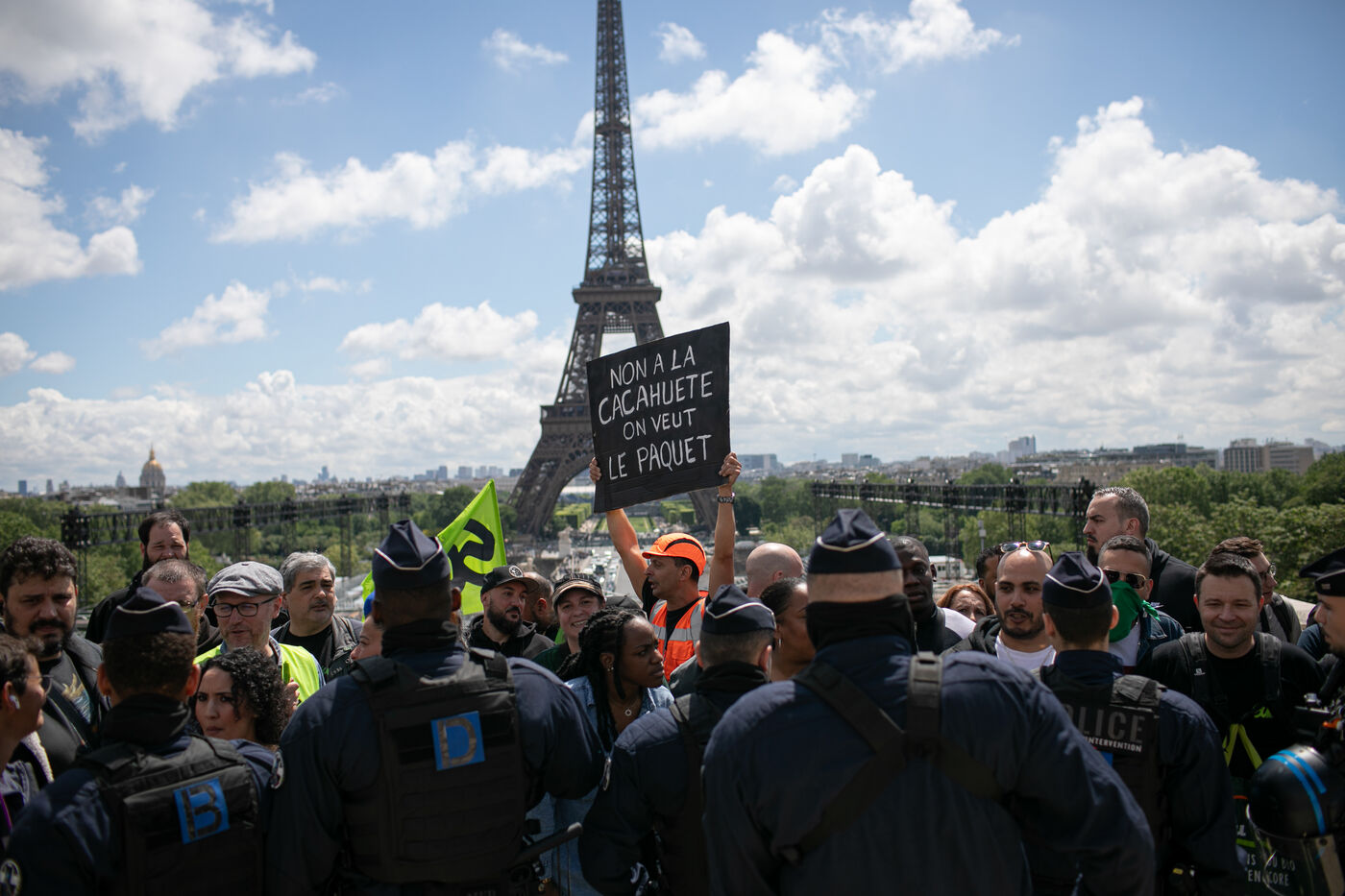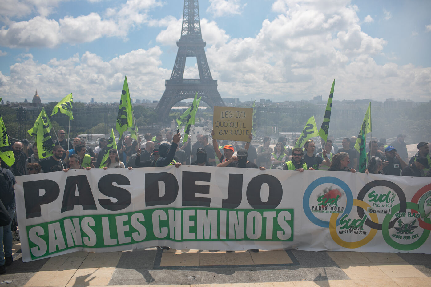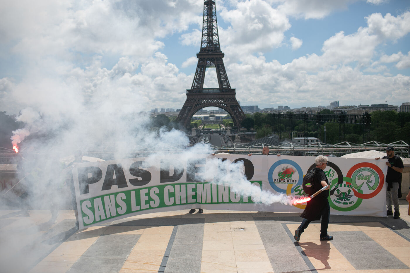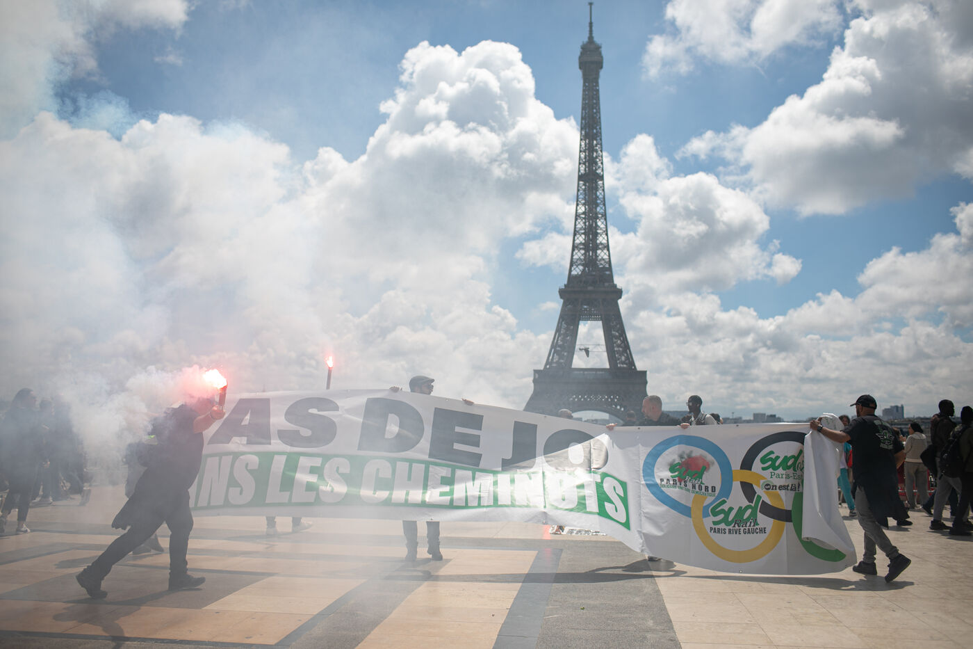 FRANCE, Paris 21 mai 2024, action des cheminots en grève devant la Tour Eiffel. Les cheminots réclament des primes JO pour ceux qui travailleront pendant les Jeux olympiques.