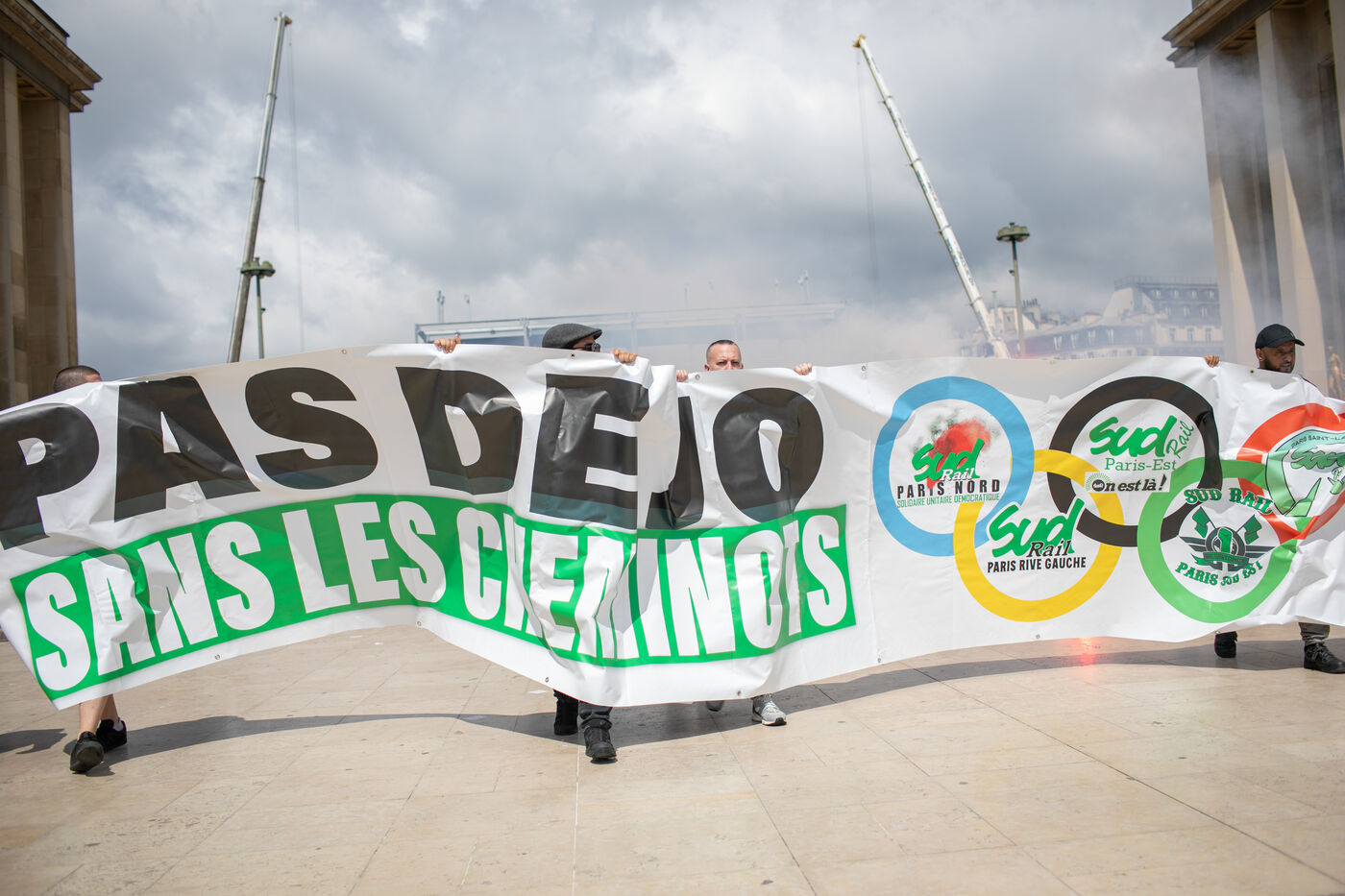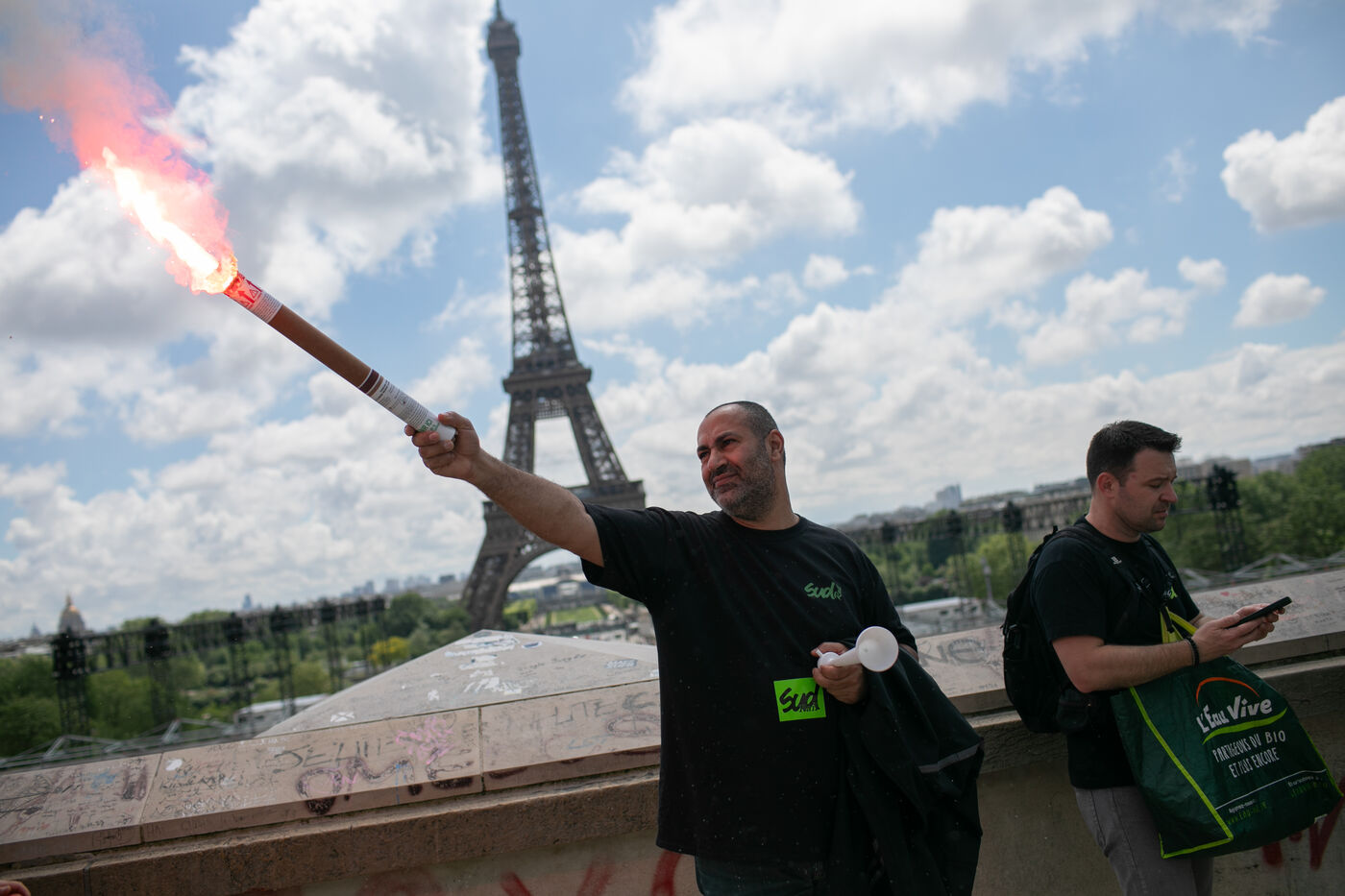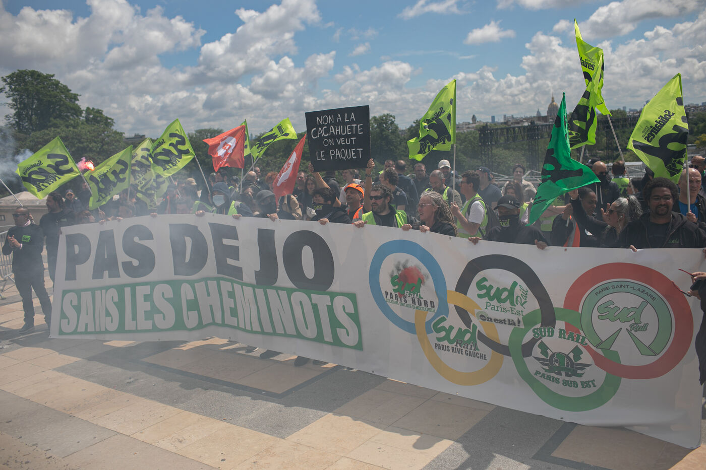 FRANCE, Paris 21 mai 2024, action des cheminots en grève devant la Tour Eiffel. Les cheminots réclament des primes JO pour ceux qui travailleront pendant les Jeux olympiques.