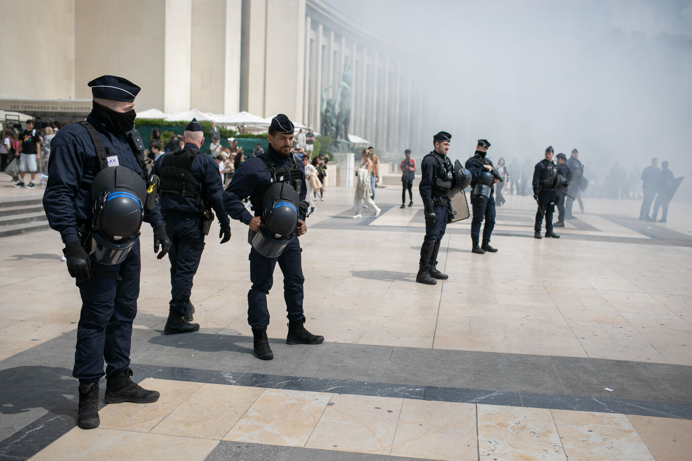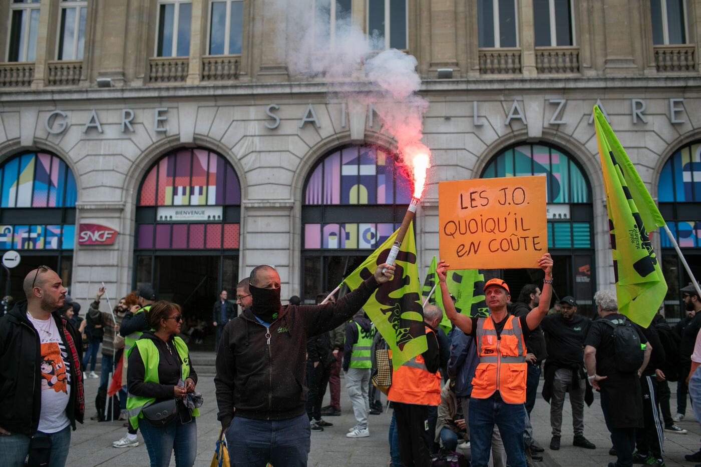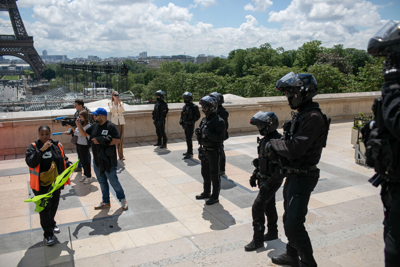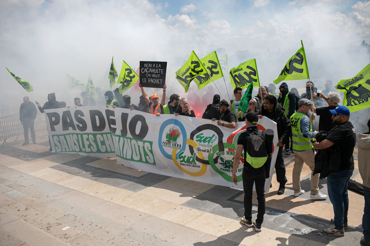 FRANCE, Paris 21 mai 2024, action des cheminots en grève devant la Tour Eiffel. Les cheminots réclament des primes JO pour ceux qui travailleront pendant les Jeux olympiques.