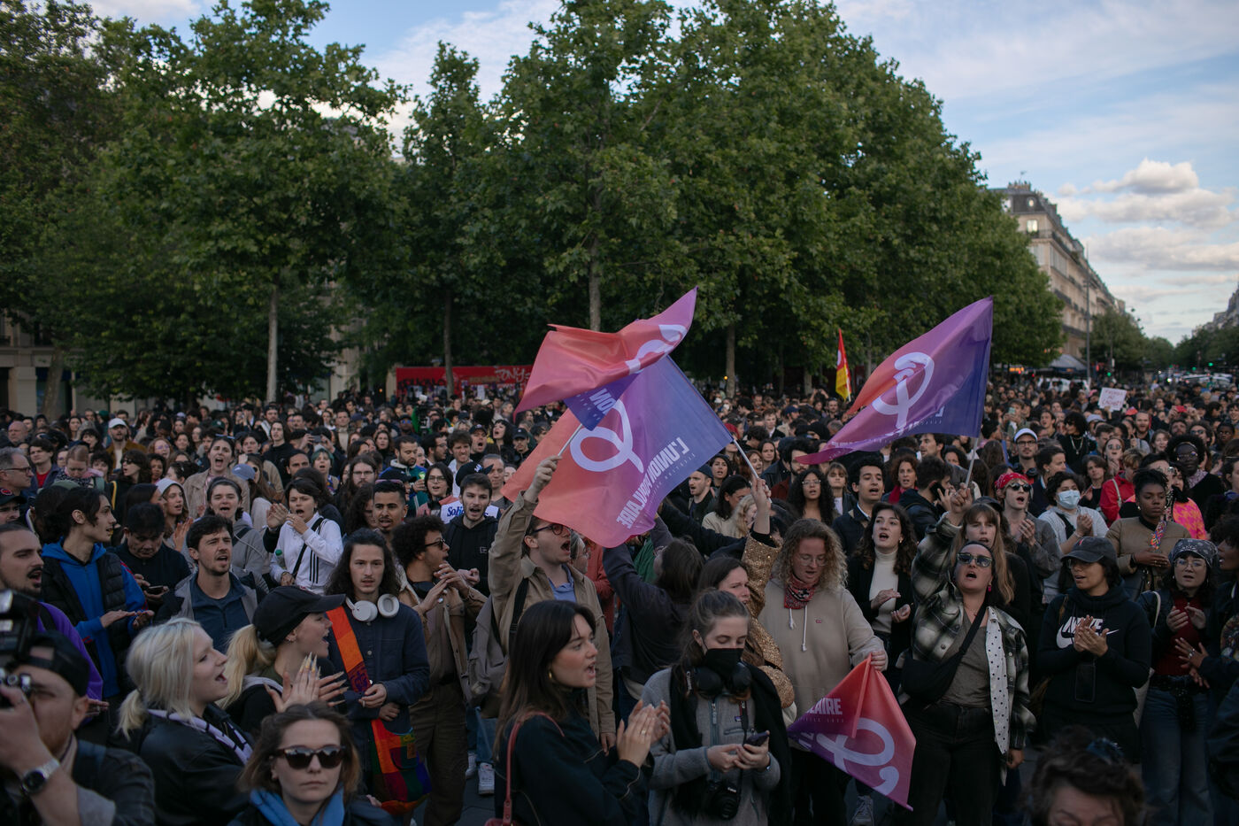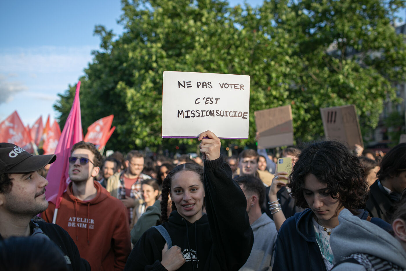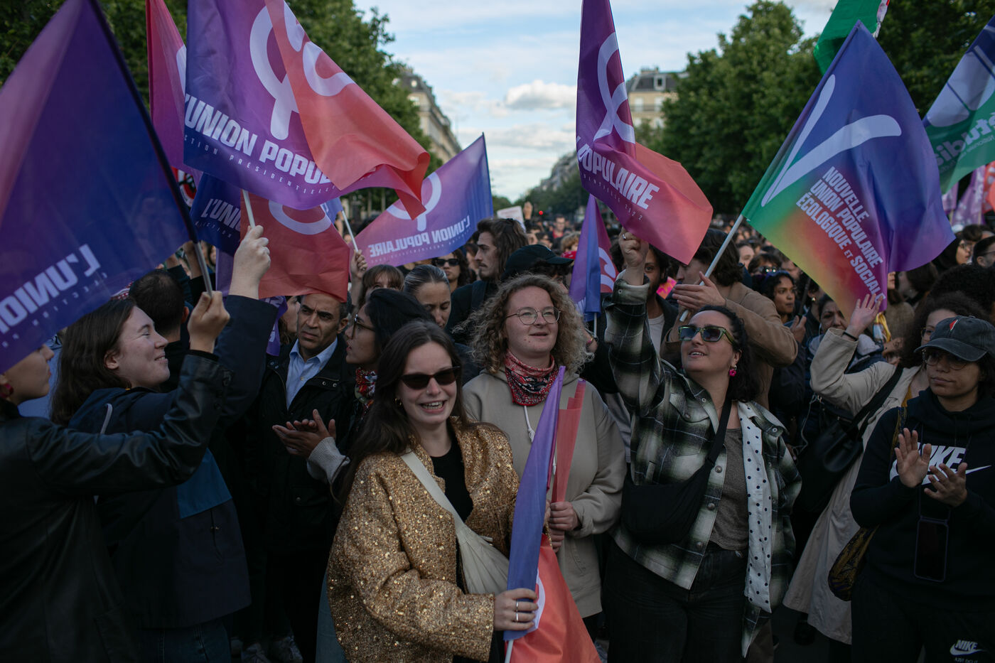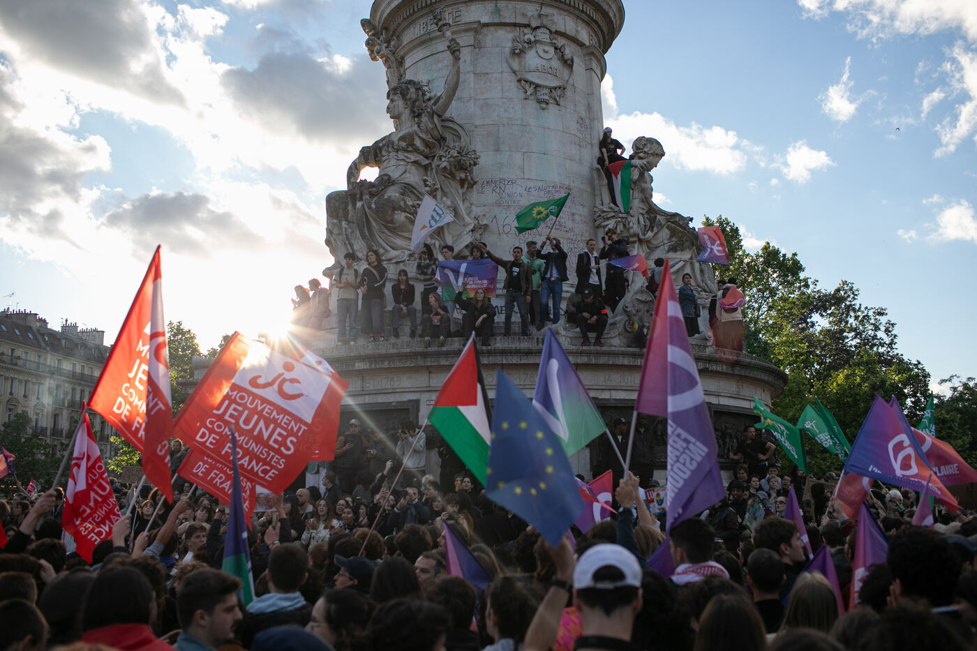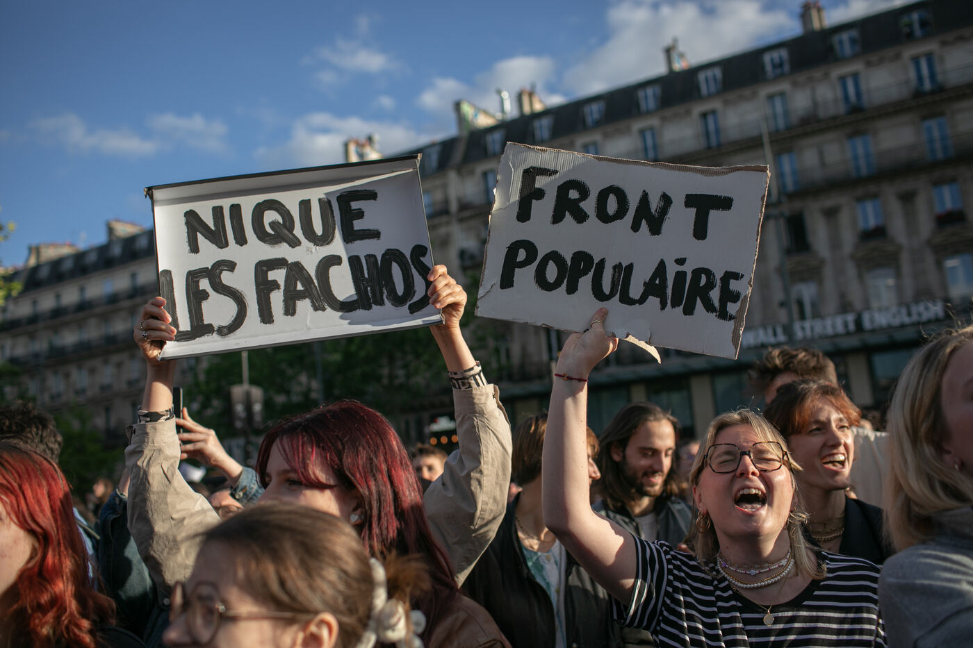 FRANCE, Paris, June 10, 2024, rally against the extreme right and for a popular front in Paris, France, June 10, 2024. Hundreds of demonstrators gathered after the result of the vote gave the extreme right wing party, Rassemblement National, victory over the other lists with 30 seats in the European Parliament.