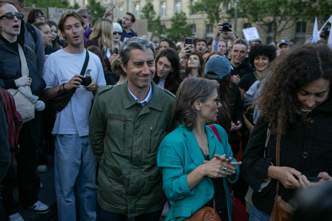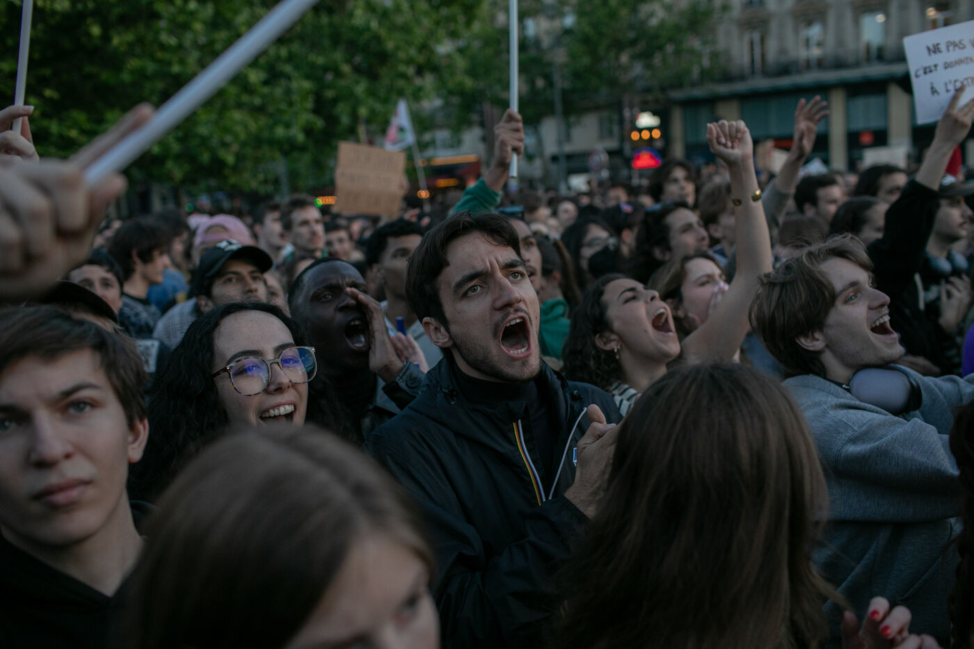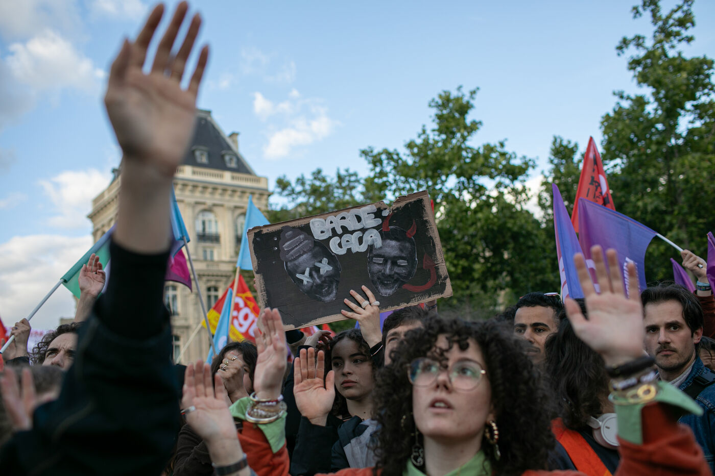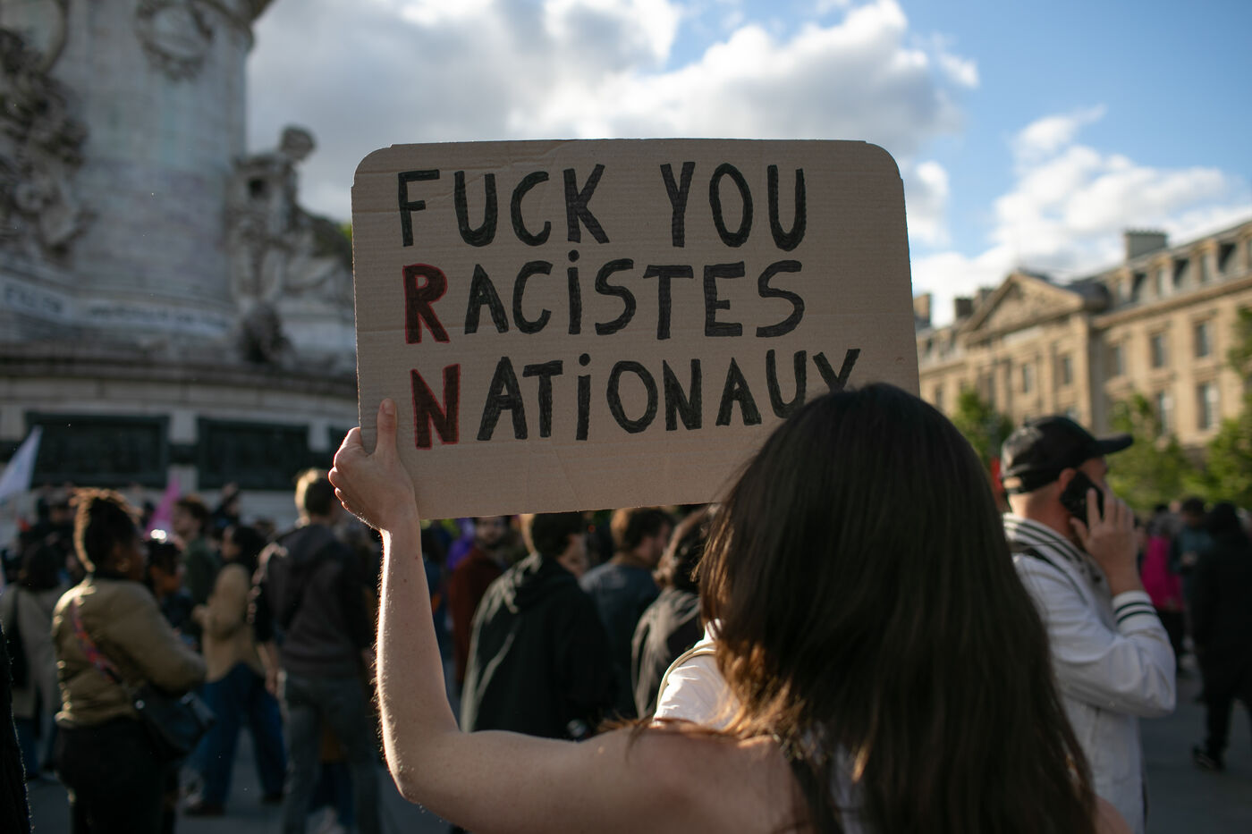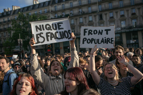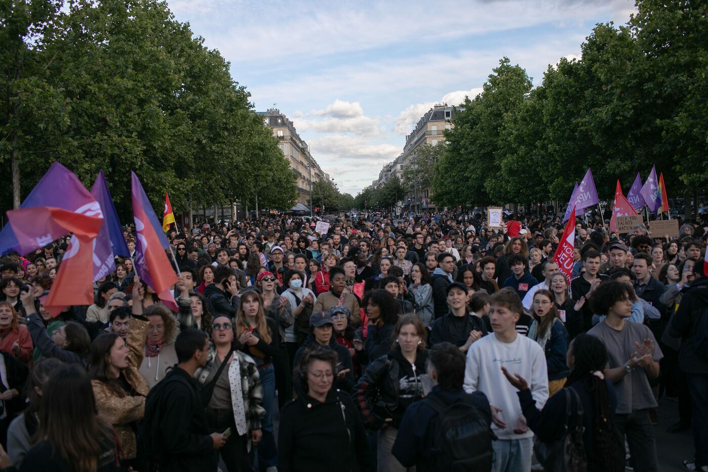 FRANCE, Paris, June 10, 2024, rally against the extreme right and for a popular front in Paris, France, June 10, 2024. Hundreds of demonstrators gathered after the result of the vote gave the extreme right wing party, Rassemblement National, victory over the other lists with 30 seats in the European Parliament.