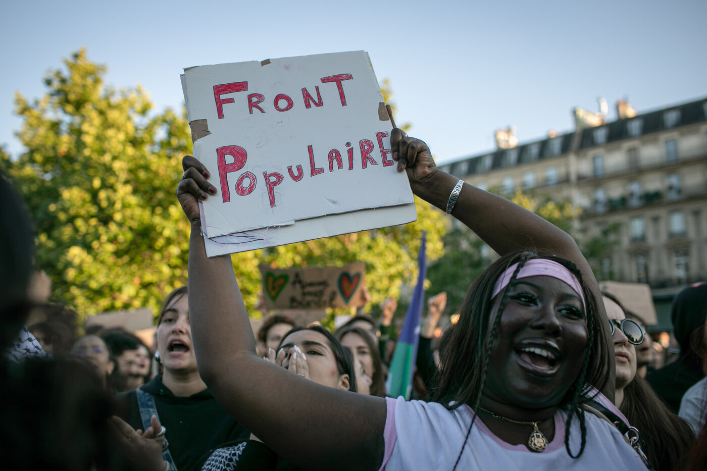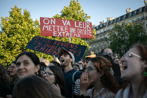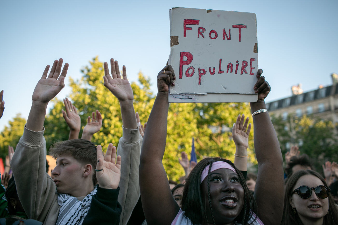 FRANCE, Paris, 11 juin 2024, rassemblement contre l'extrême droite. Troisième journée de manifestation sur la place de la Républiques a l'appel des organisations de jeunesse contre l?extrême droite et en soutien de la union de la gauche dans un nouvel Front Populaire.