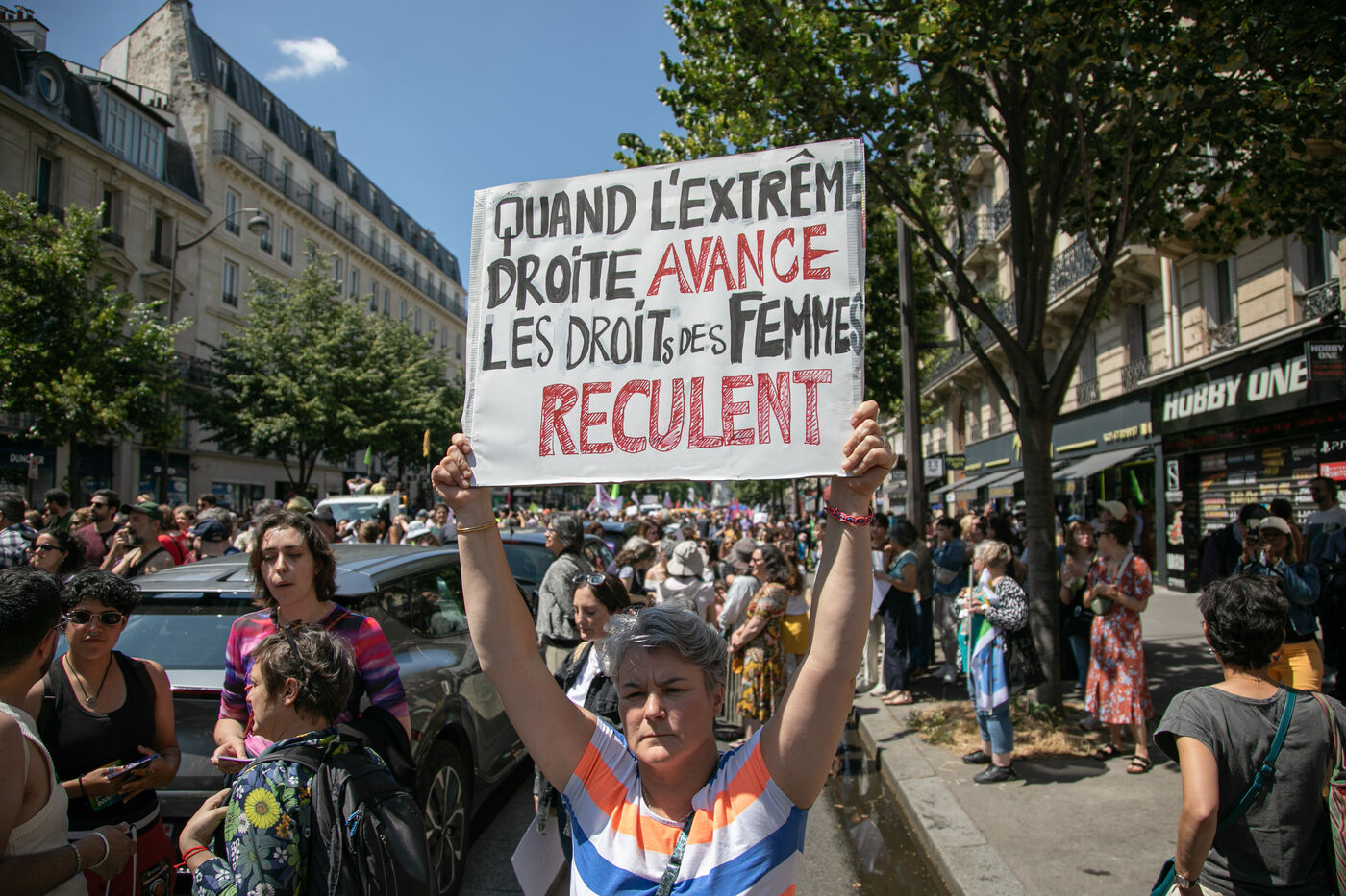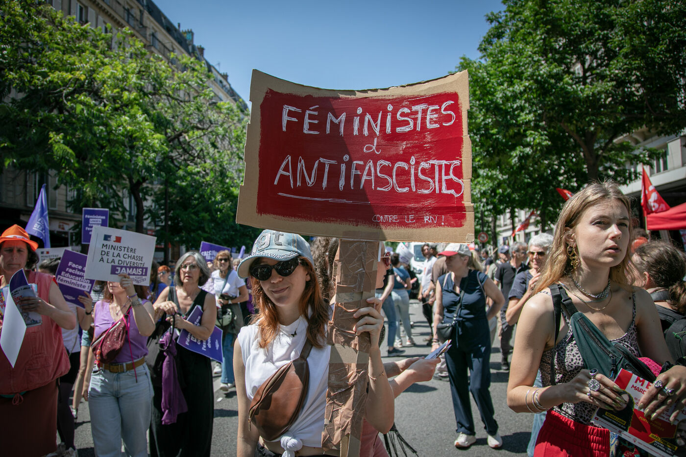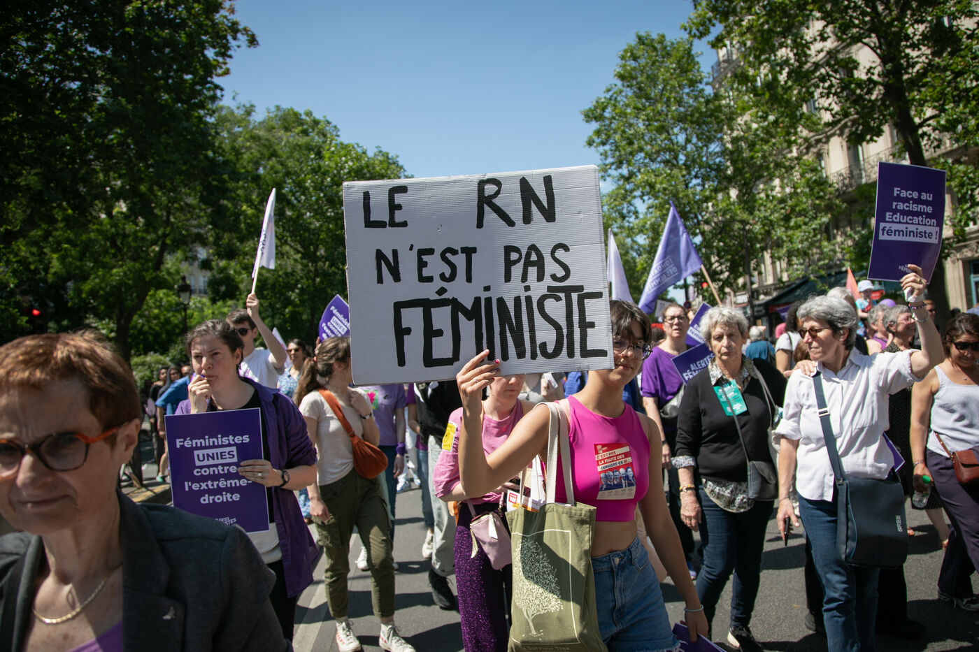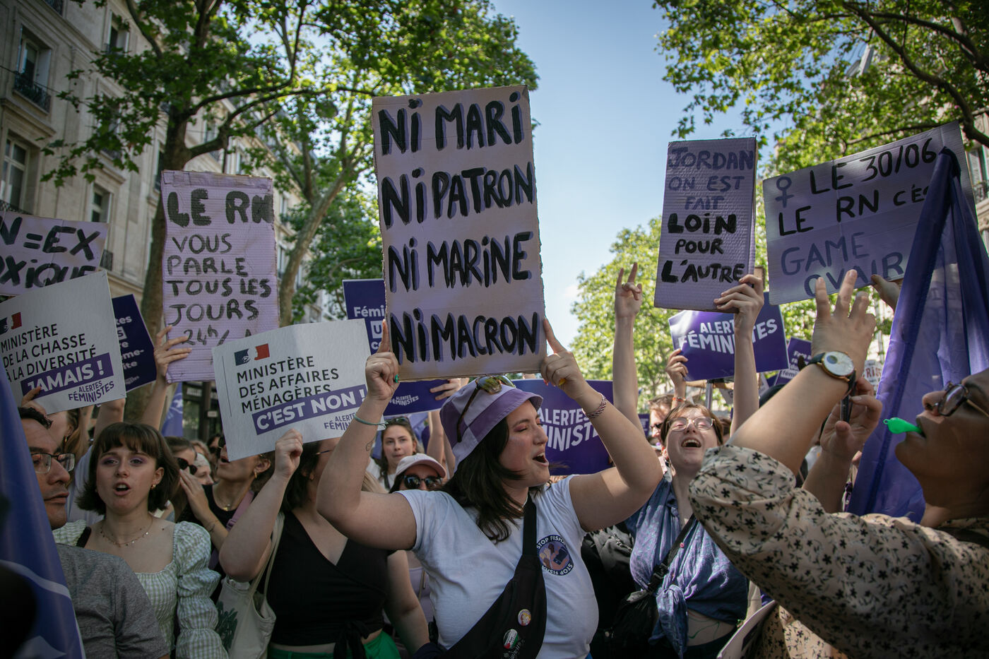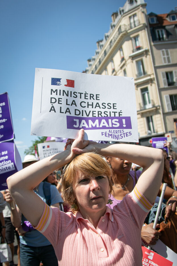 FRANCE, Paris 23 juin 2024, manifestation féministe contre l'extrême droite. Plusieurs associations, d'ONG et de syndicats ont défilé dans les rues de la capitale pour dénoncer le "féminisme de façade" utilisé par l'extrême droite. Photographie par Victoria Valdivia Trigo / Hans Lucas.