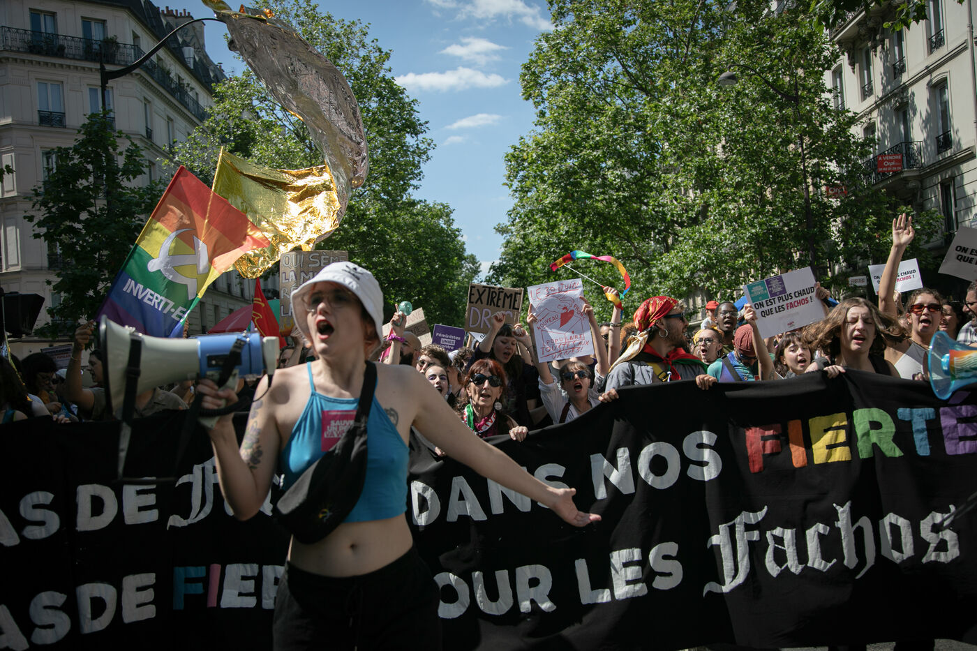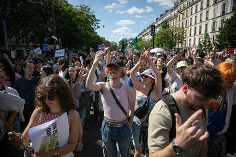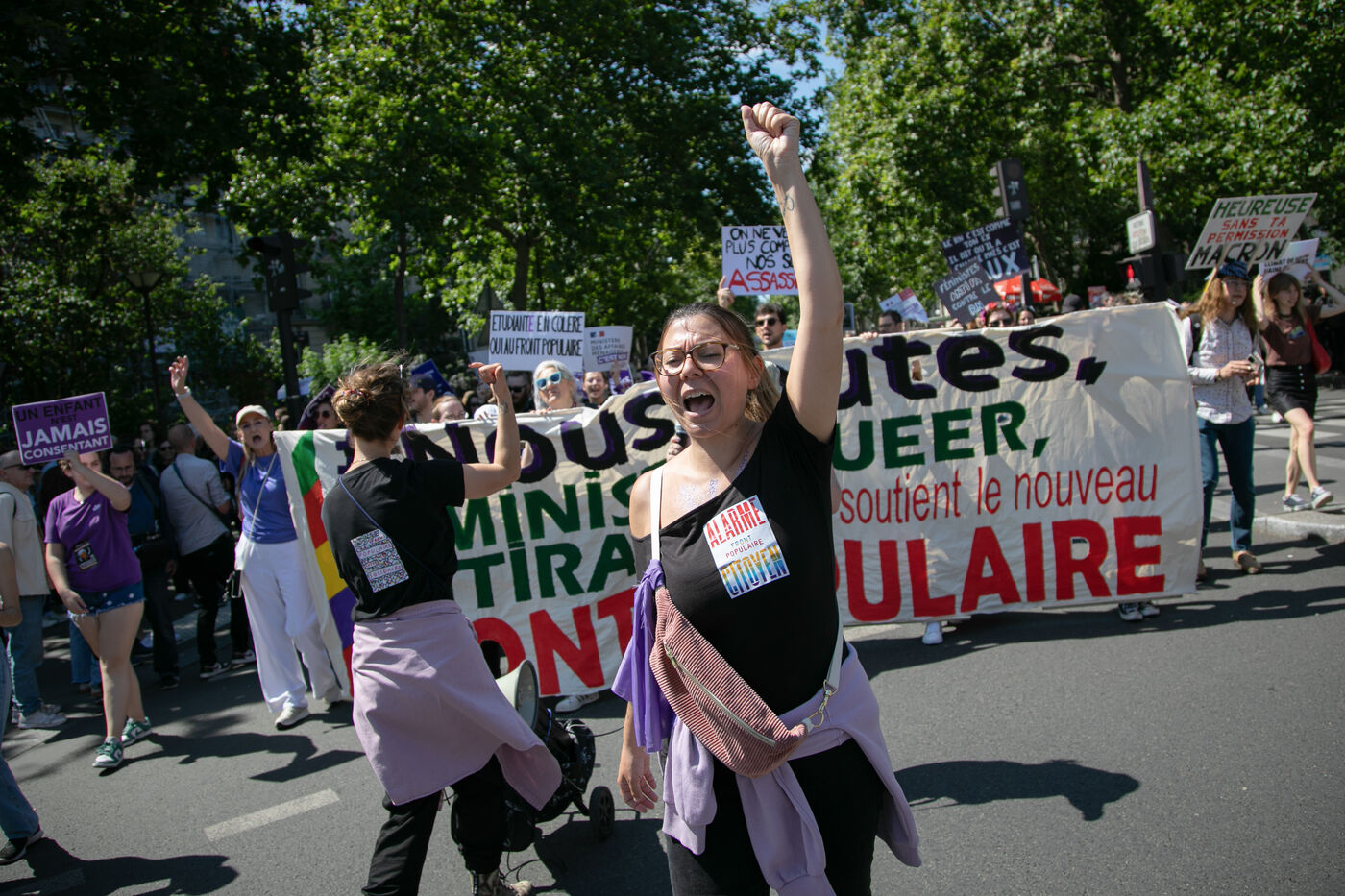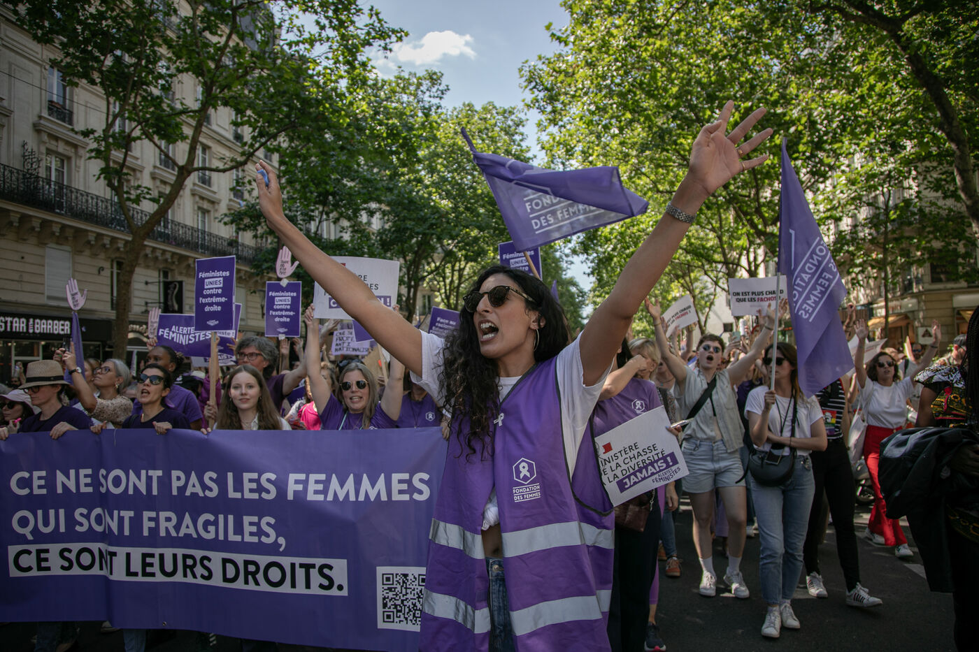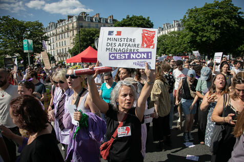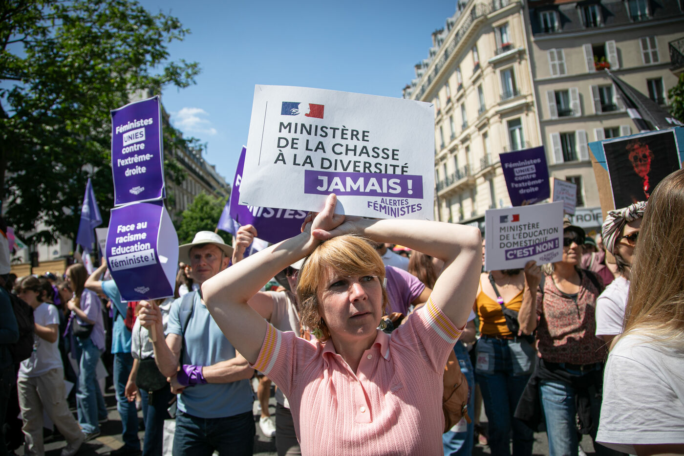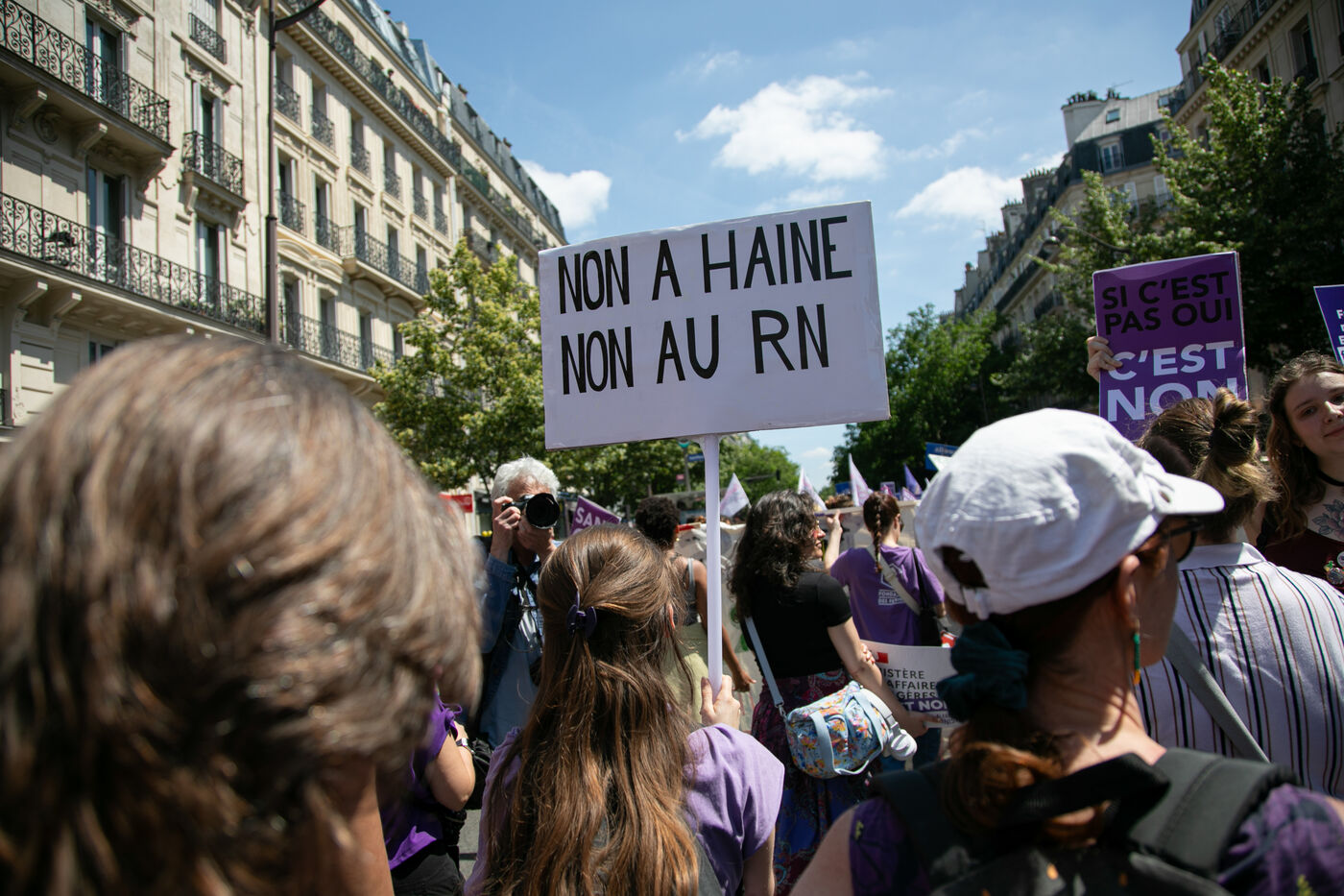 FRANCE, Paris 23 juin 2024, manifestation féministe contre l'extrême droite. Plusieurs associations, d'ONG et de syndicats ont défilé dans les rues de la capitale pour dénoncer le "féminisme de façade" utilisé par l'extrême droite. Photographie par Victoria Valdivia Trigo / Hans Lucas.