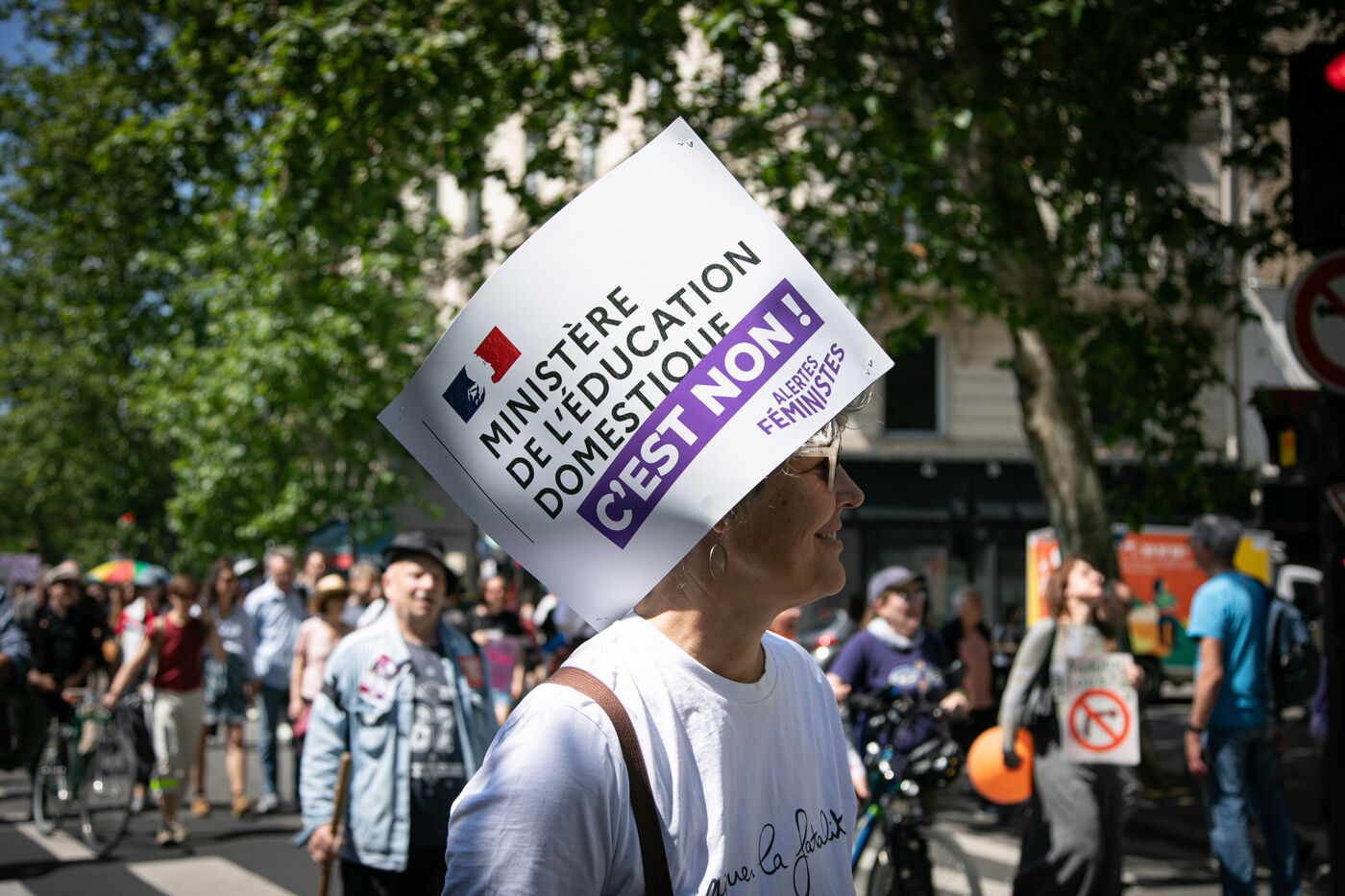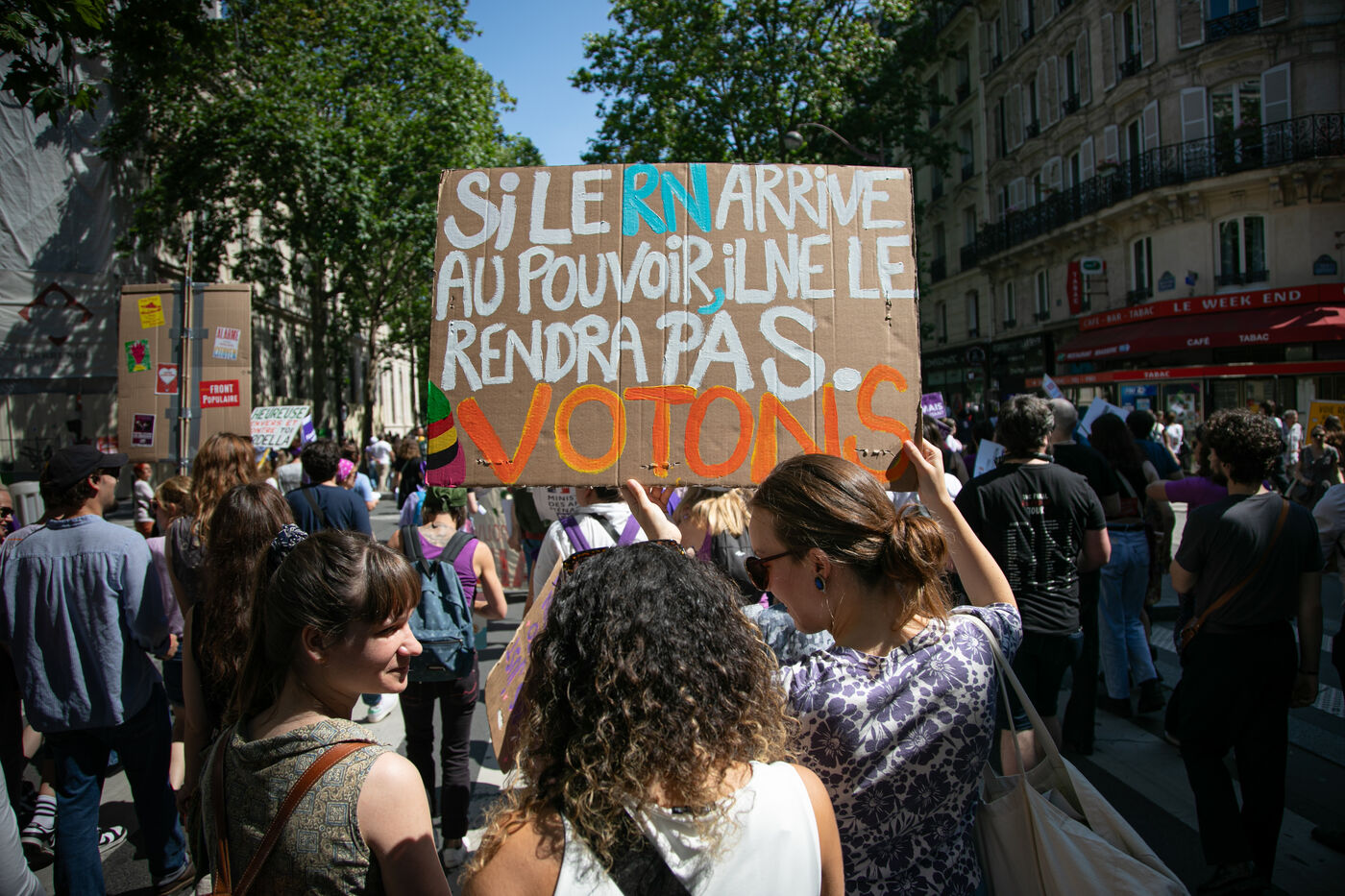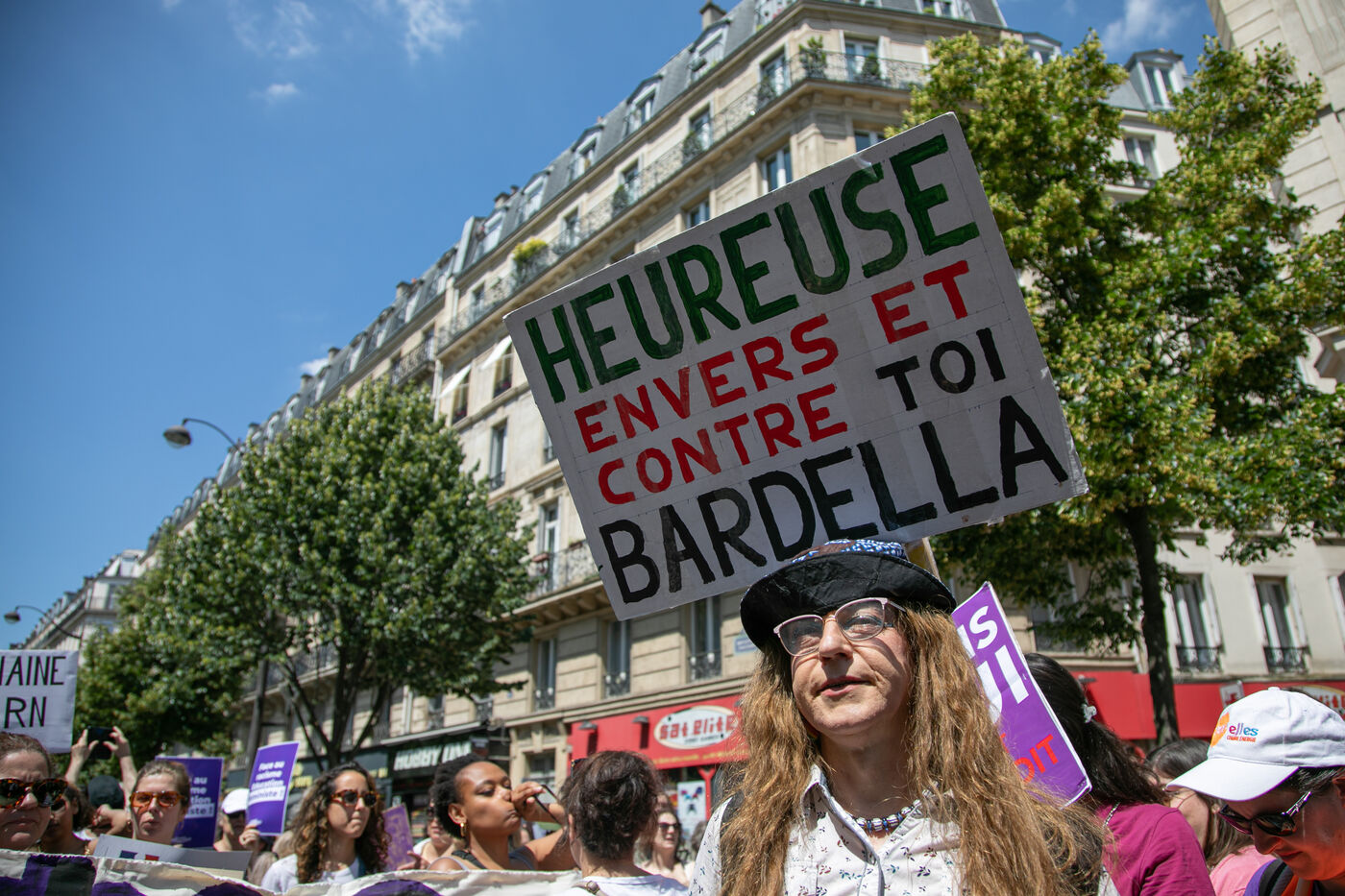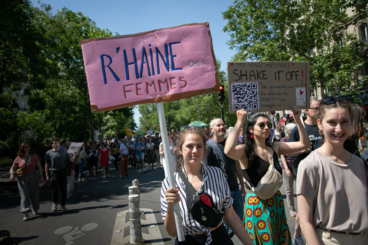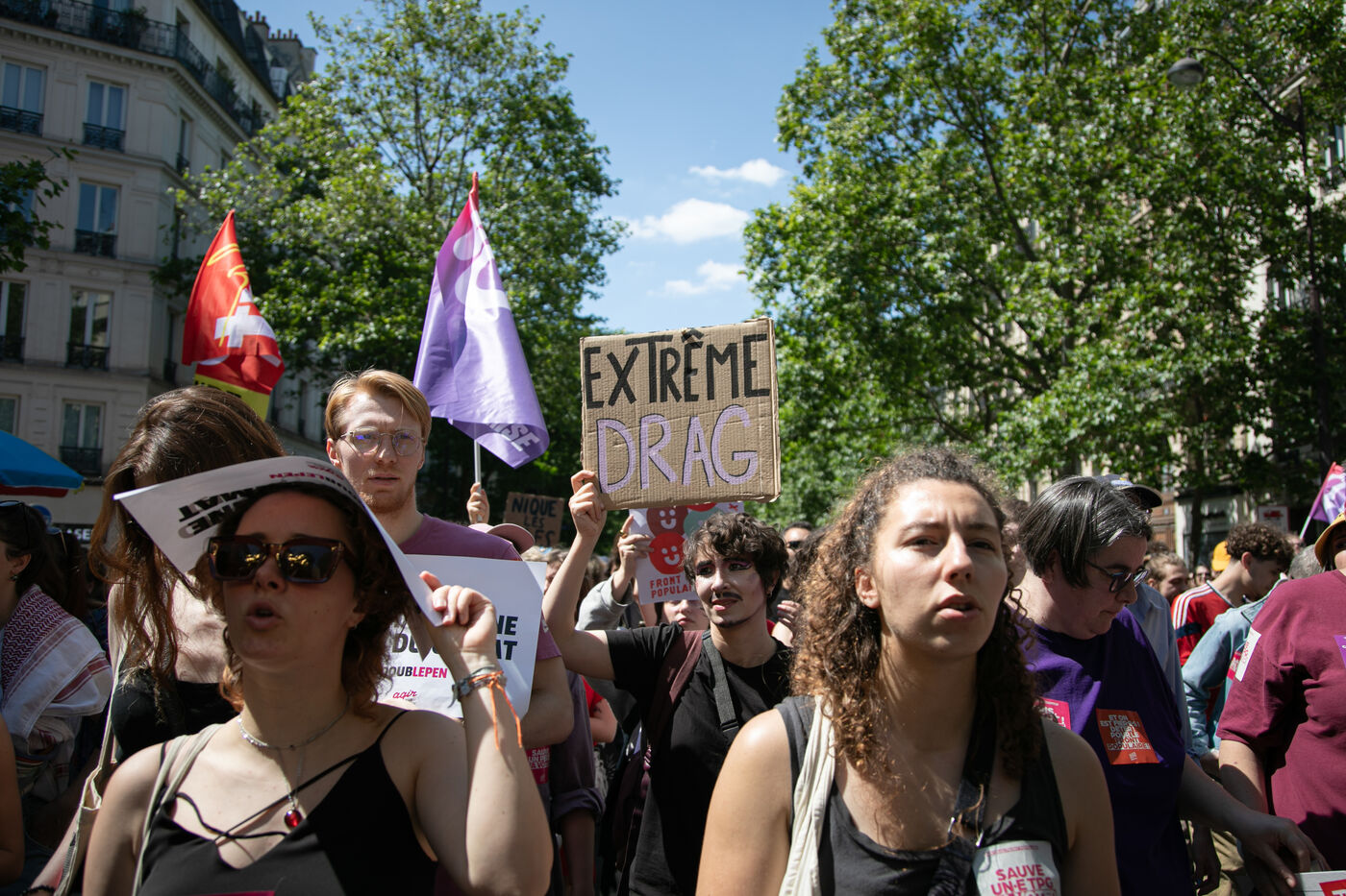 FRANCE, Paris 23 juin 2024, manifestation féministe contre l'extrême droite. Plusieurs associations, d'ONG et de syndicats ont défilé dans les rues de la capitale pour dénoncer le "féminisme de façade" utilisé par l'extrême droite. Photographie par Victoria Valdivia Trigo / Hans Lucas.