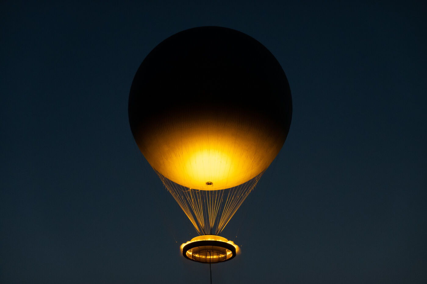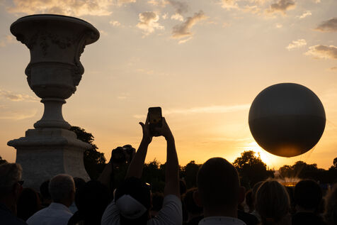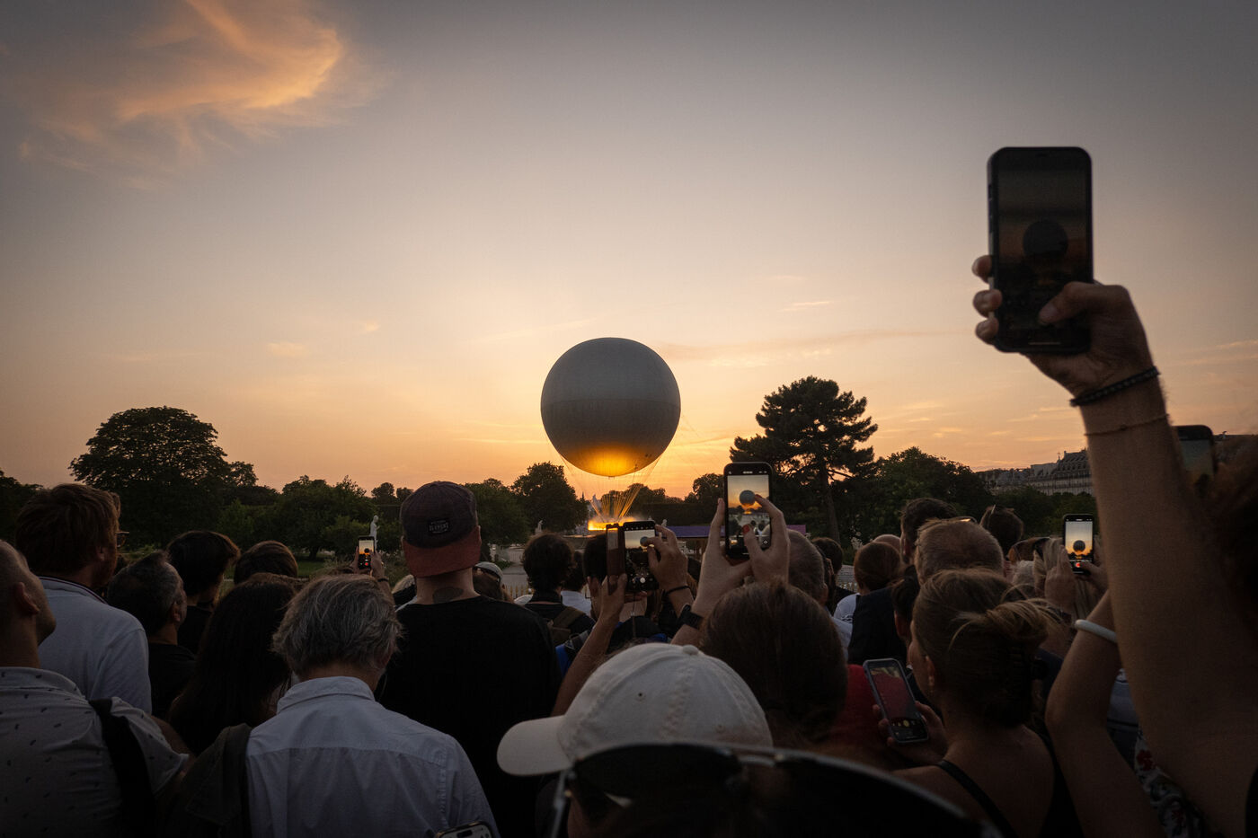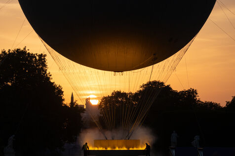 FRANCE, Paris, July 29, 2024, View of the hot-air balloon with the Olympic cauldron from the Tuileries Gardens. Photography by Victoria Valdivia Trigo / Hans Lucas.