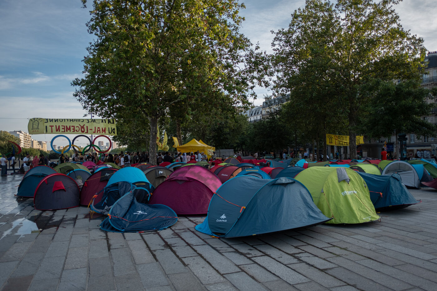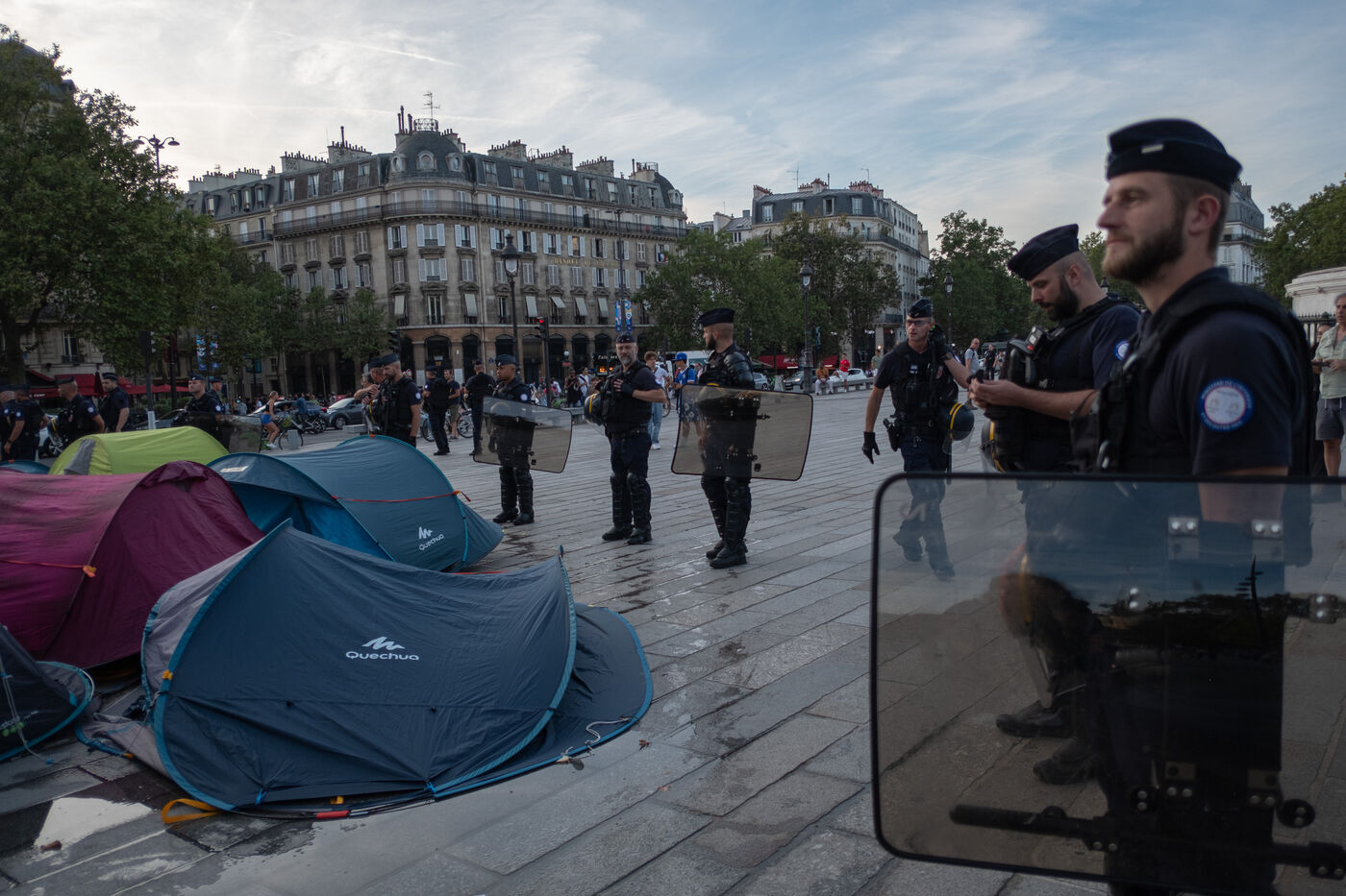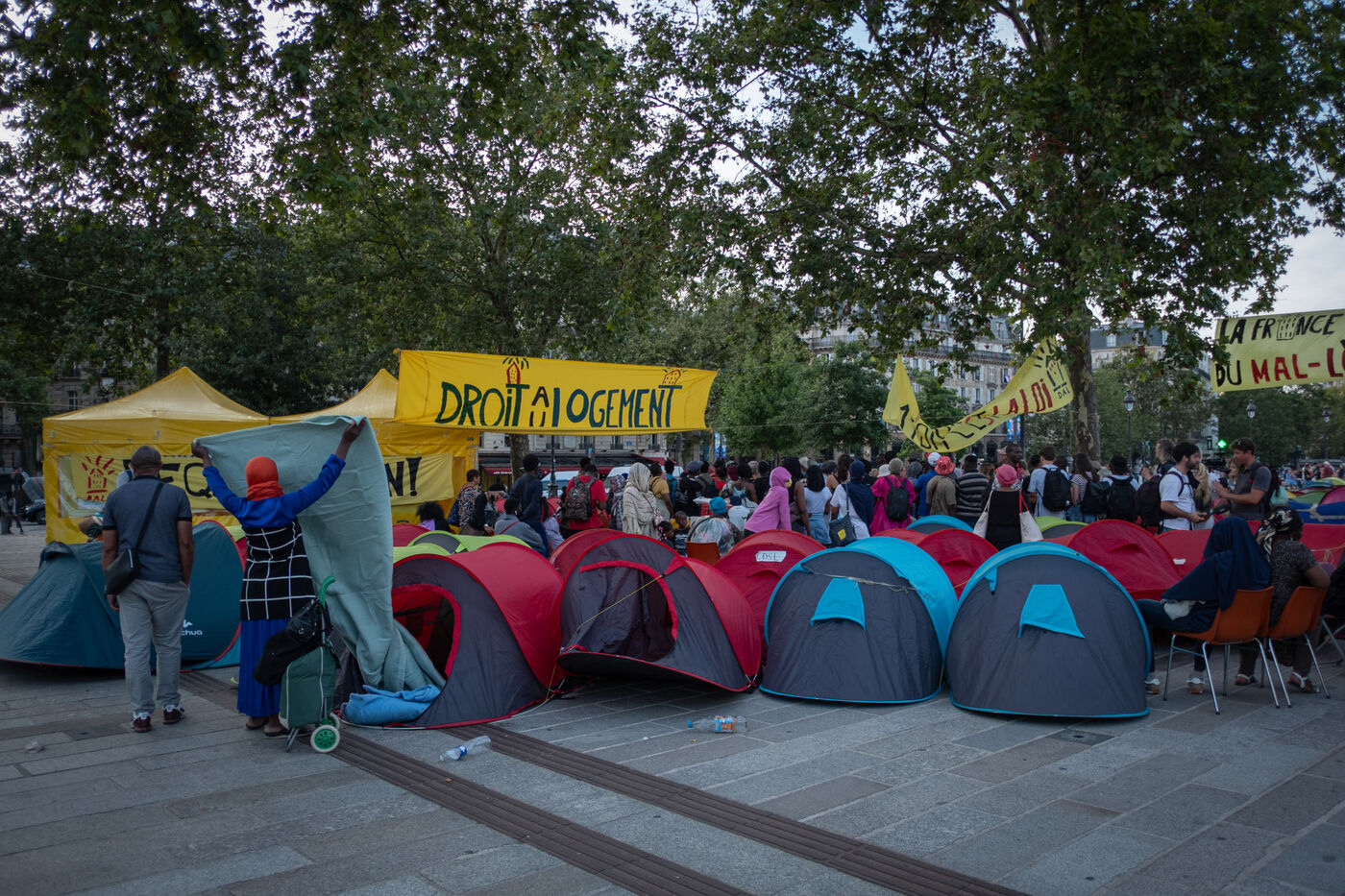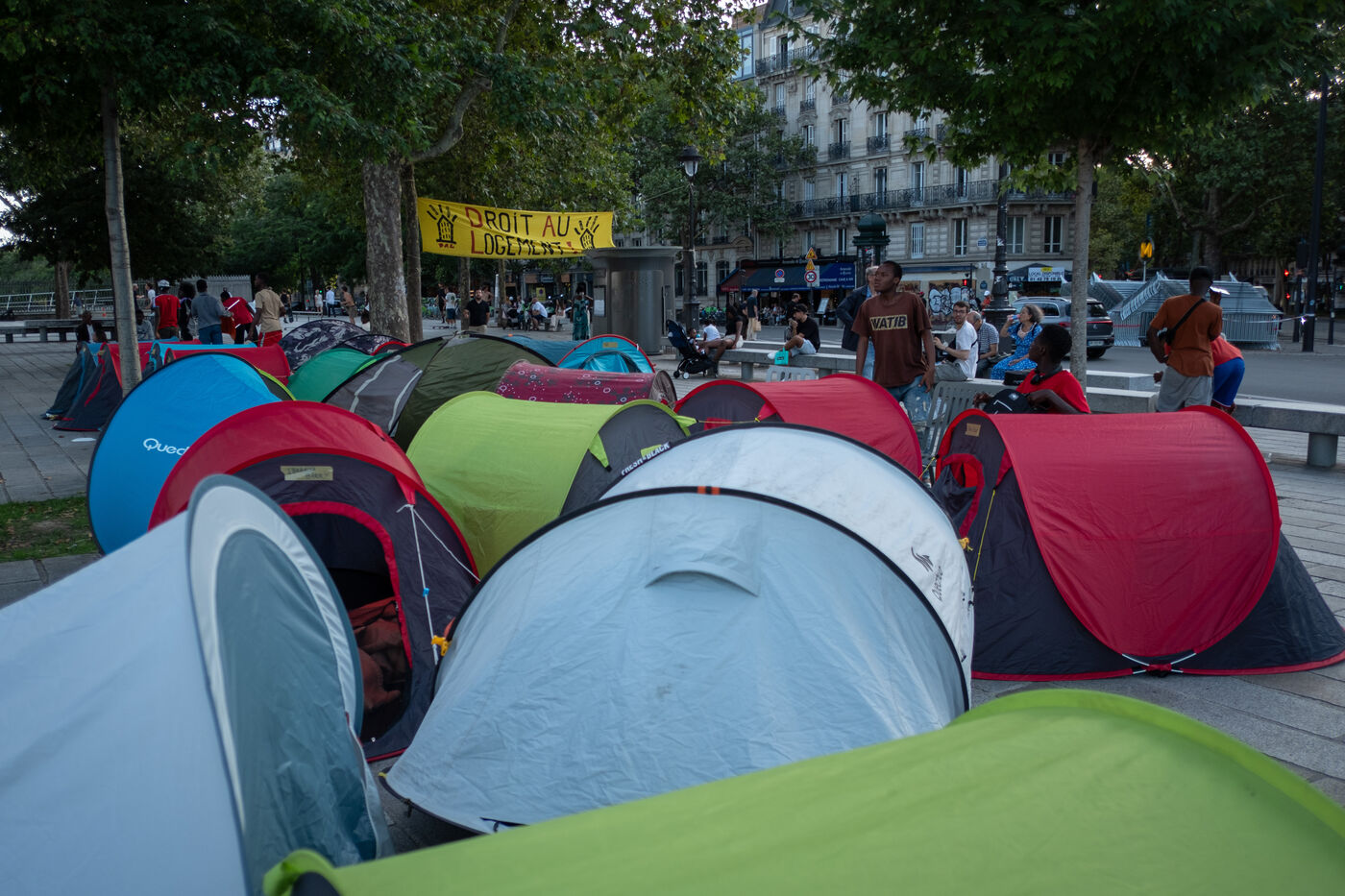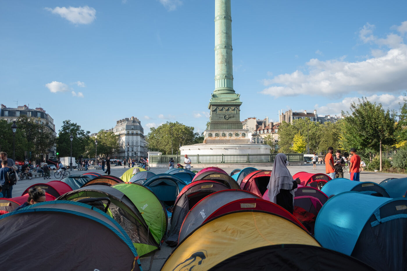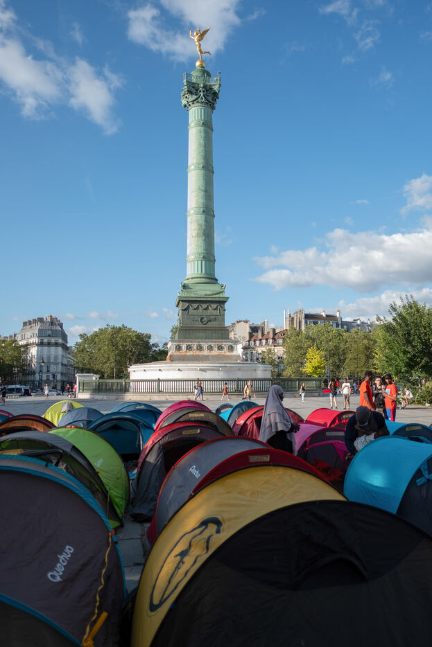 FRANCE, Paris 06 août 2024, installation d?un campement à Bastille, organise par les associations Droit au logement DAL et Utopia 56, pour demander l?hébergement des personnes sans-abri. Photographie par Victoria Valdivia Trigo / Hans Lucas.