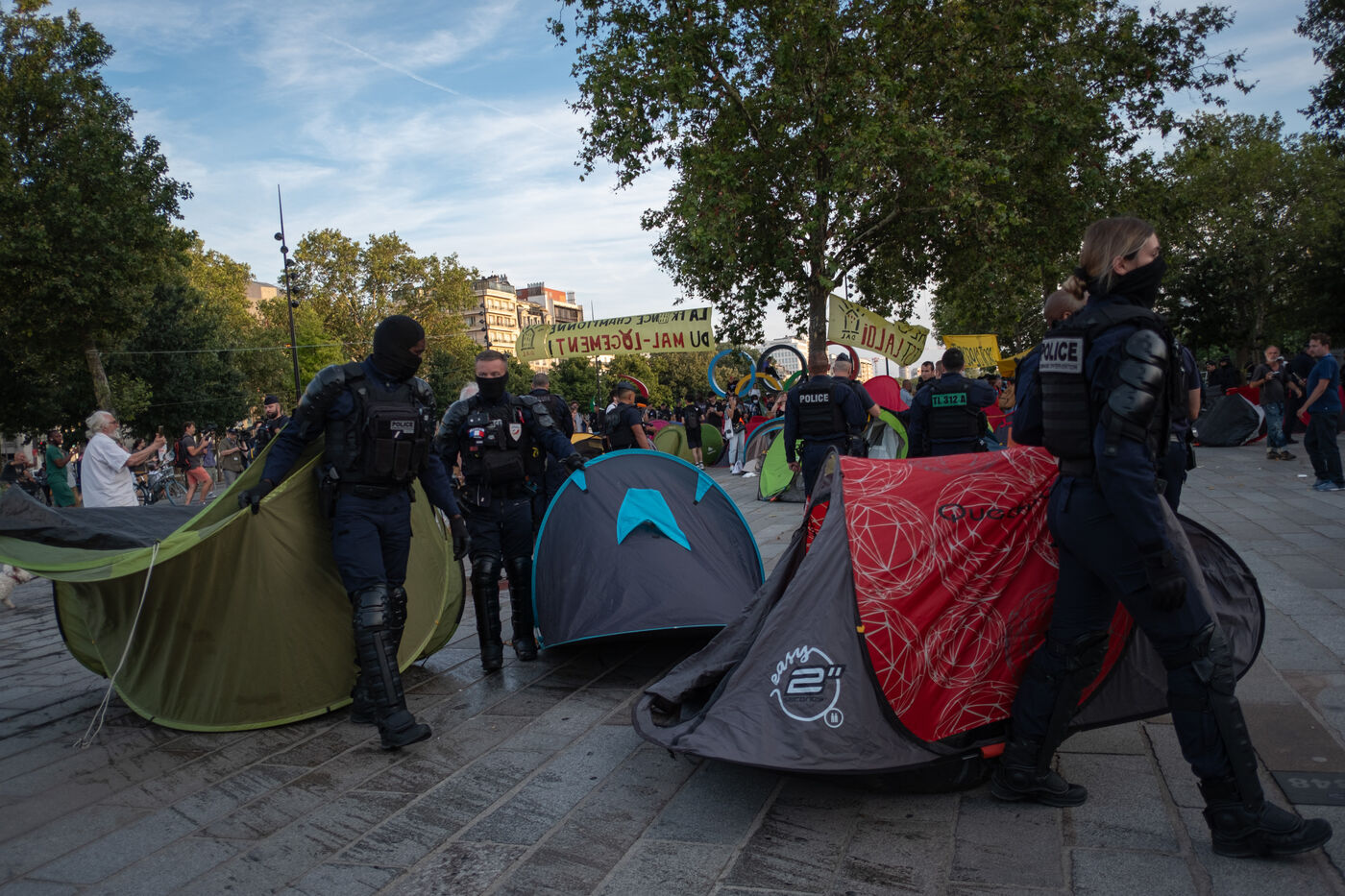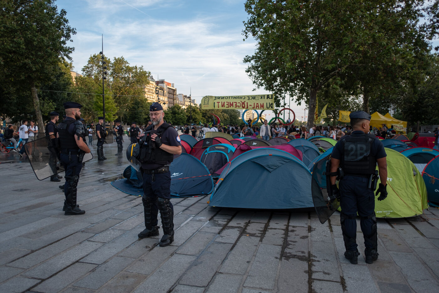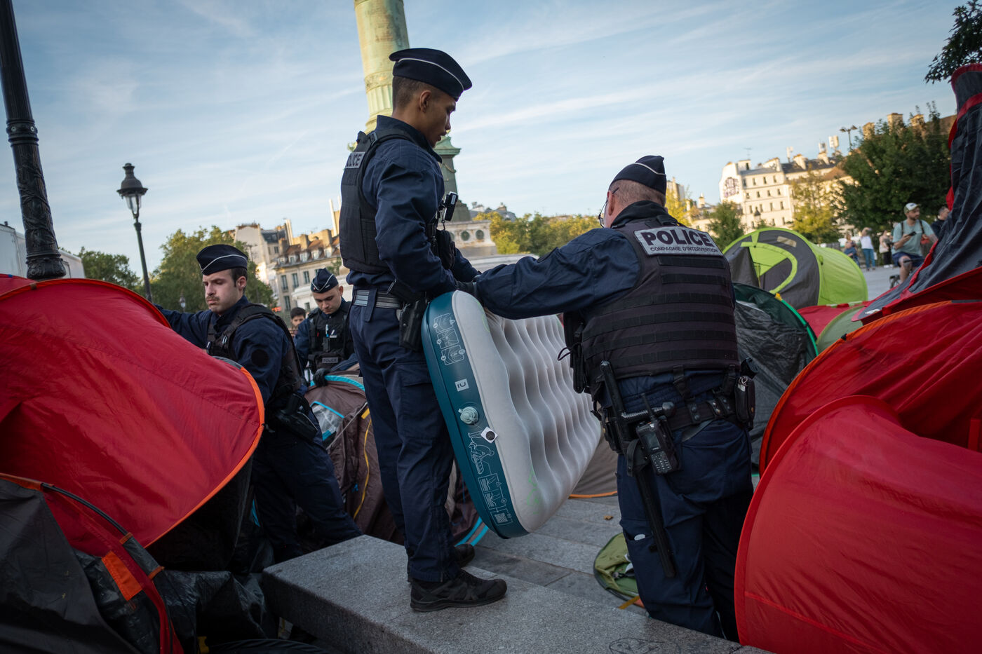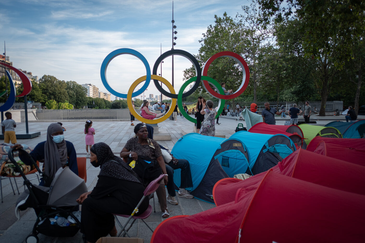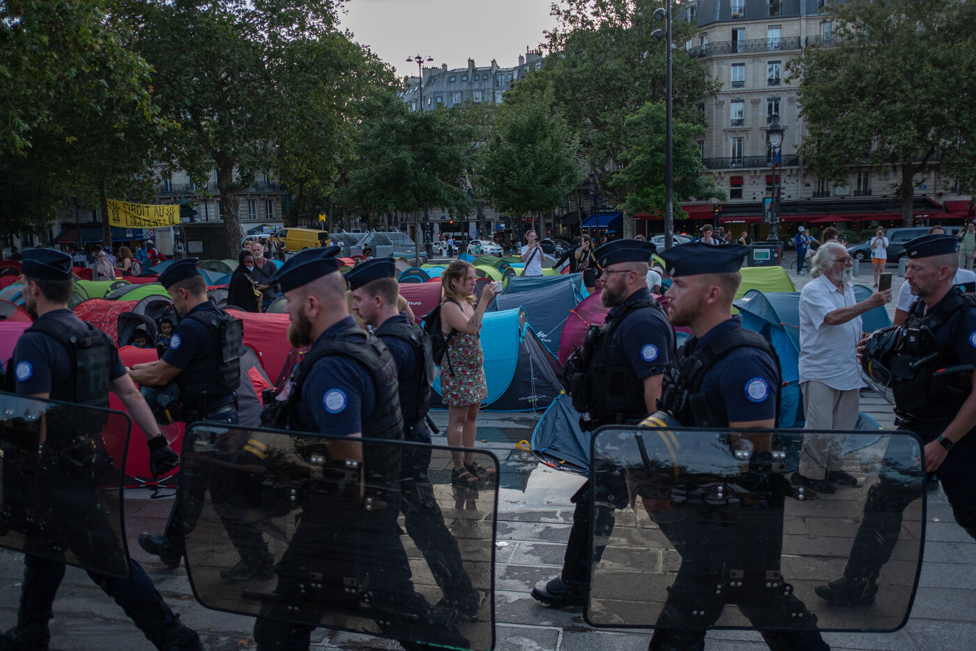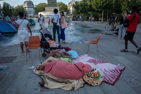 FRANCE, Paris 06 août 2024, installation d?un campement à Bastille, organise par les associations Droit au logement DAL et Utopia 56, pour demander l?hébergement des personnes sans-abri. Photographie par Victoria Valdivia Trigo / Hans Lucas.