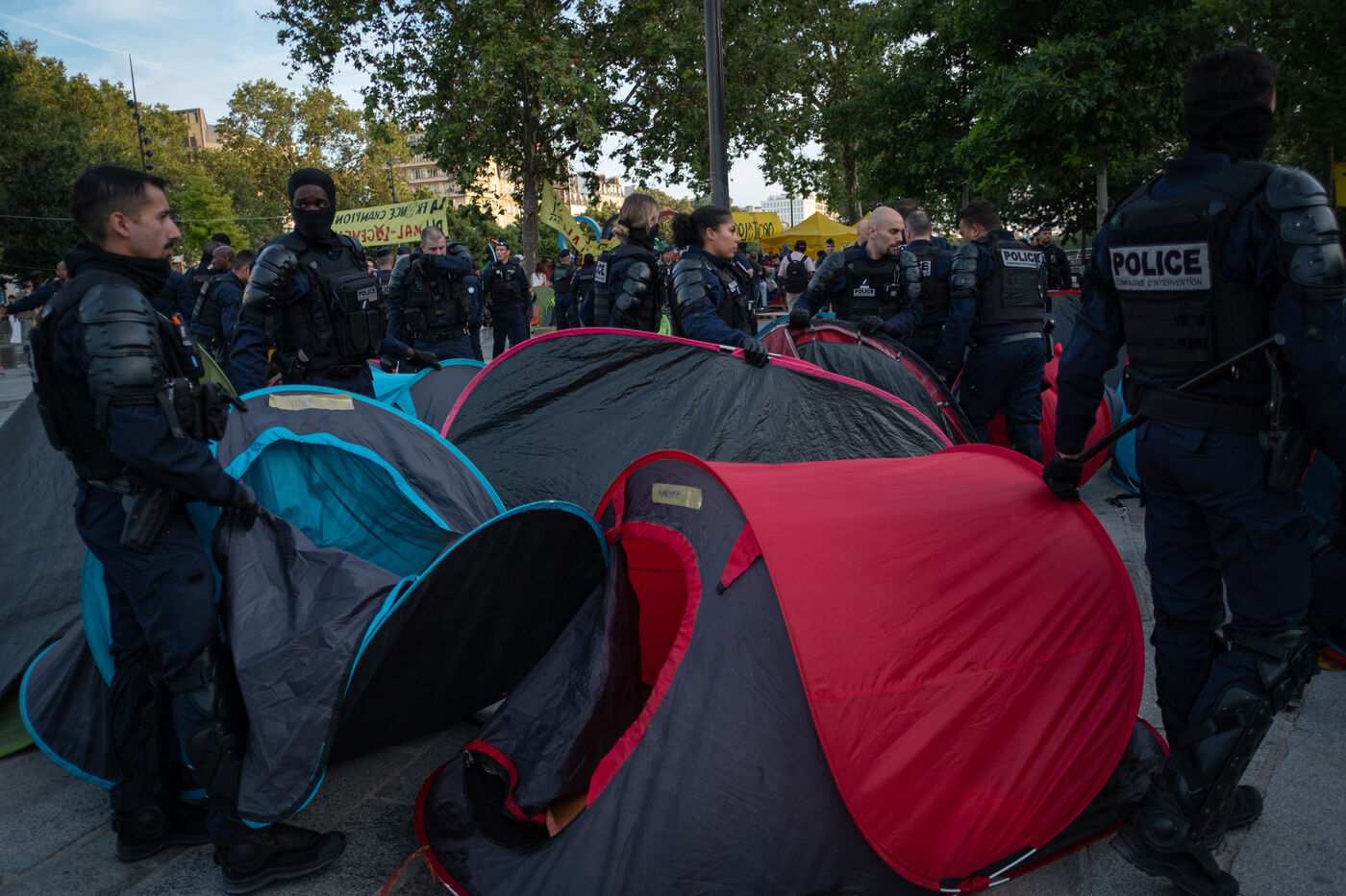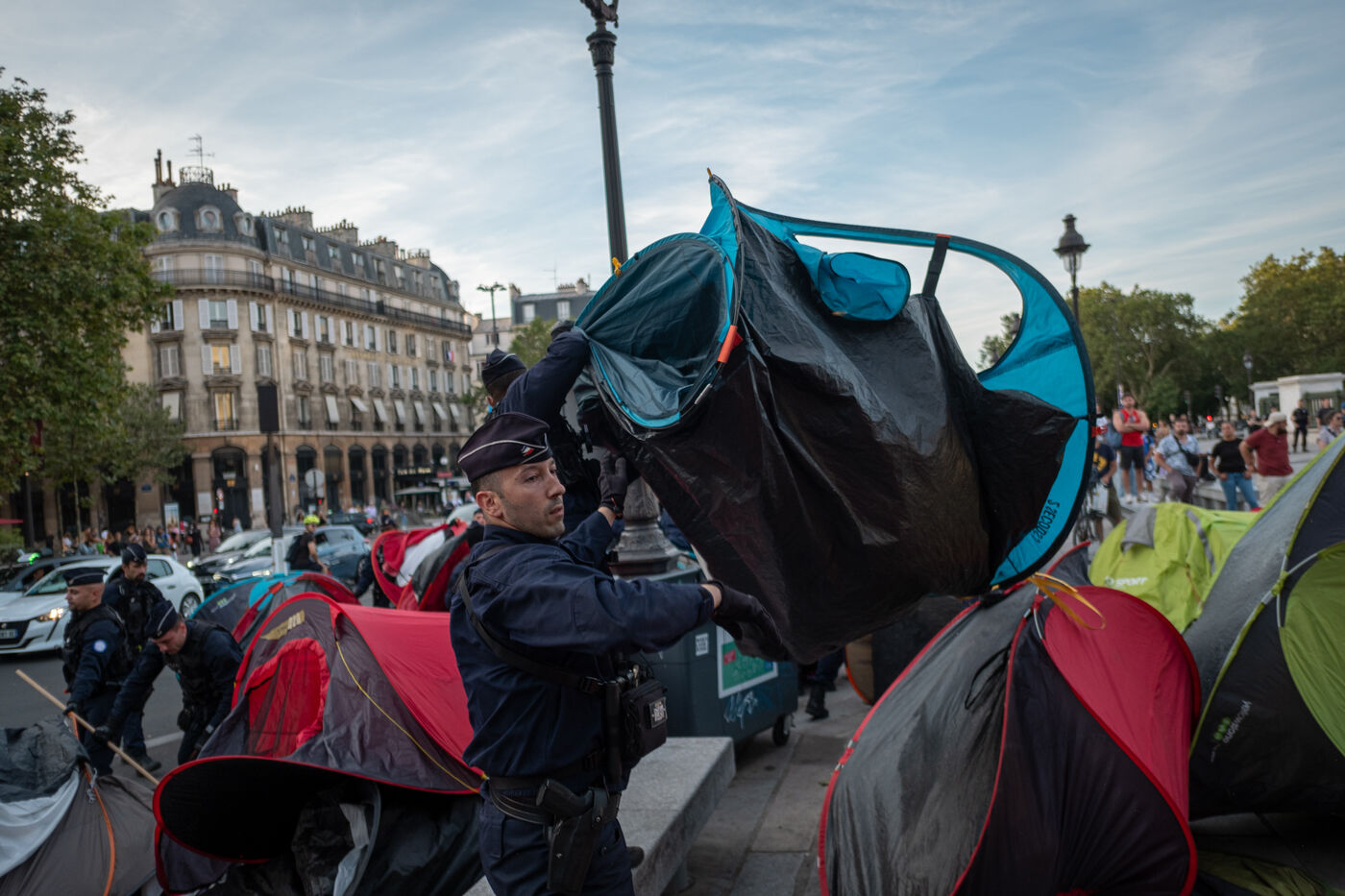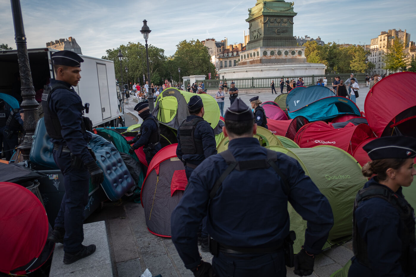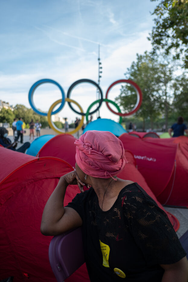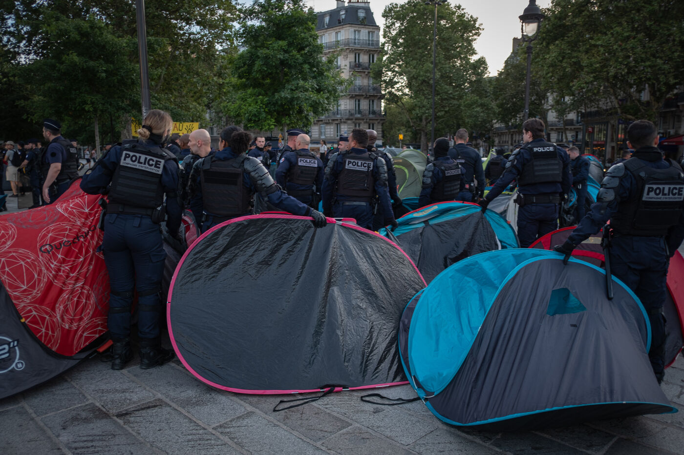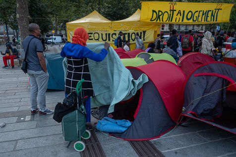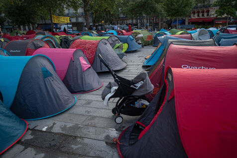 FRANCE, Paris 06 août 2024, installation d?un campement à Bastille, organise par les associations Droit au logement DAL et Utopia 56, pour demander l?hébergement des personnes sans-abri. Photographie par Victoria Valdivia Trigo / Hans Lucas.