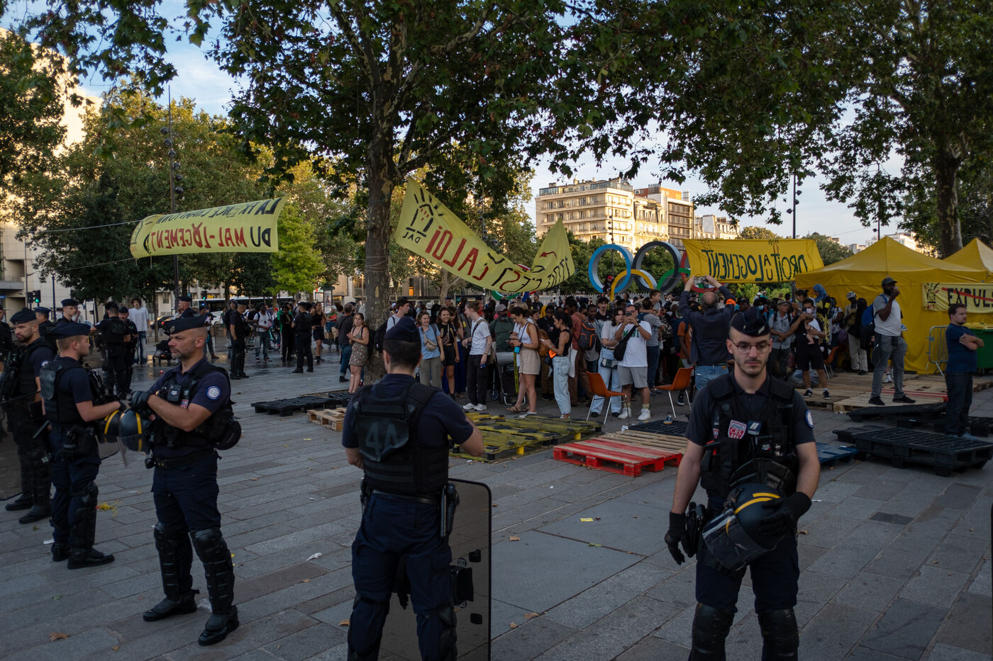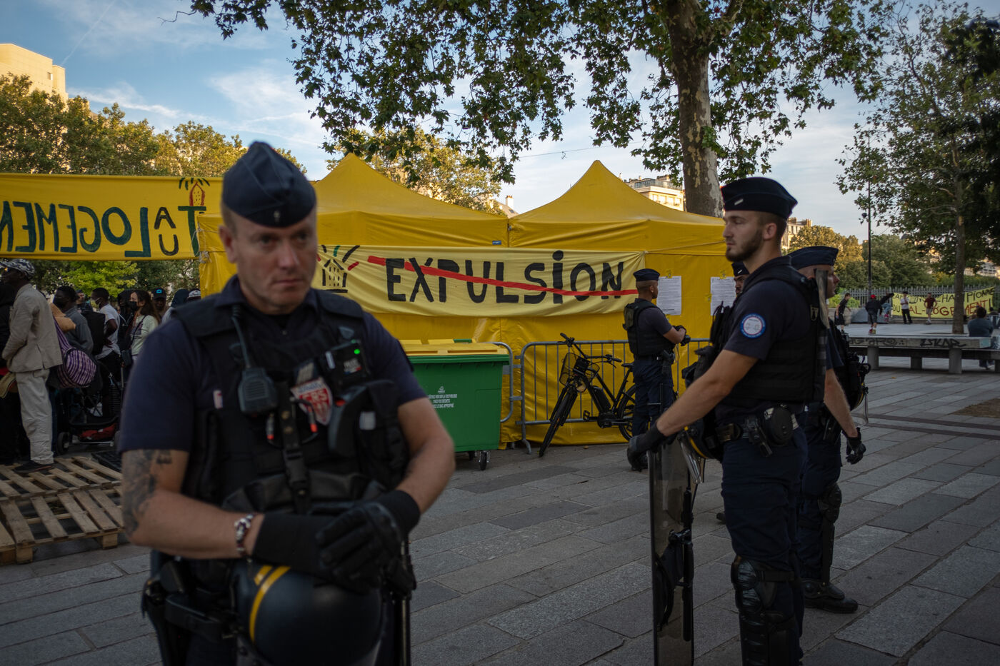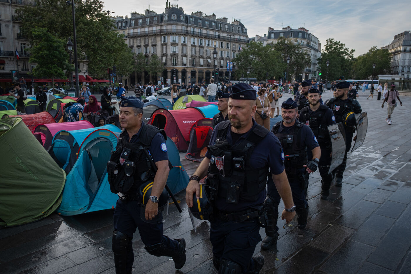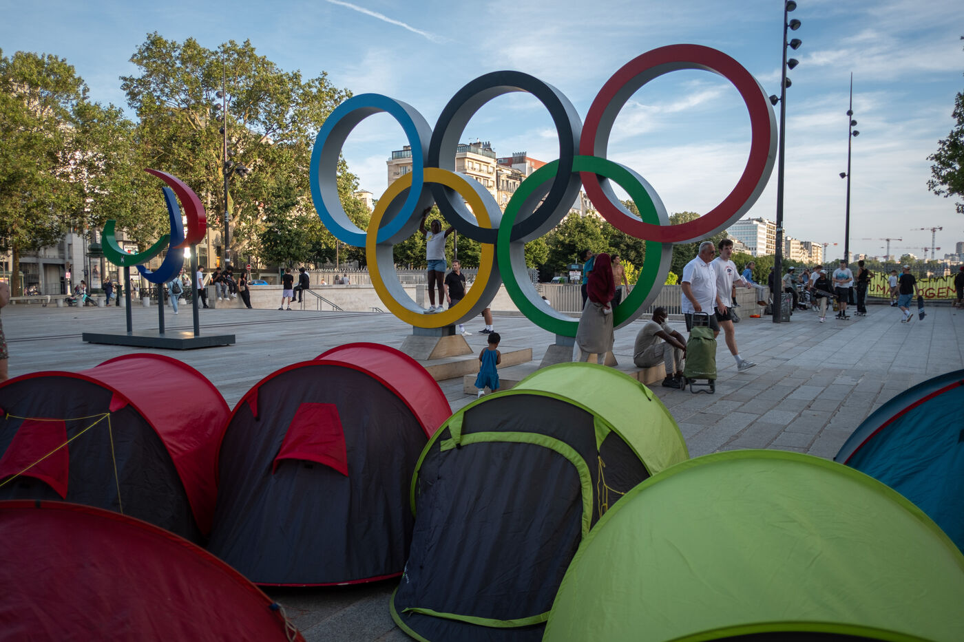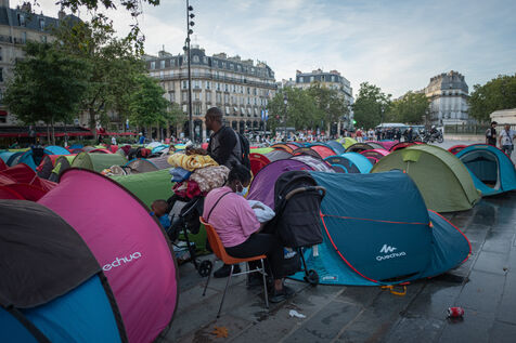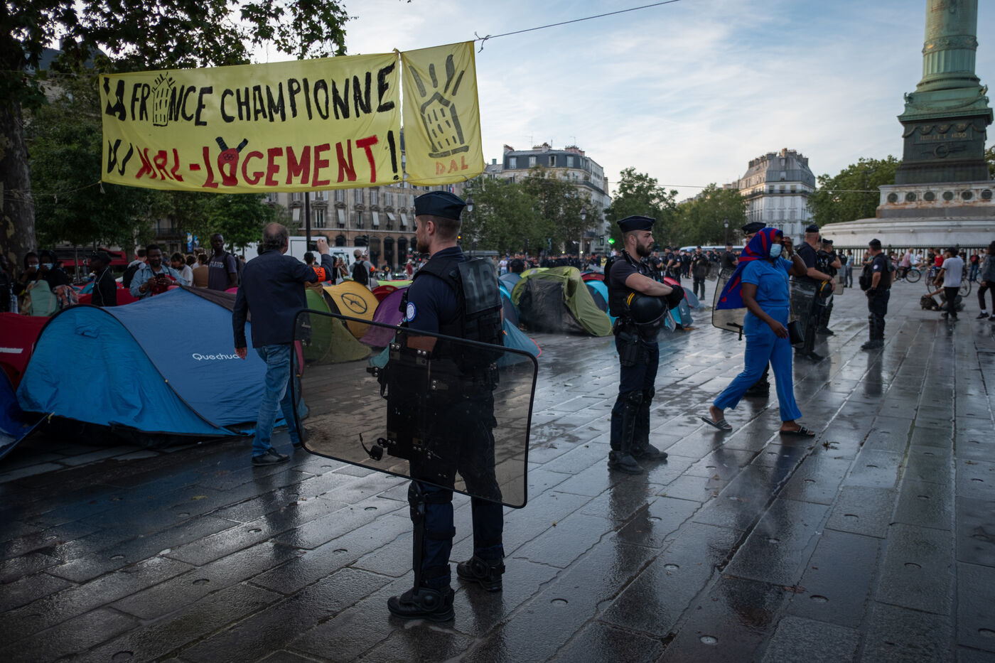 FRANCE, Paris 06 août 2024, installation d?un campement à Bastille, organise par les associations Droit au logement DAL et Utopia 56, pour demander l?hébergement des personnes sans-abri. Photographie par Victoria Valdivia Trigo / Hans Lucas.