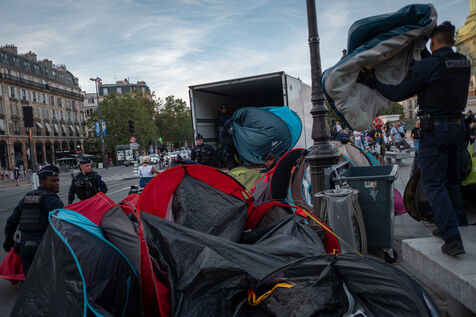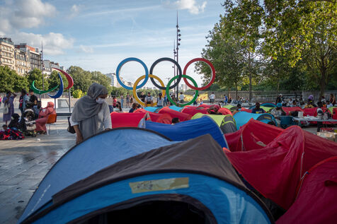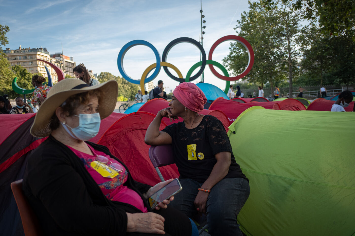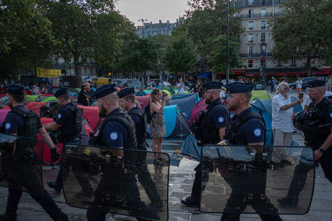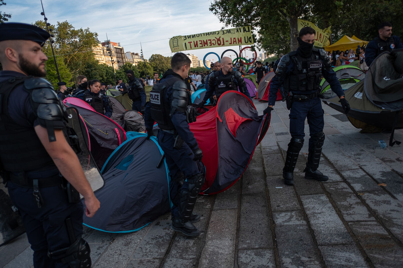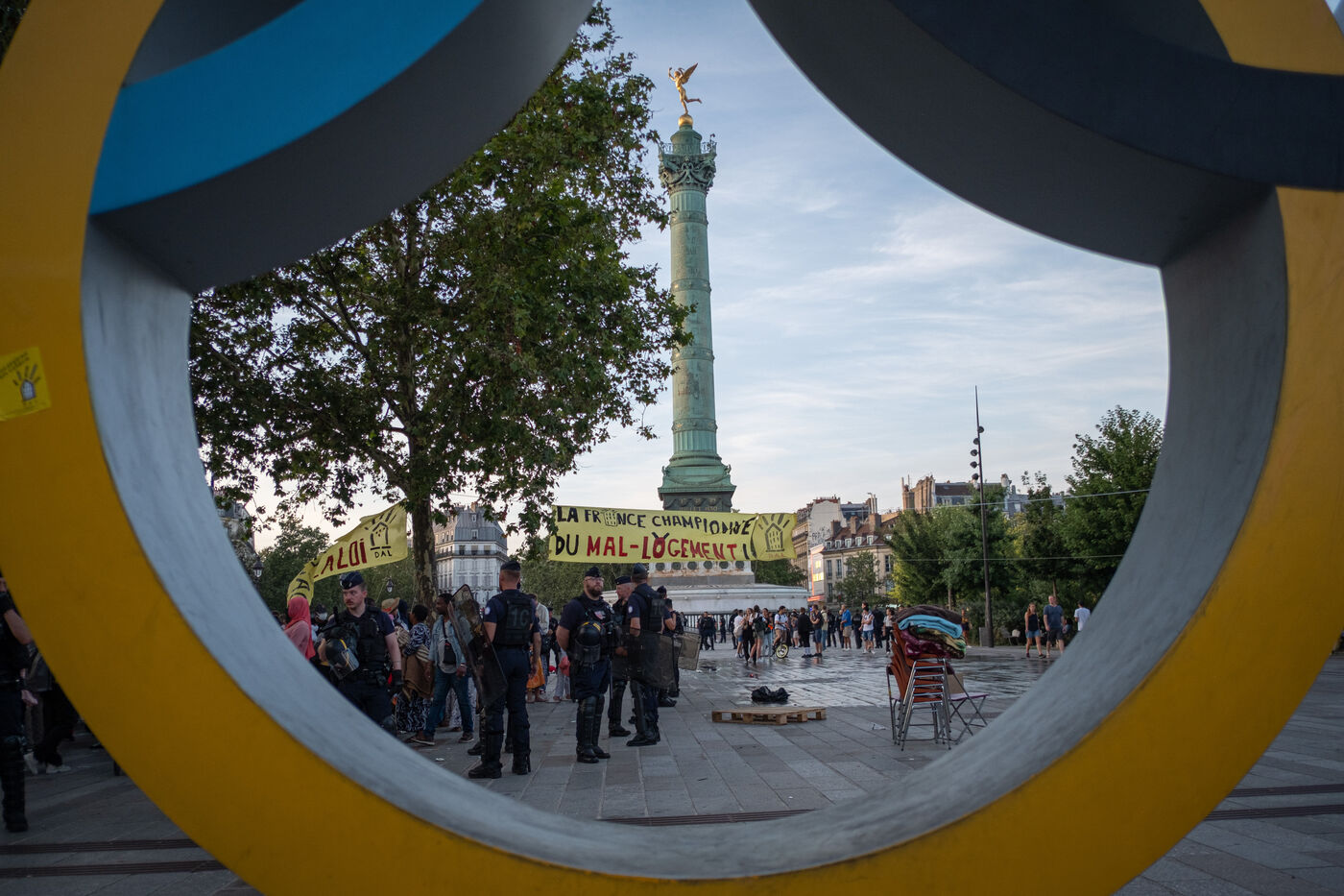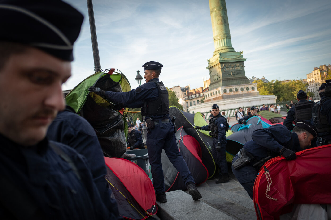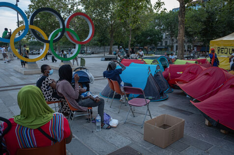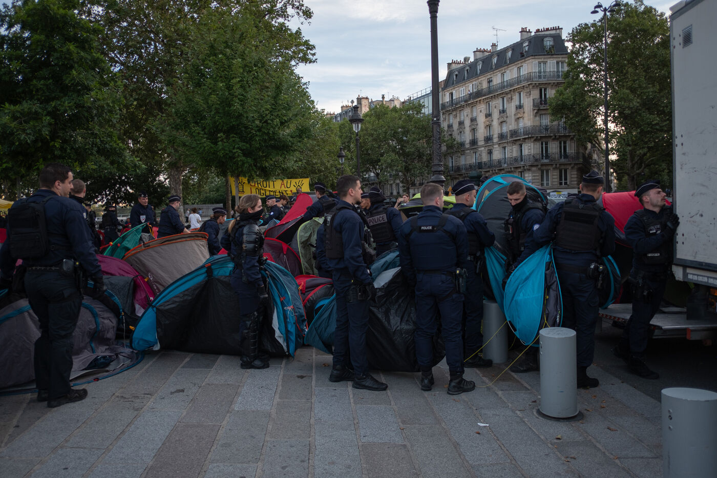 FRANCE, Paris 06 août 2024, installation d?un campement à Bastille, organise par les associations Droit au logement DAL et Utopia 56, pour demander l?hébergement des personnes sans-abri. Photographie par Victoria Valdivia Trigo / Hans Lucas.