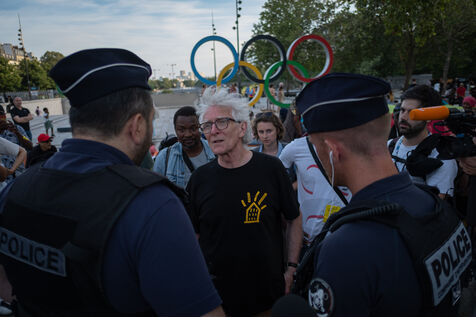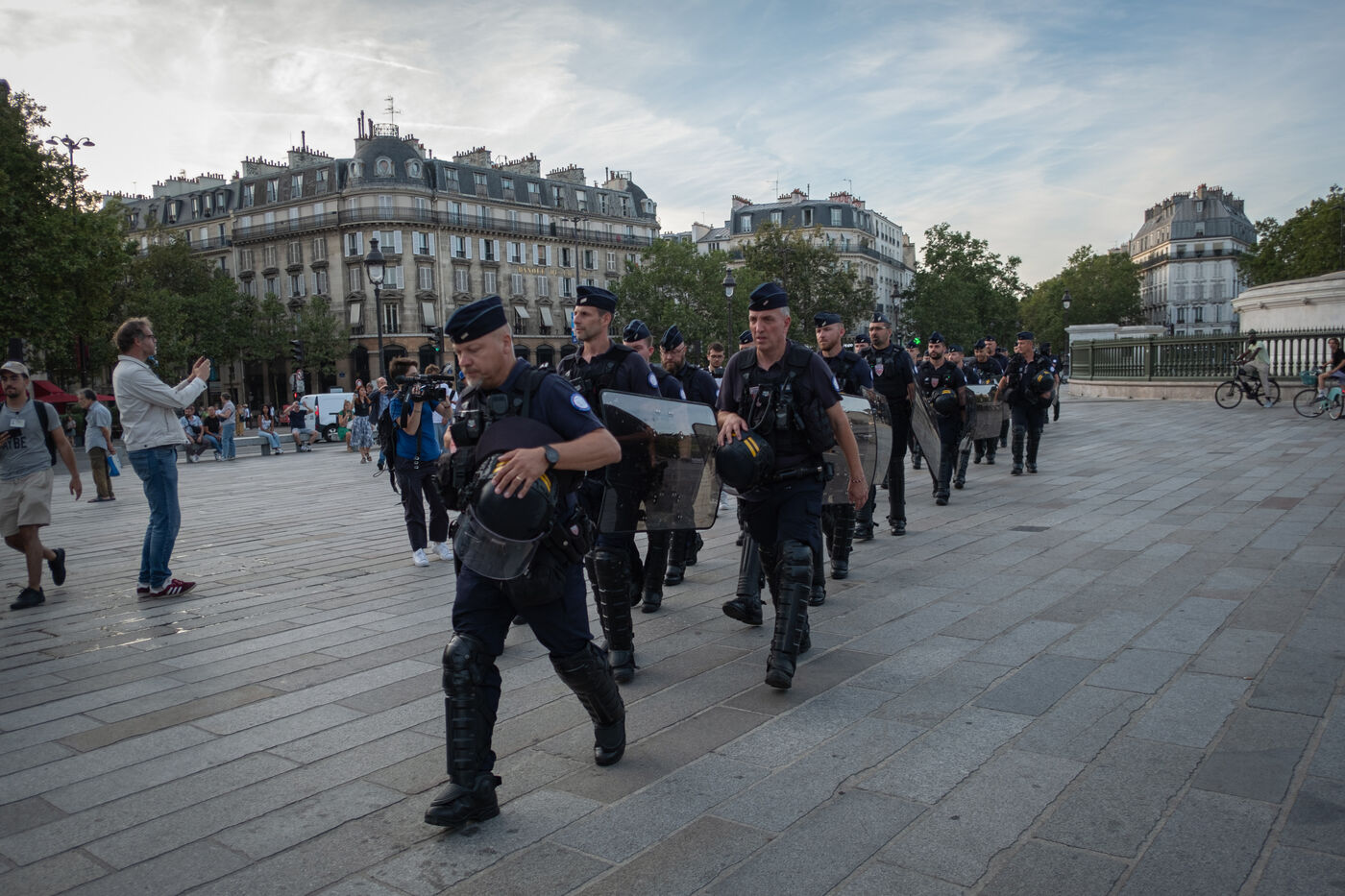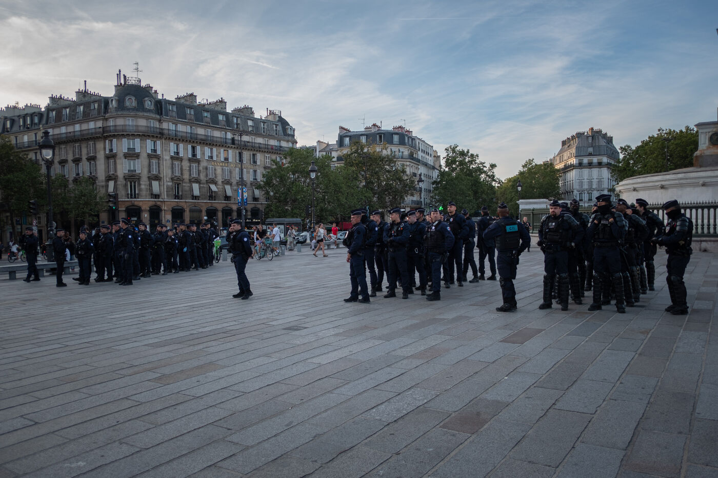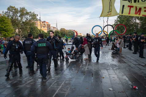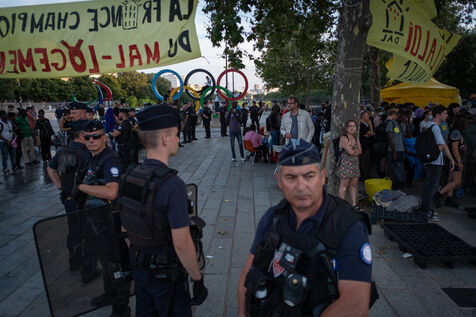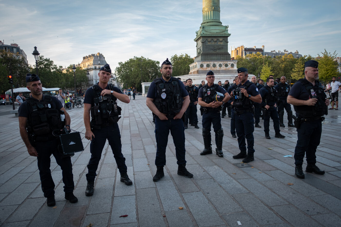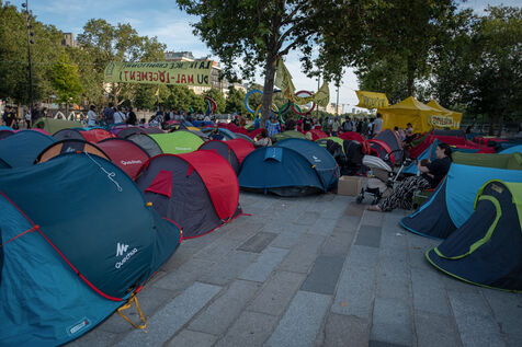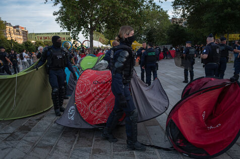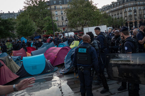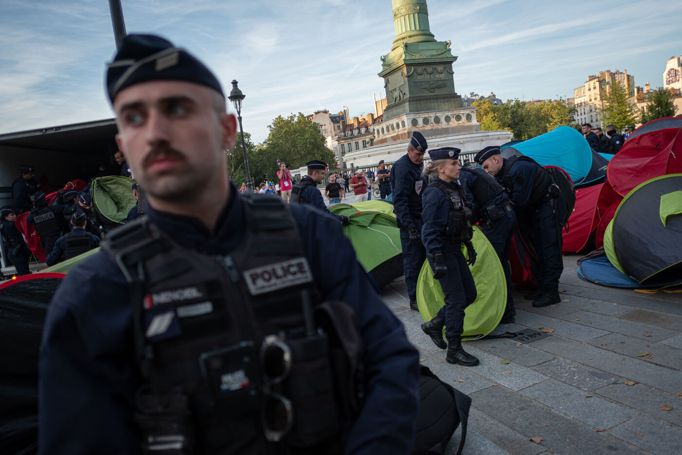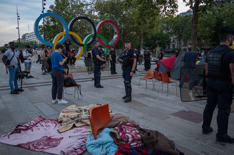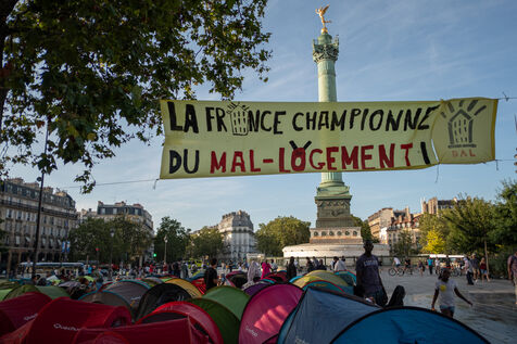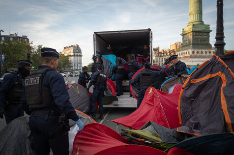 FRANCE, Paris 06 août 2024, installation d?un campement à Bastille, organise par les associations Droit au logement DAL et Utopia 56, pour demander l?hébergement des personnes sans-abri. Photographie par Victoria Valdivia Trigo / Hans Lucas.