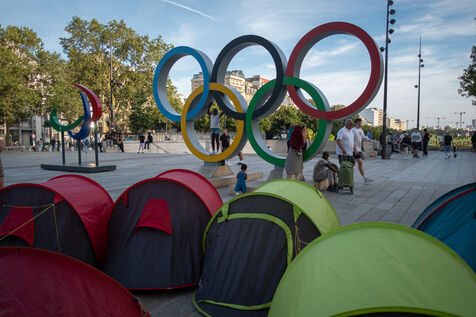 FRANCE, Paris 06 August 2024, installation of an encampment at Bastille, organized by the associations Droit au logement DAL and Utopia 56, to demand accommodation for homeless people. Photography by Victoria Valdivia Trigo / Hans Lucas.