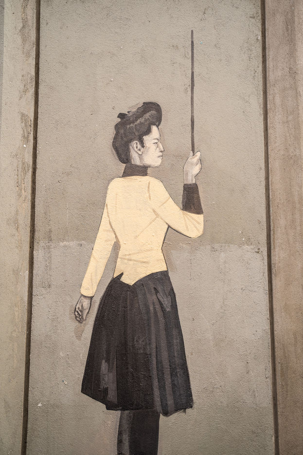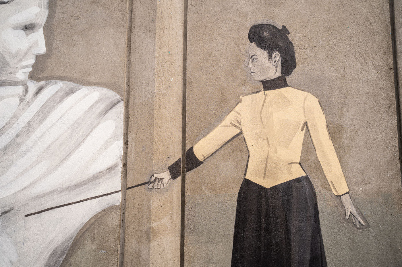 Project of Escif et Brillo_y_Sabor studio on the perimeter wall of Keller Primary School, located in the 11th district, is a linear sequence fragmented as a school is always a sequence of experiences and learning in which children discover the place they want to occupy in relation to the other, in relation to the world, in relation to themselves.