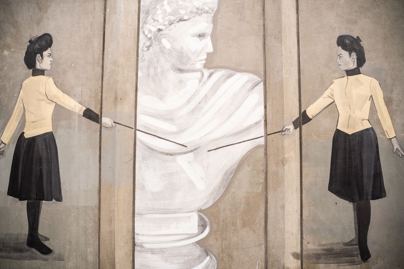 Here the work is a fight, a dance, a dialogue. The canon of classical beauty represented by Greco-Roman sculptures, interrupted by the confrontation of two moving bodies.
