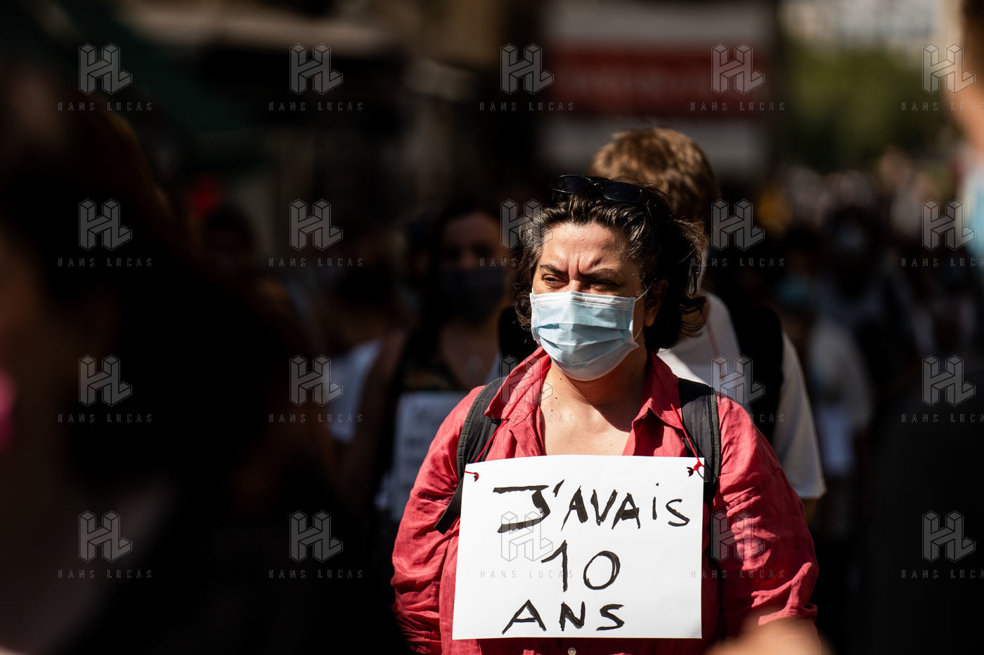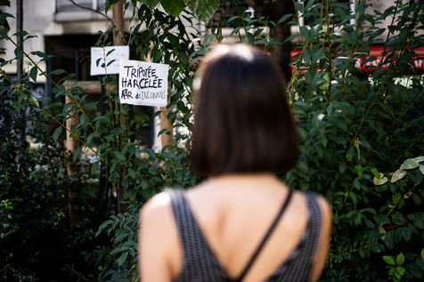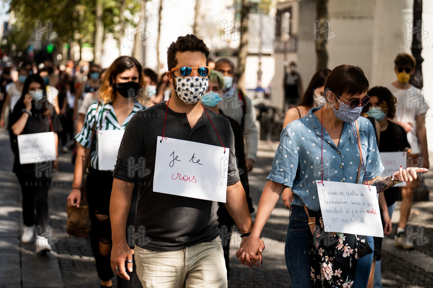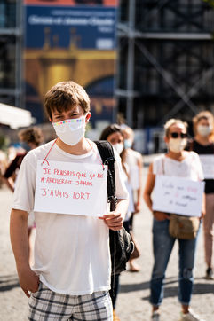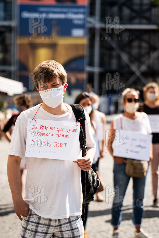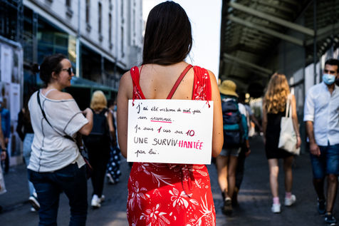 Manifestation "Je te crois" organisée par les Collages Feminicides Paris et Les Resilientes pour permettre aux victimes de témoigner et de libérer leur parole, constamment remise en question, Paris 13 septembre 2020.