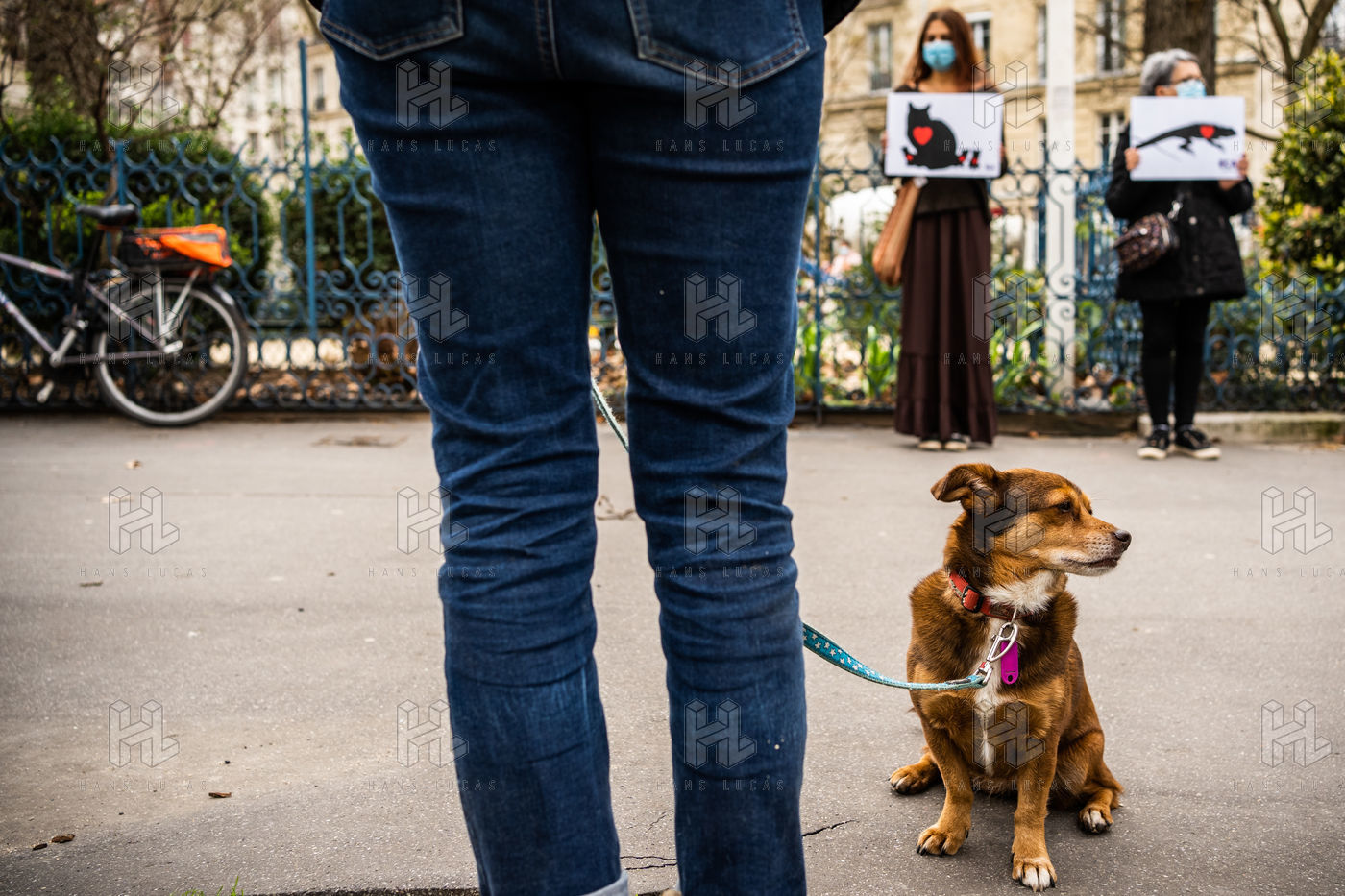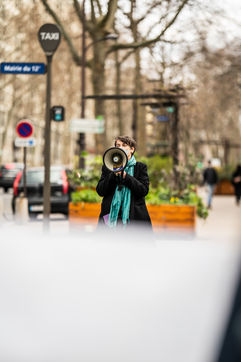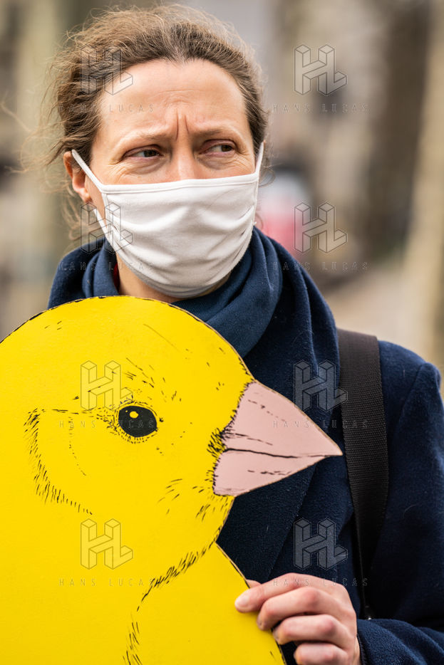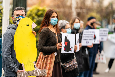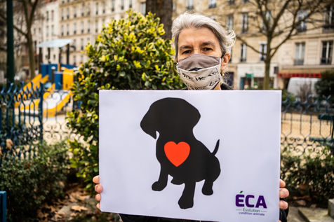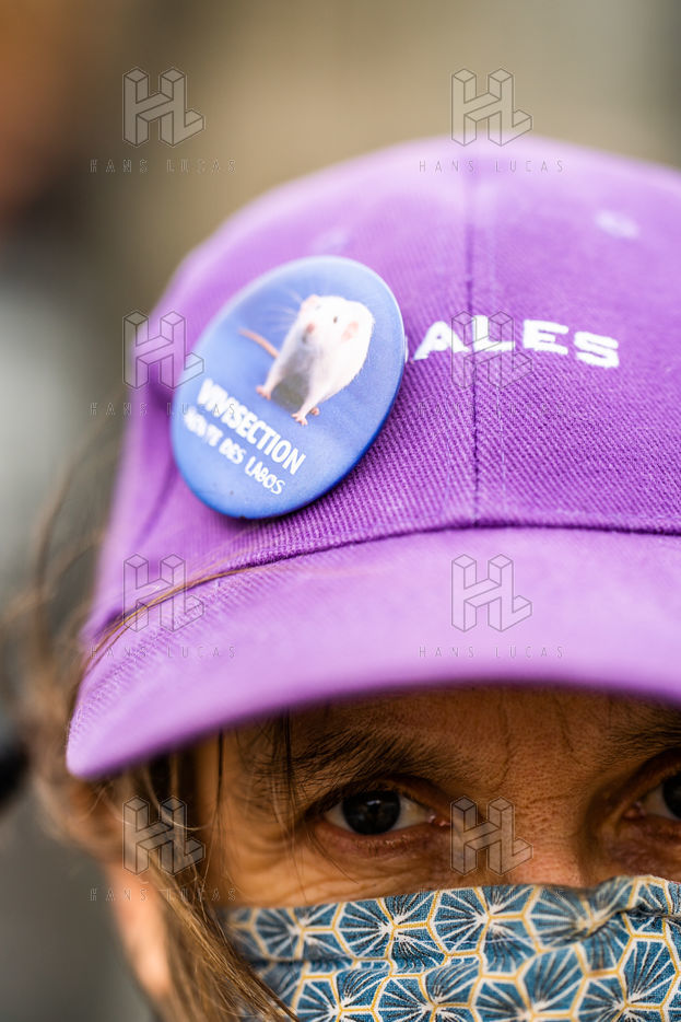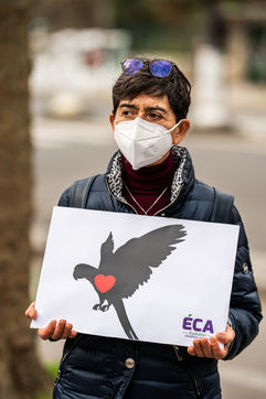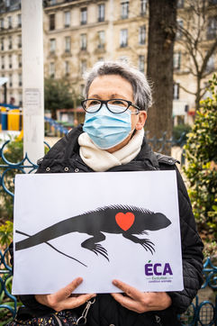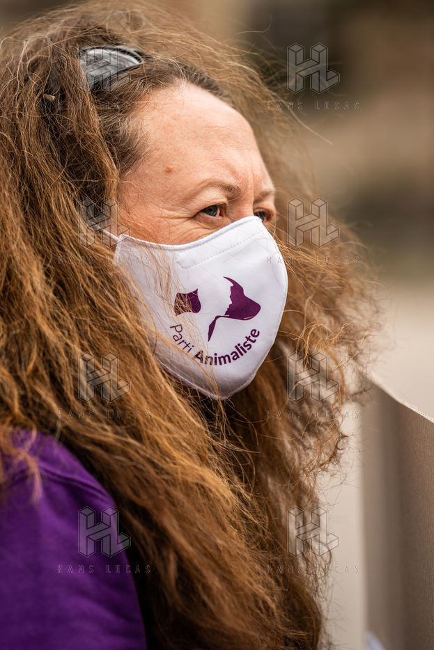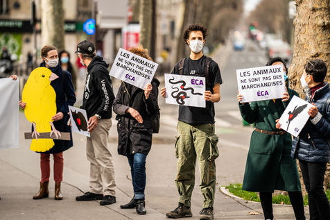 Demonstration against the commodification of animals. Gathering organized by Évolution Condition Animale (ECA) in front of the City Hall of the 12th arrondissement, to demand that the City of Paris no longer host shows and exhibitions sales of live animals on sites it owns or manages, including the Animal Expo show at the Parc Floral, Paris February 23, 2021.