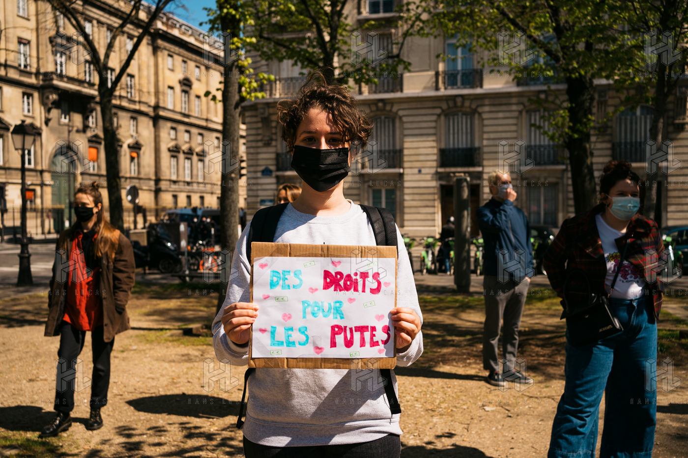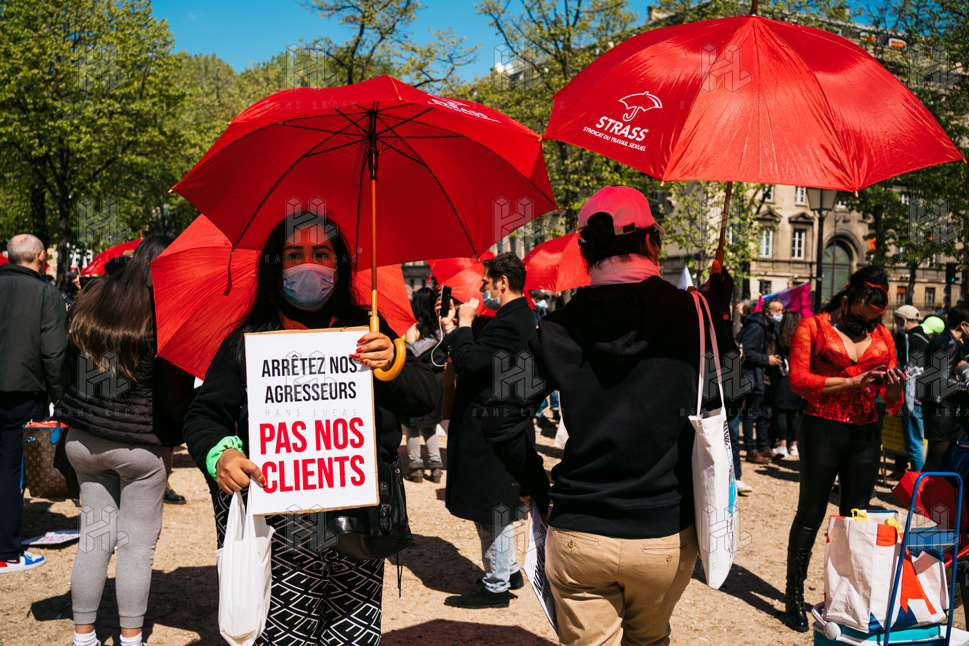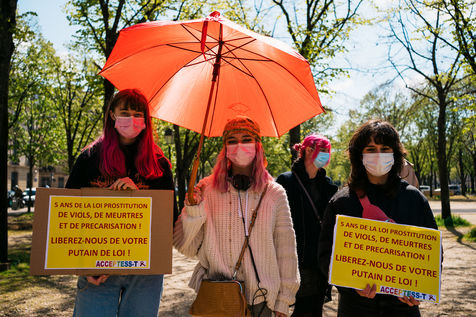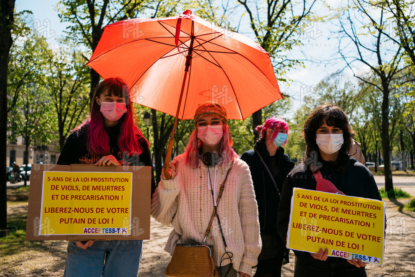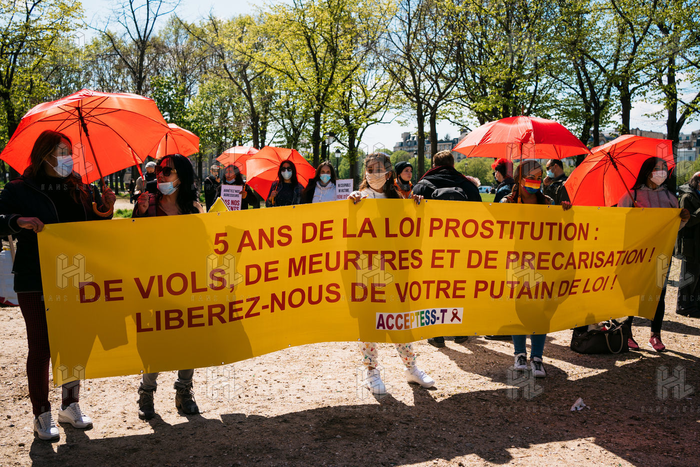Rally against the law penalizing the client of prostitution. It has been 5 years since the law penalizing clients has been in force. Sex workers through STRASS, the sex workers' union, are gathering at the Place des Invalides, in front of the National Assembly to demand a total decriminalization of sex work, Paris, April 13, 2021.