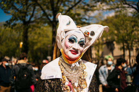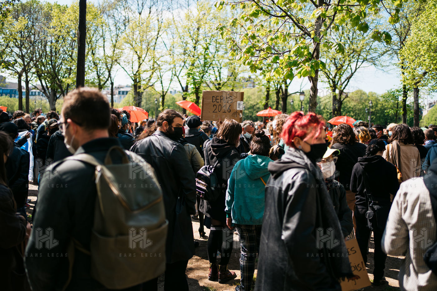 Rassemblement contre la loi de pénalisation du client de prostitution. Cela fait 5 ans que la loi de pénalisation des clients est en vigueur. Les travailleurs et travailleuses du sexe a travers le STRASS, syndicat du travail sexuel, se réunissent place des Invalides, face à l?assemblée Nationale pour demander une dépénalisation totale du travail du sexe, Paris 13 avril 2021.