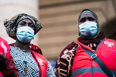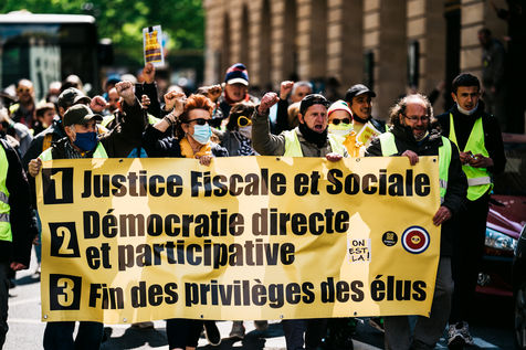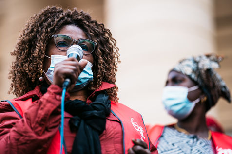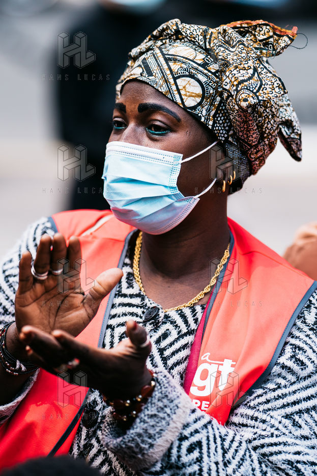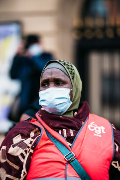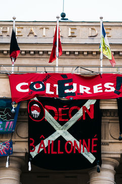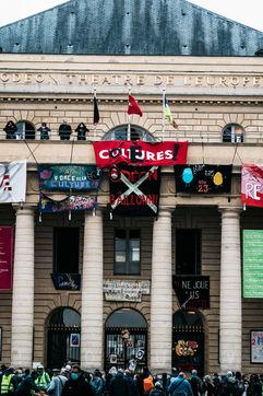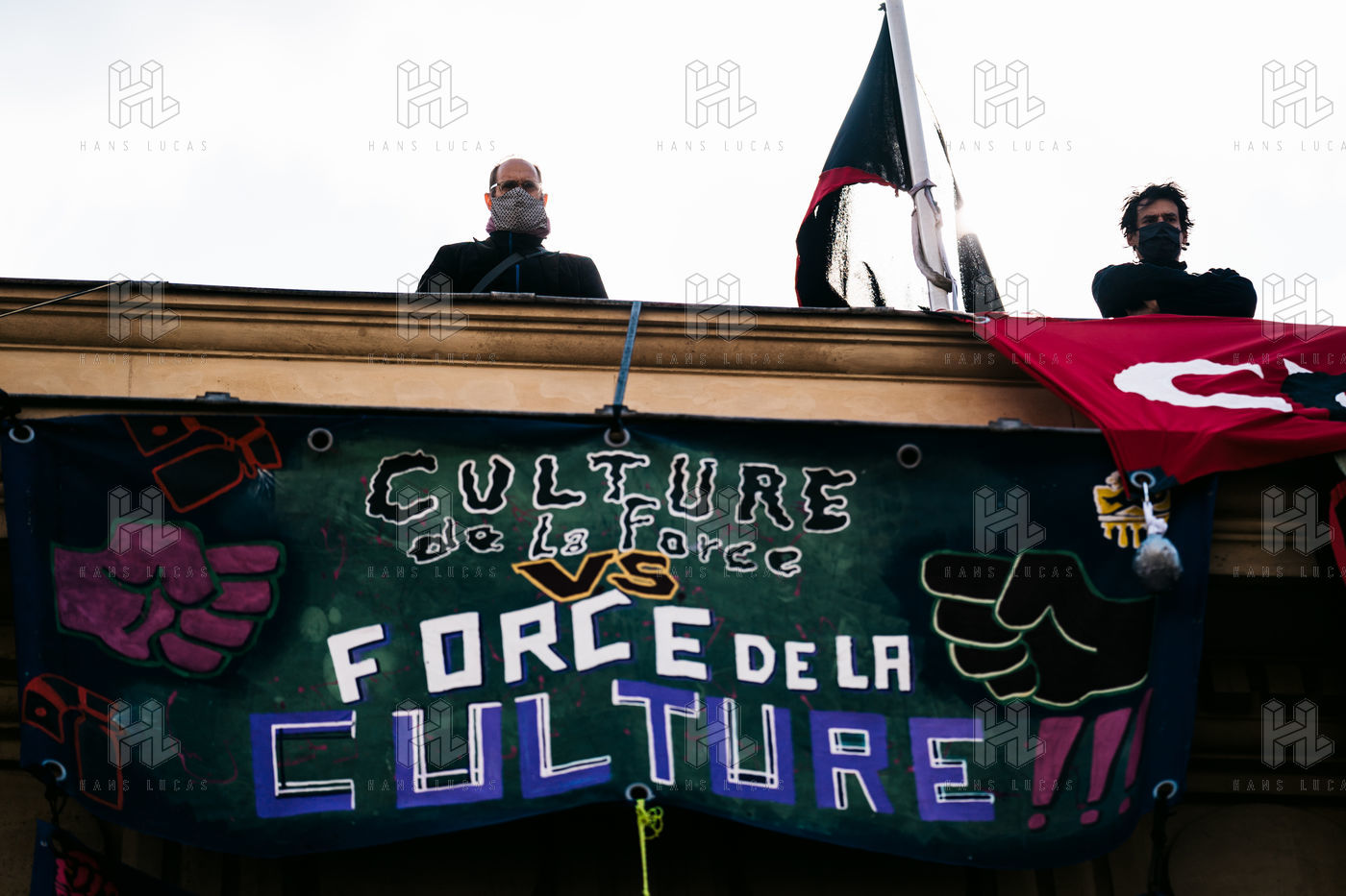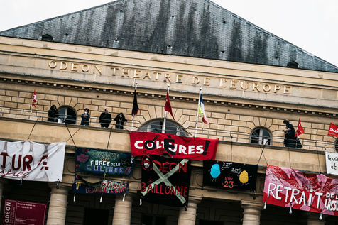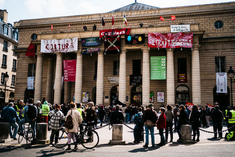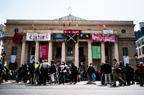 Gathering and speak in support of the occupation of the Odeon theater, fighting for all precarious people, at the Odeon Square, Paris April 17, 2021.