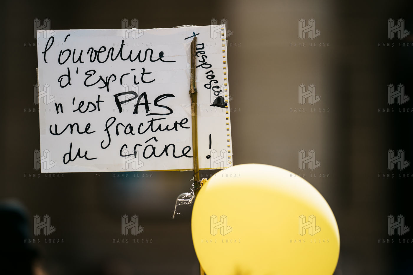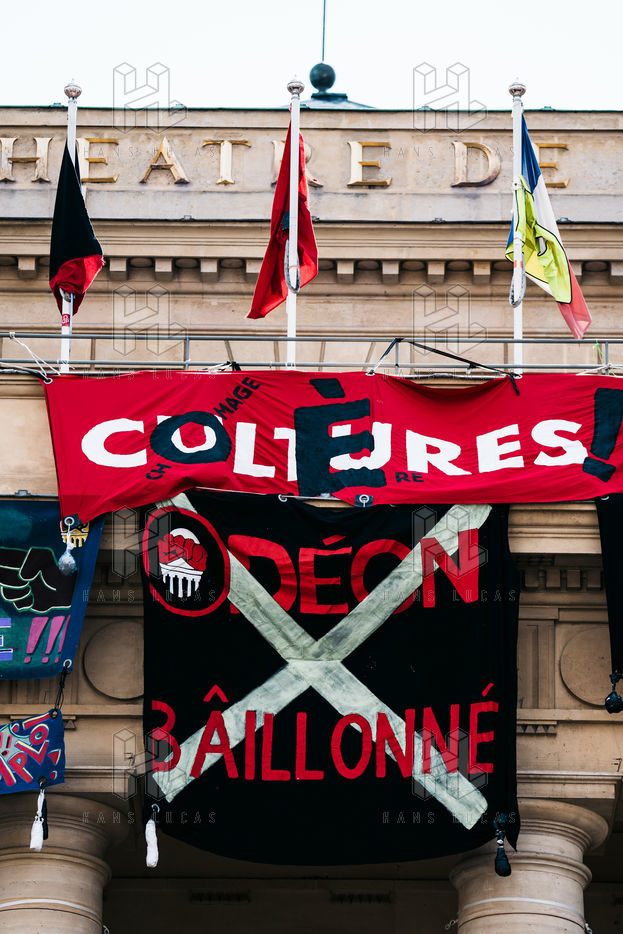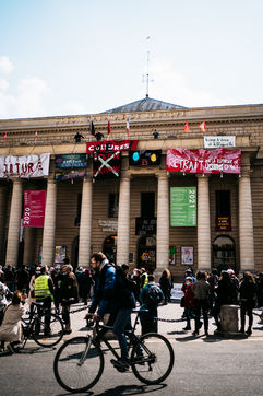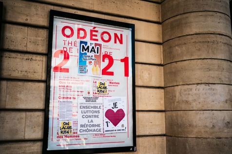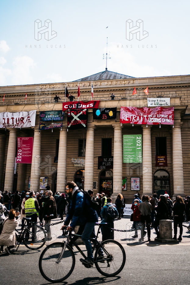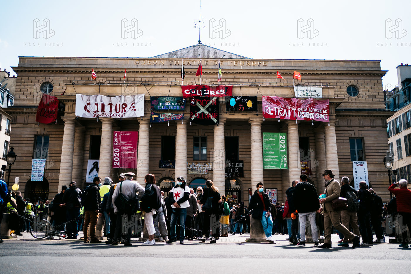 Rassemblement et prise de parole en soutien à l'occupation du theatre de l'Odéon, qui se battent pour tous les précaires, à Place de l'Odéon, Paris 17 avril 2021.