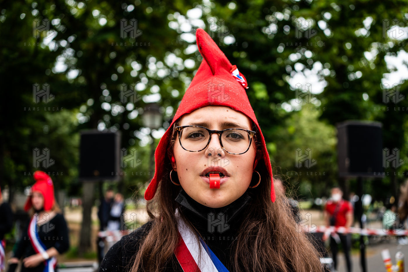 A group of women dressed as Marianne, with smoke bombs, shout slogans against ART (assisted reproductive technology), Paris 29 June 2021.