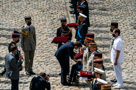Le Président de la République, Emmanuel MACRON, préside la prise d'armes qui se déroulera le jeudi 8 juillet 2021, dans la cour d'honneur de l'Hôtel national des Invalides. A cette occasion, le chef de l'Etat procède à une remise de décorations en hommage à des combattants, militaires en activité ou participants des conflits de l'Histoire contemporaine de notre pays, qui se sont illustrés récemment ou dans le passé.