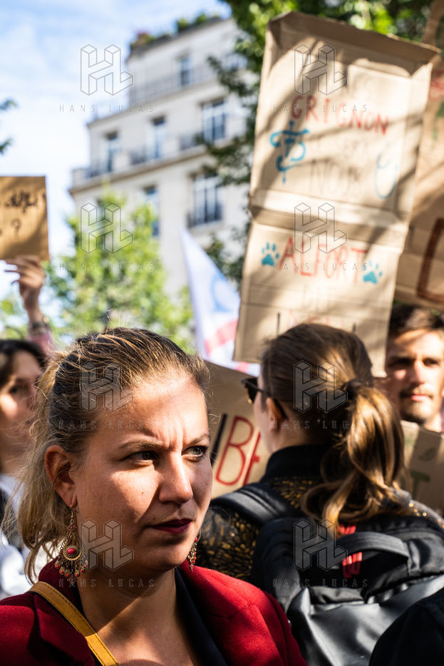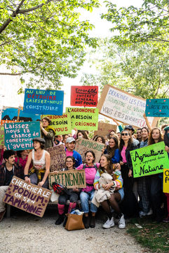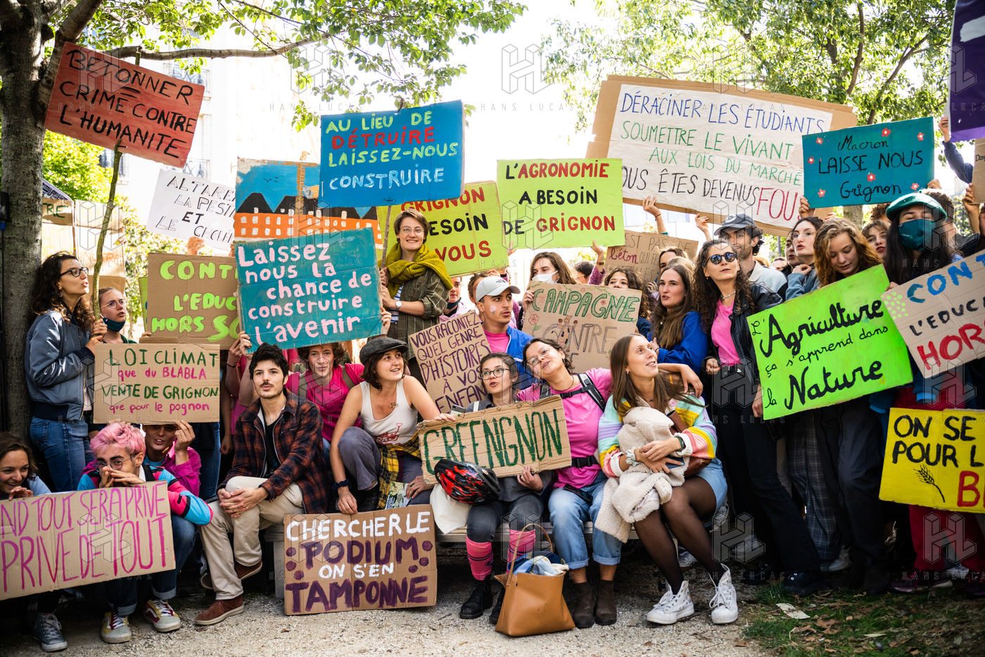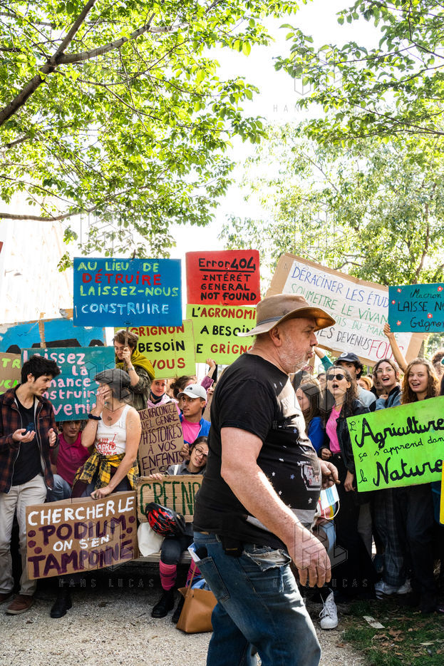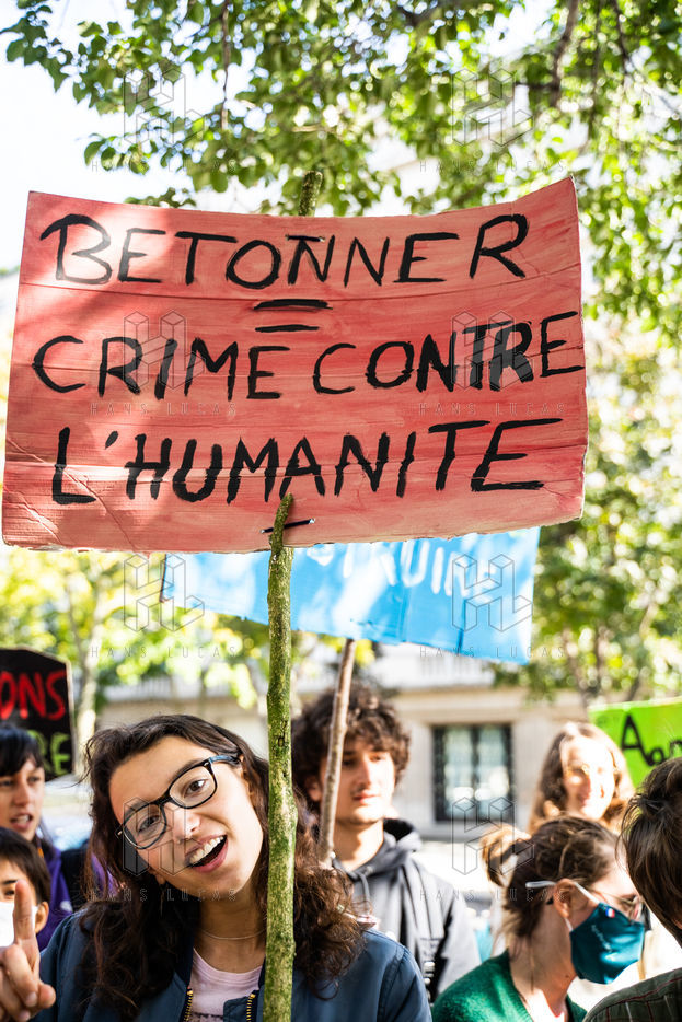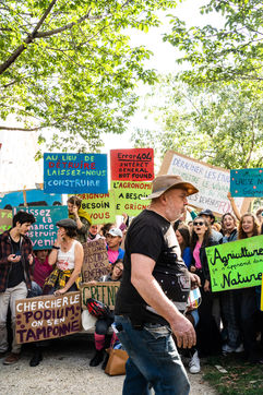 Demonstration, organized by the collective for the future of the Grignon site, unions and students, against the sale of the Grignon estate (Yvelines) to the property developer Altarea Cogedim, place denys cochin, in the 7th arrondissement of Paris.