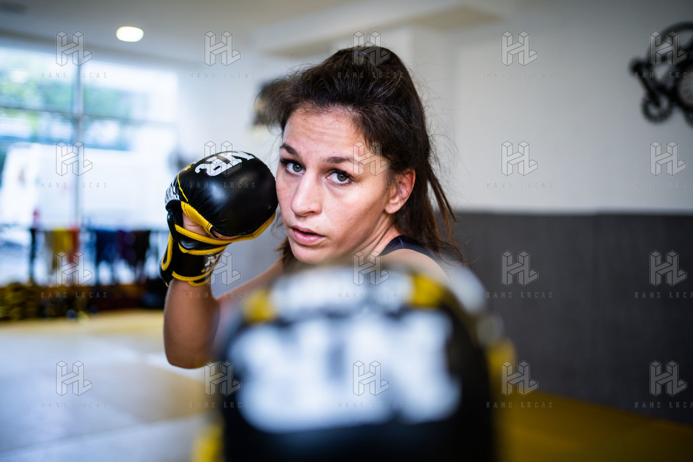 Portrait of Lucie Bertaud, French amateur boxer, MMA fighter, mixed martial arts sport, who trains at NR Fight in Paris for her fight at the second edition of the MMA hexagon which will take place on October 30th at the Zenith in Paris.