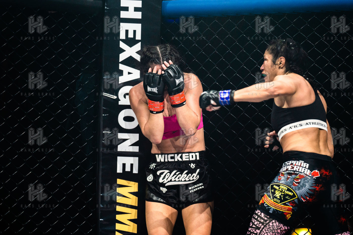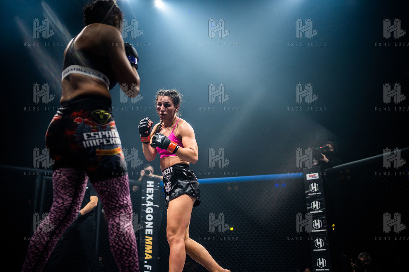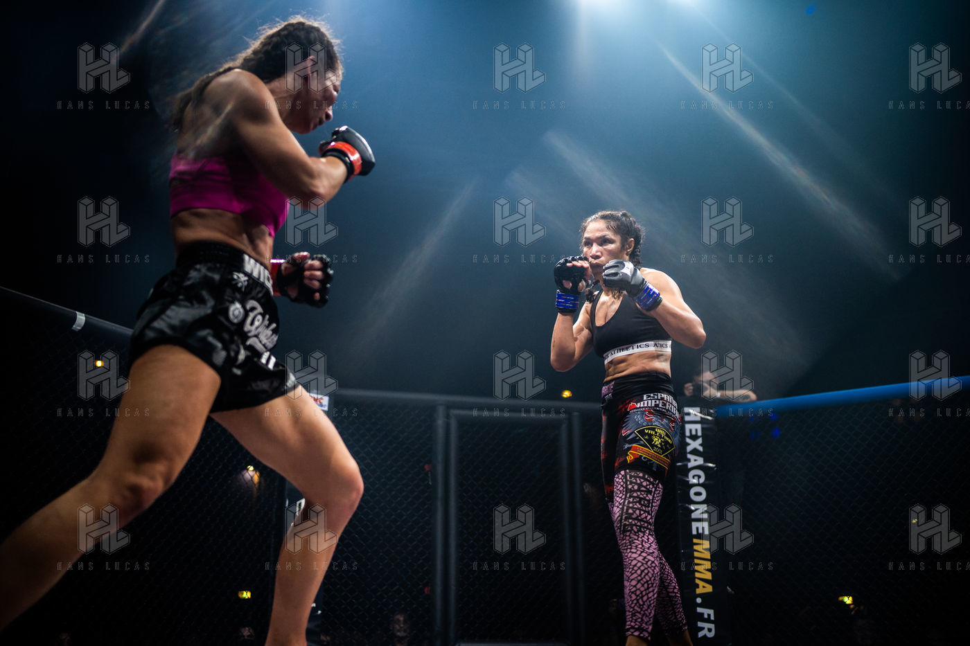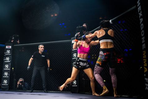 Combat entre Lucie Bertaud, pratiquante professionnelle française d arts martiaux mixtes et finaliste de Koh-Lanta, et Karla Benitez, surnomme the warrior of god de Venezuela et basée en Espagne, catchweight 57 kg à l'occasion de la deuxième édition de l'hexagone MMA au Zénith de Paris.