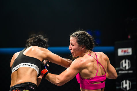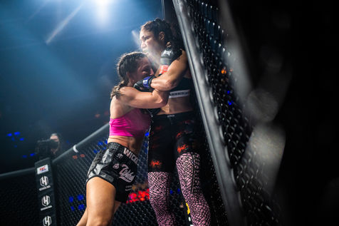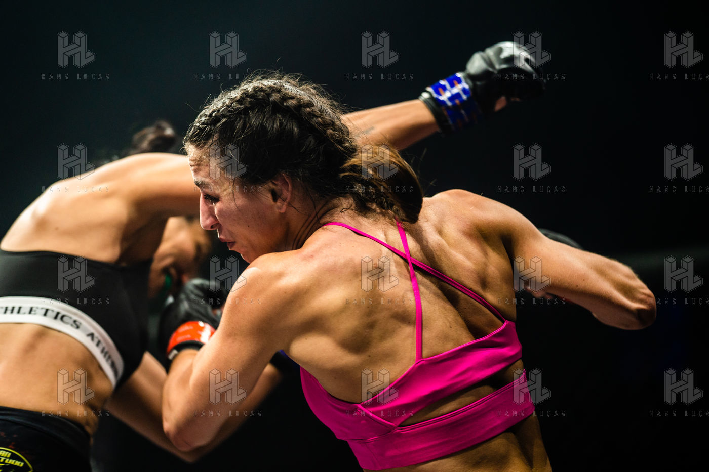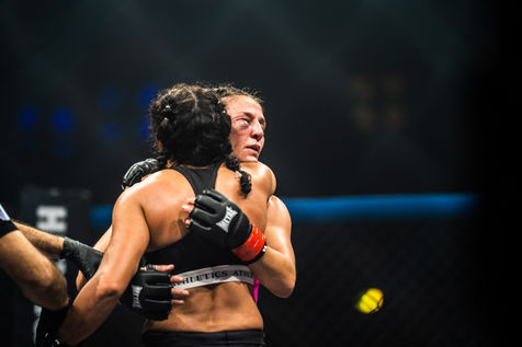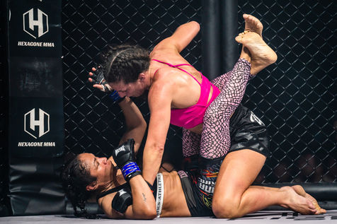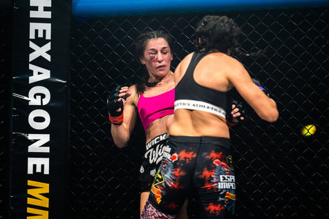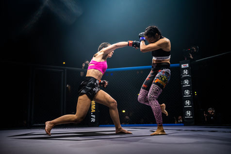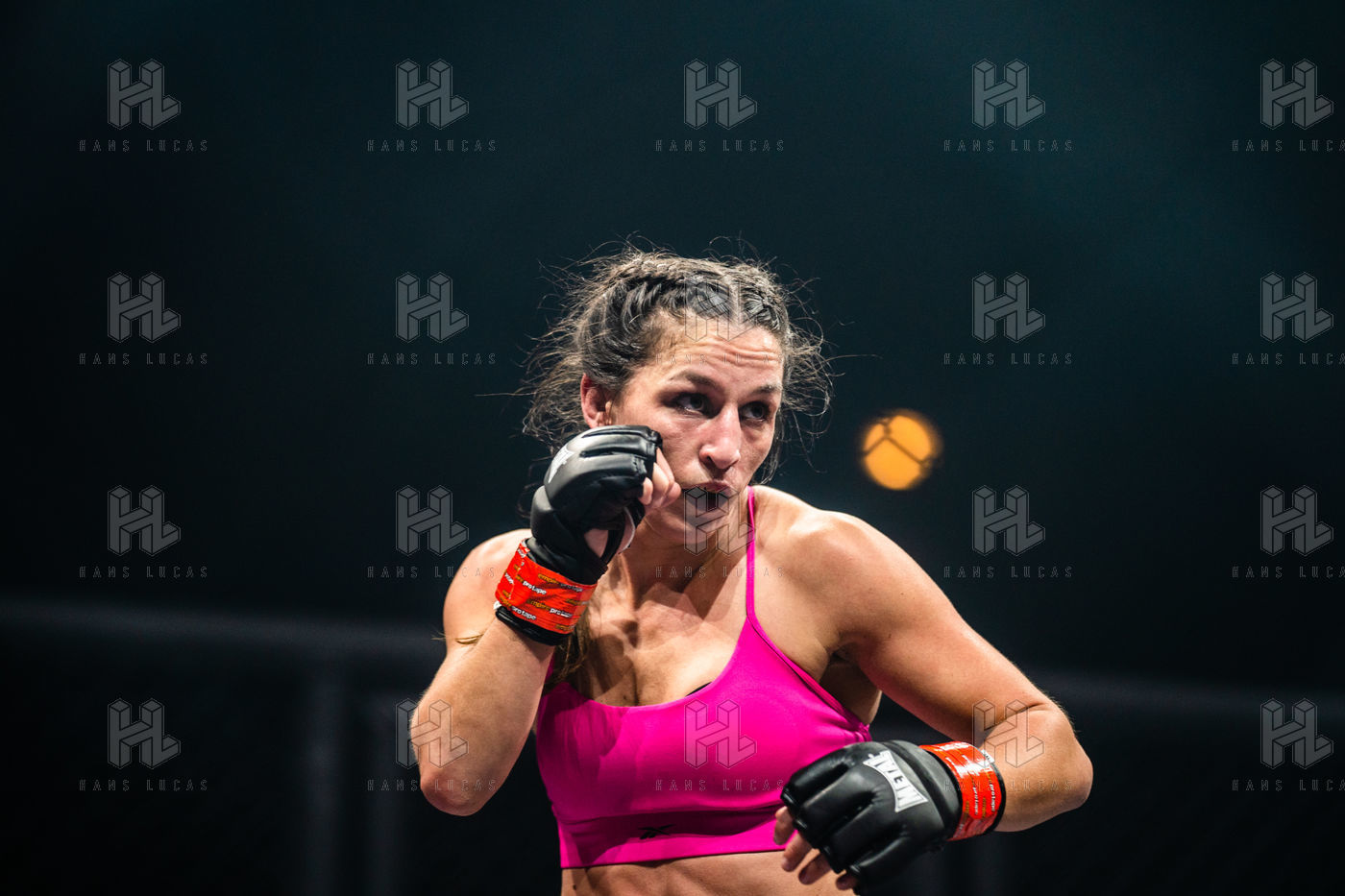 Combat entre Lucie Bertaud, pratiquante professionnelle française d arts martiaux mixtes et finaliste de Koh-Lanta, et Karla Benitez, surnomme the warrior of god de Venezuela et basée en Espagne, catchweight 57 kg à l'occasion de la deuxième édition de l'hexagone MMA au Zénith de Paris.