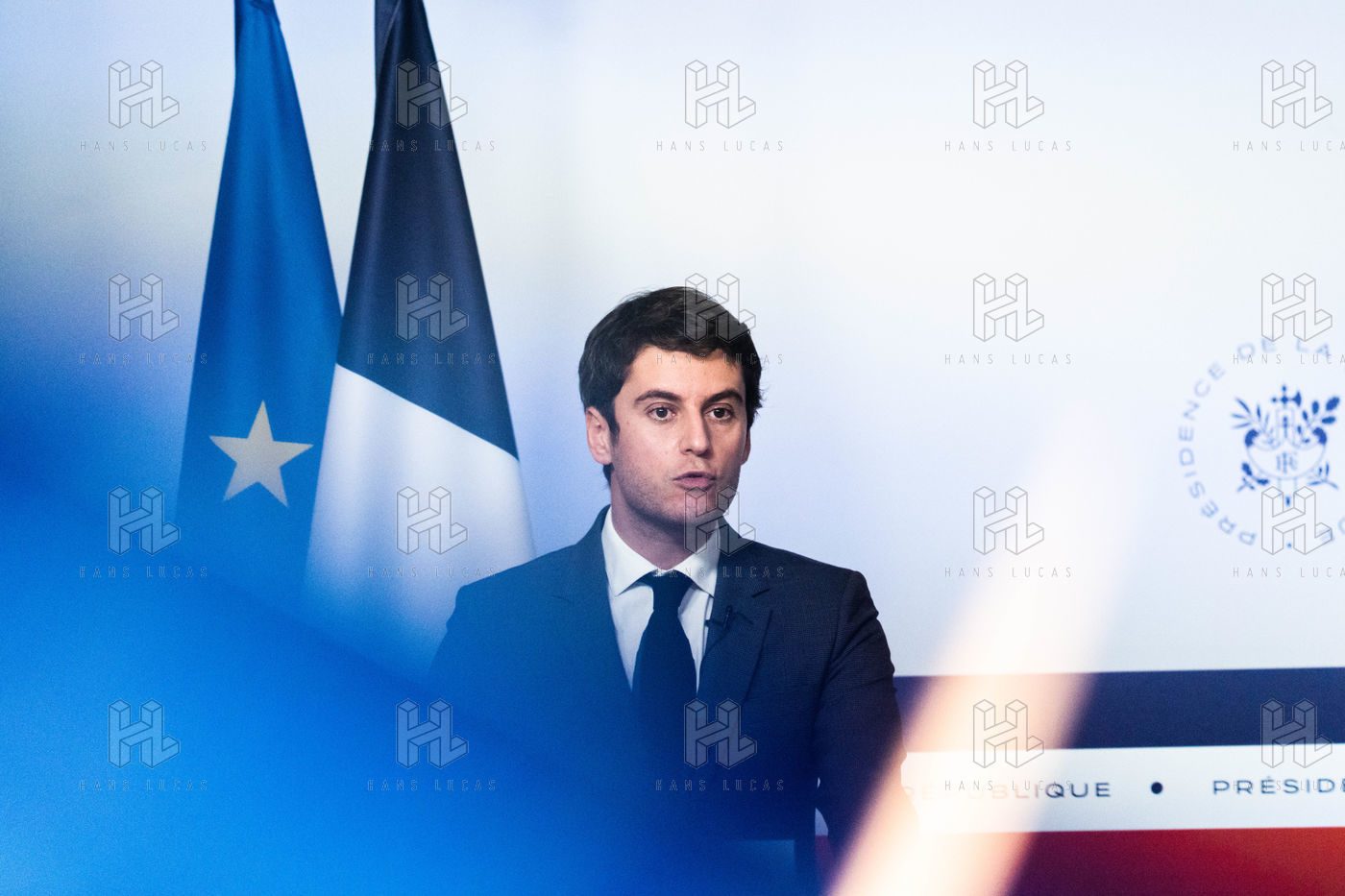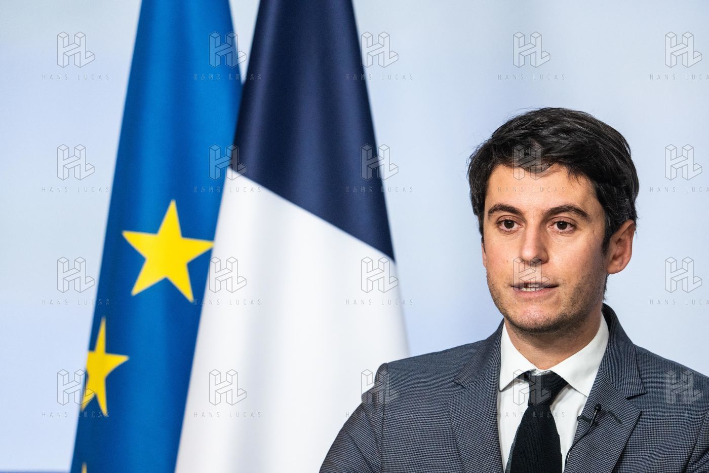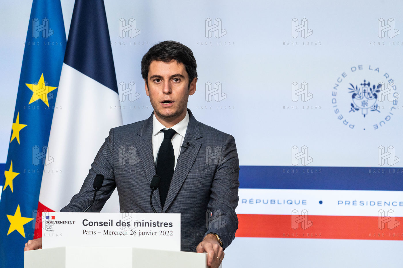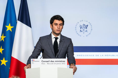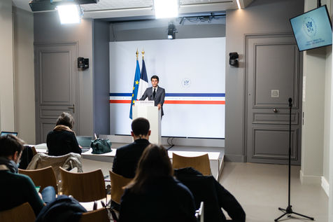 Gabriel Attal, porte-parole du gouvernement, fait un compte-rendu à l'issue du conseil des ministres, dans la salle du porte-parole, Paris 26 JANVIER 2021.