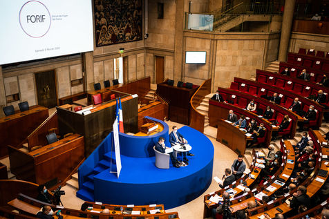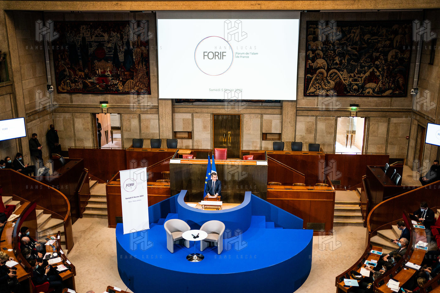 Forum of the Islam of France at the Economic, Social and Environmental Council. Plenary session of presentation of the conclusions of the four working groups by the rapporteurs. Application of the law reinforcing the respect of the principles of the Republic, the professionalization and recruitment of imams, the security of places of worship and the fight against anti-Muslim acts, the organization and functioning of chaplaincies.