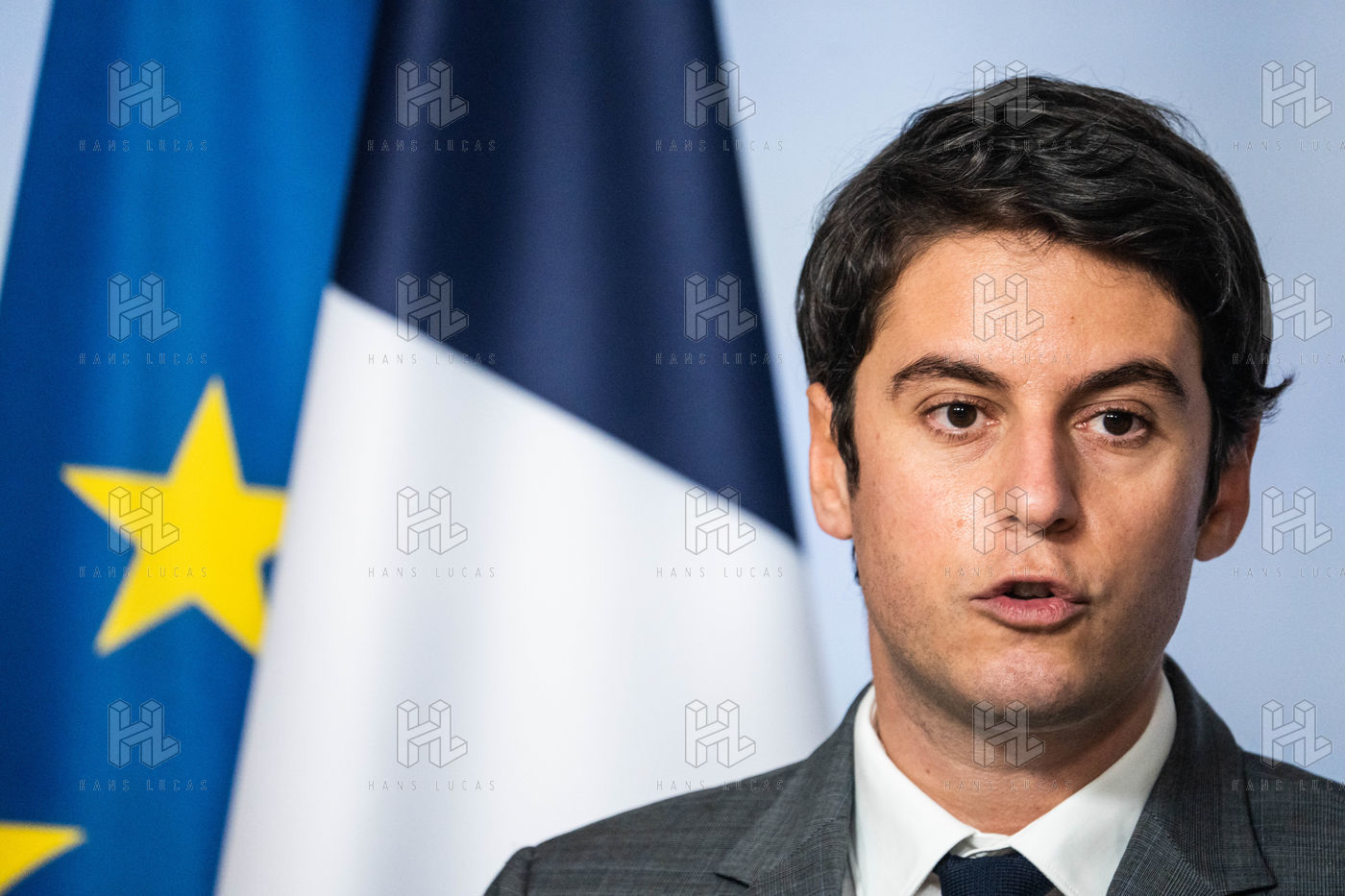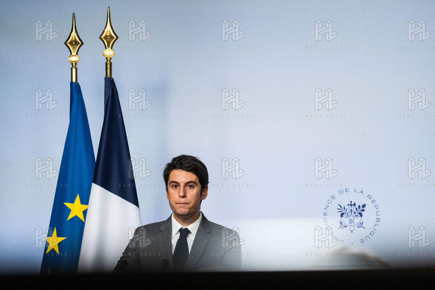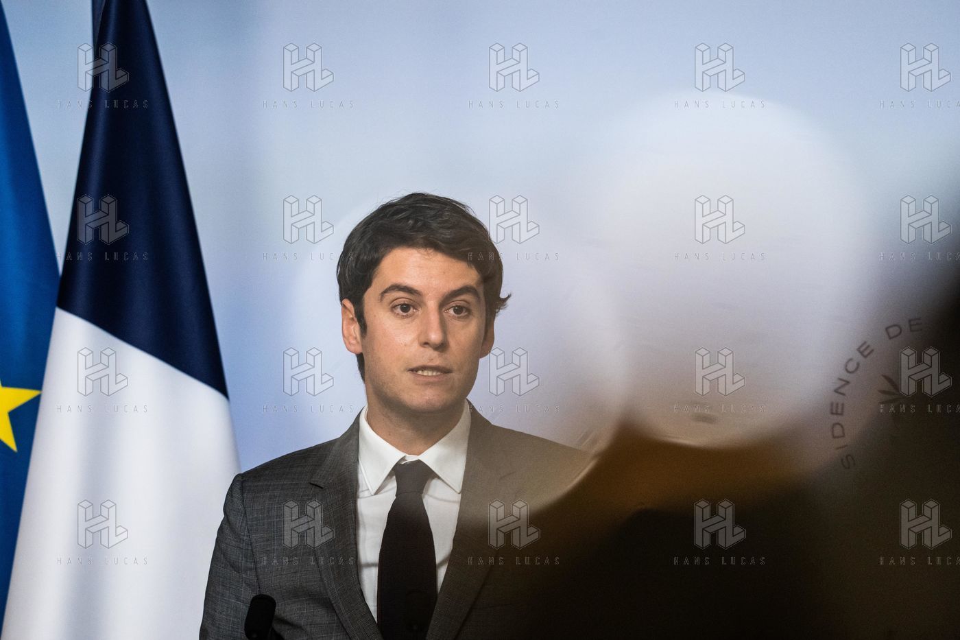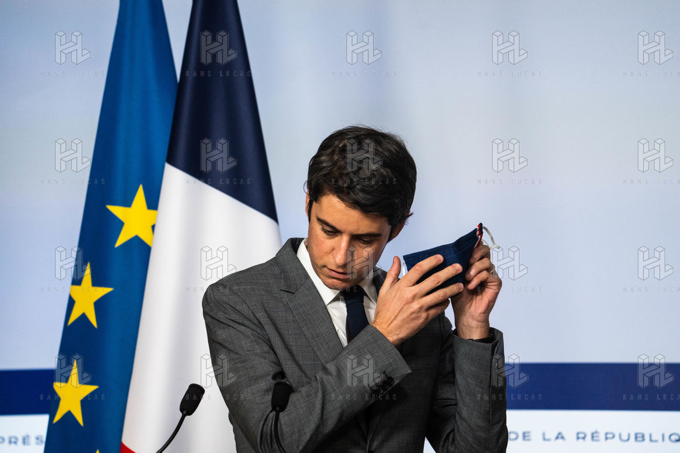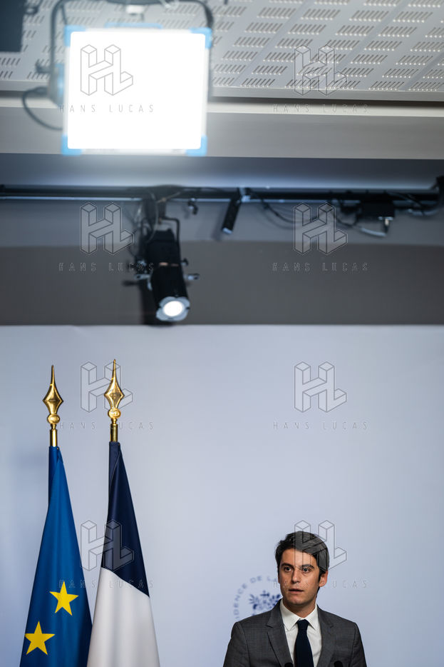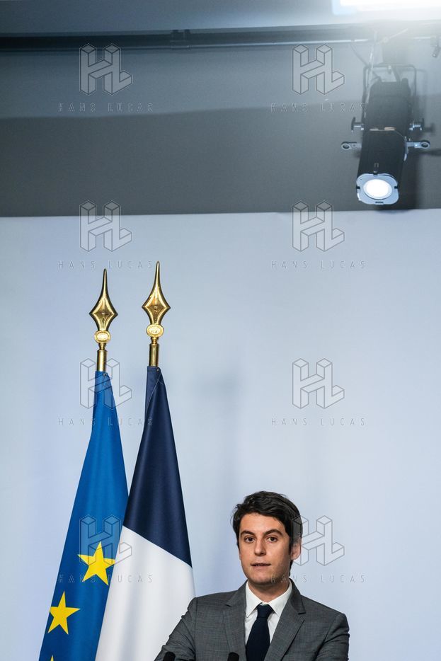 Gabriel Attal, porte-parole du gouvernement, fait un compte-rendu à l'issue du conseil des ministres, dans la salle du porte-parole, Paris 09 février 2022.
