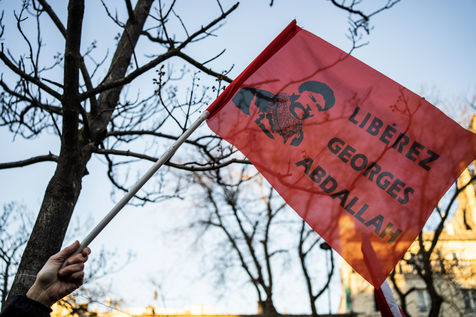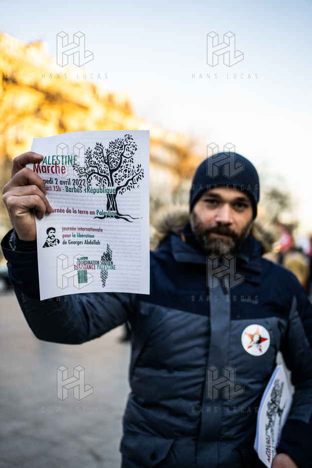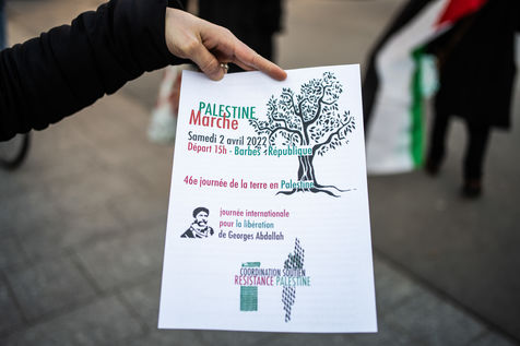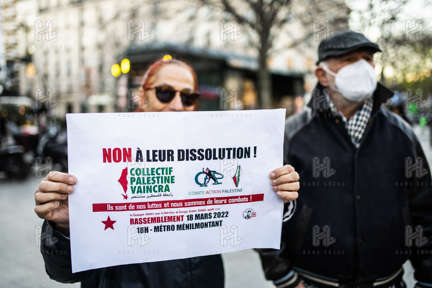 Rally against the dissolution of the Collectif Palestine vaincra and the Comite action palestine, organized by the unitary campaign for the release of Georges Ibrahim Abdallah, at the exit of the Menilmontant metro station.