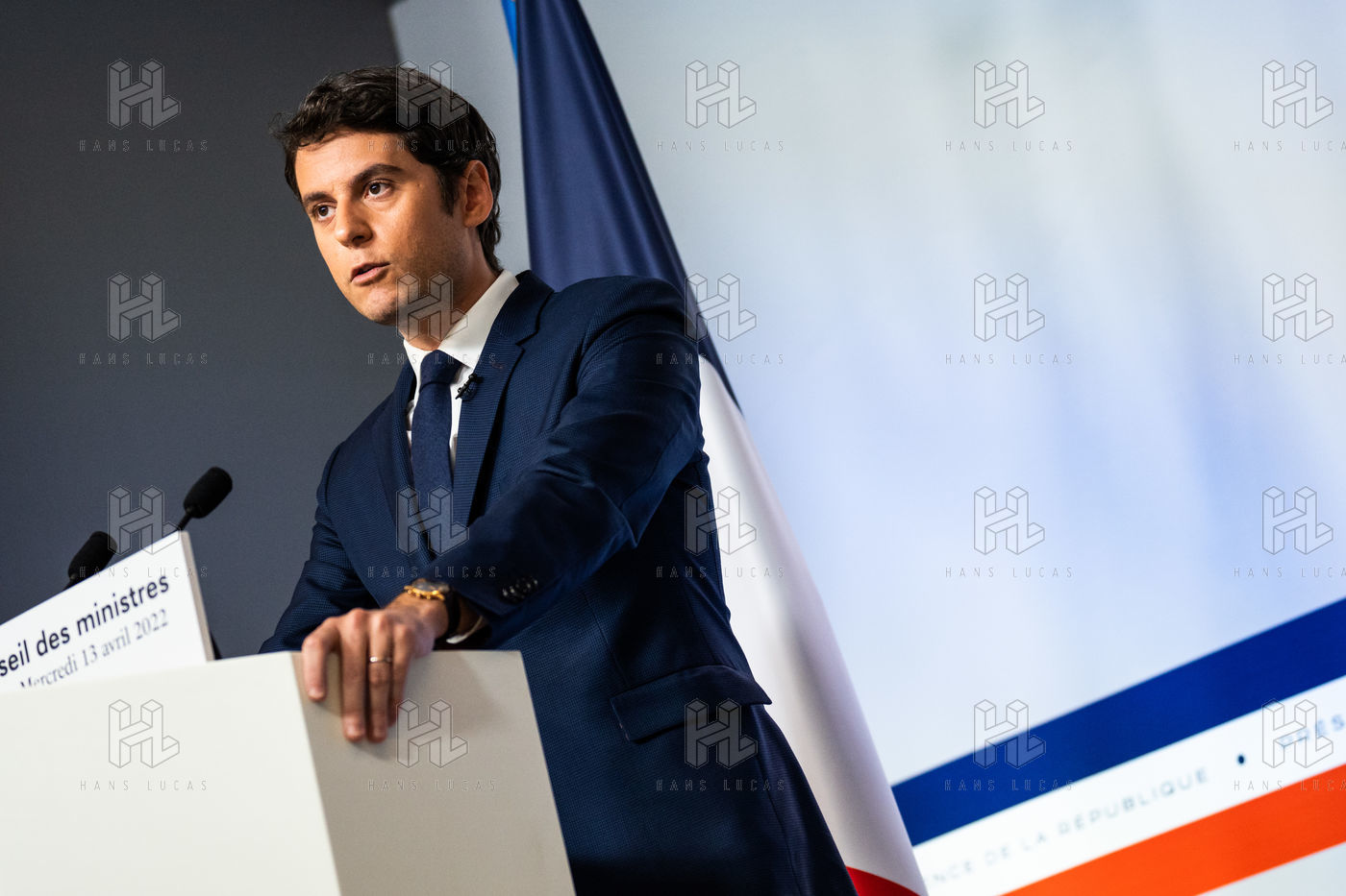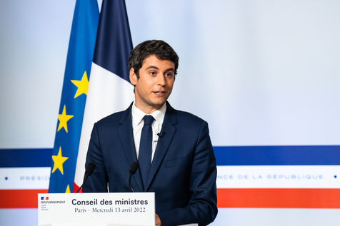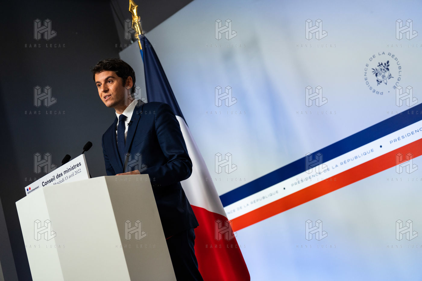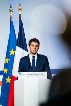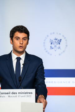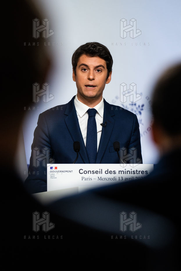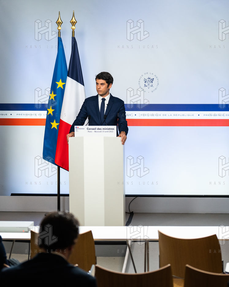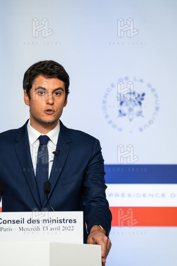 Gabriel Attal, government spokesman, reports after the council of ministers, in the spokesman's room, Paris 13 April 2022.
