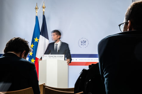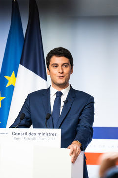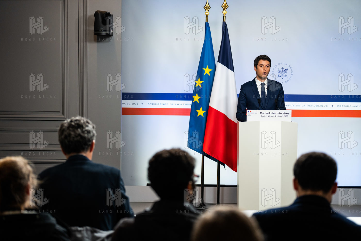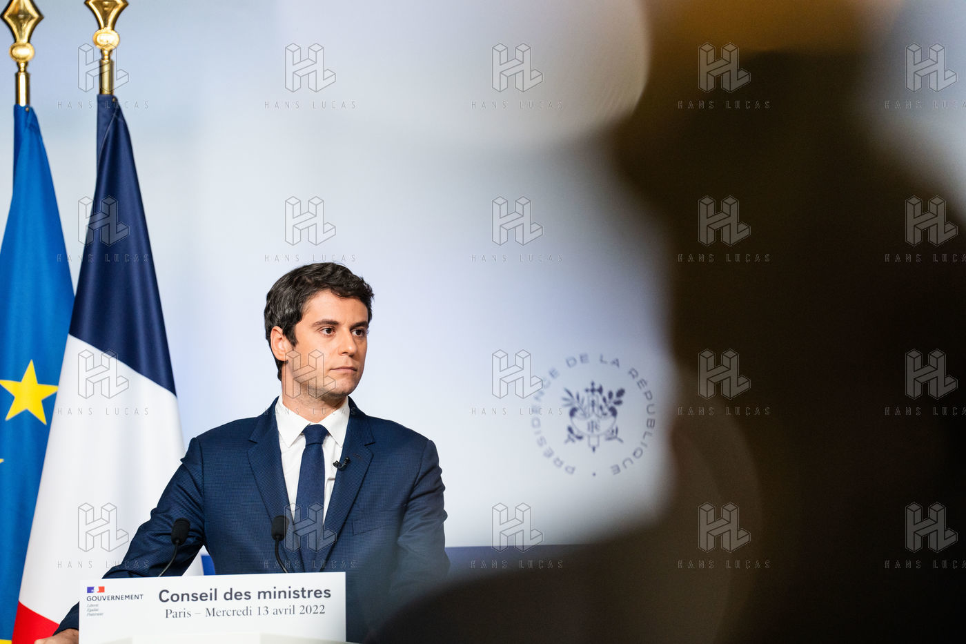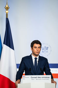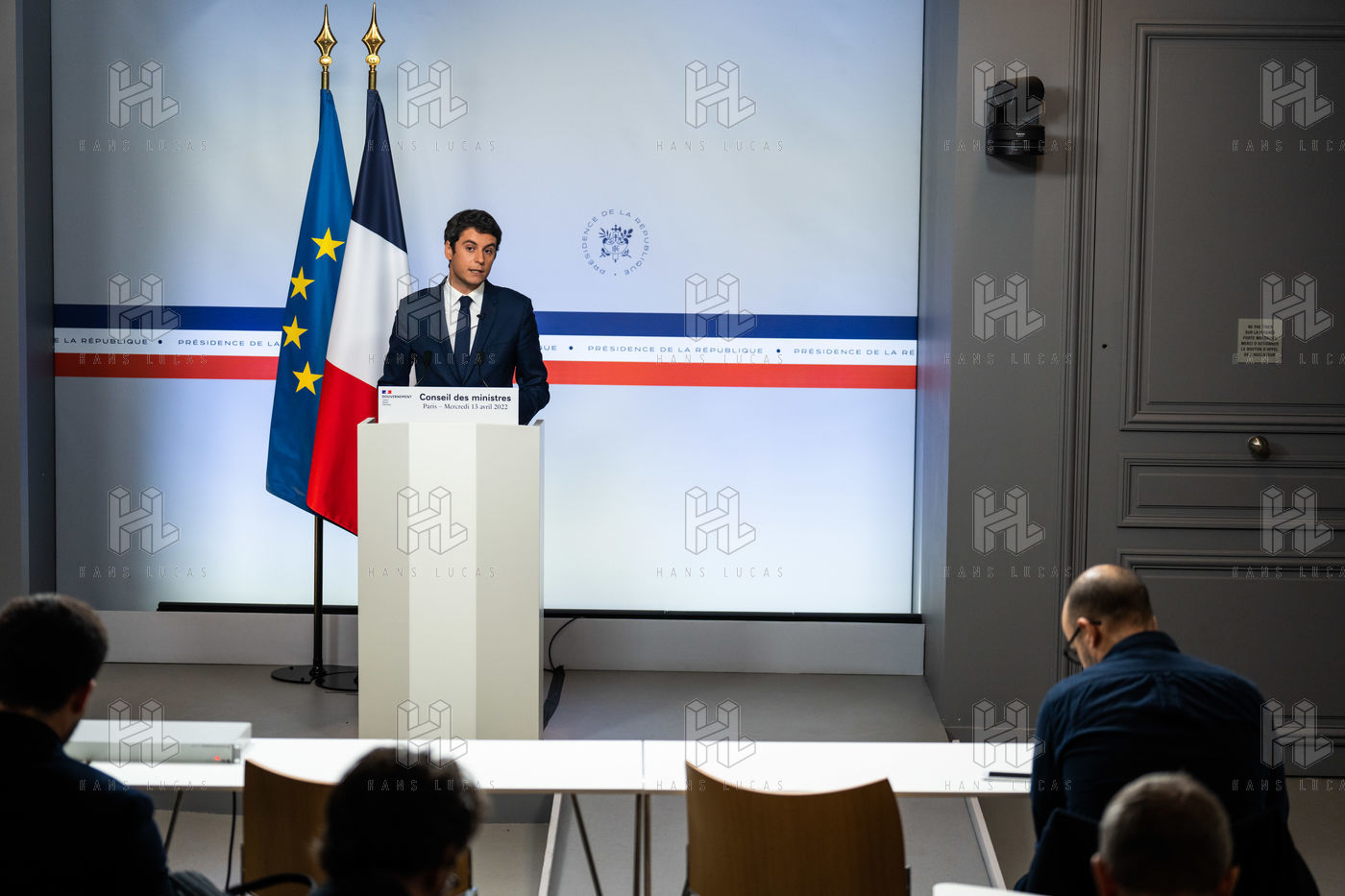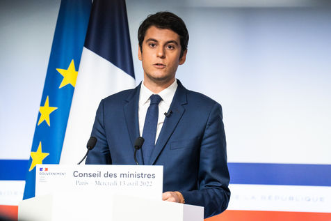 Gabriel Attal, government spokesman, reports after the council of ministers, in the spokesman's room, Paris 13 April 2022.