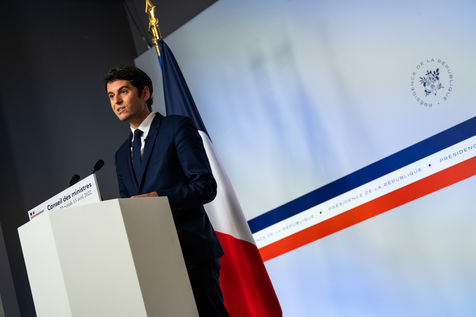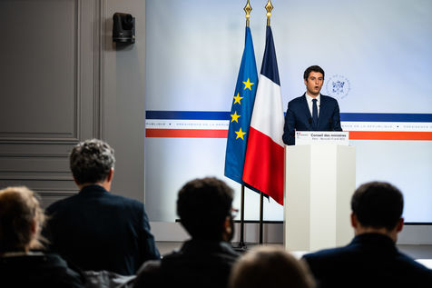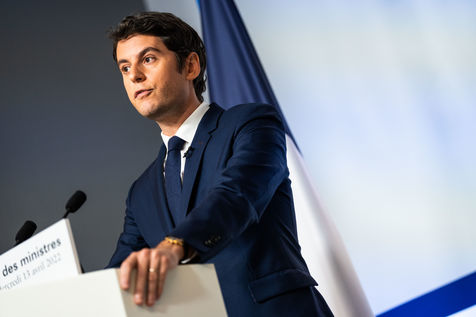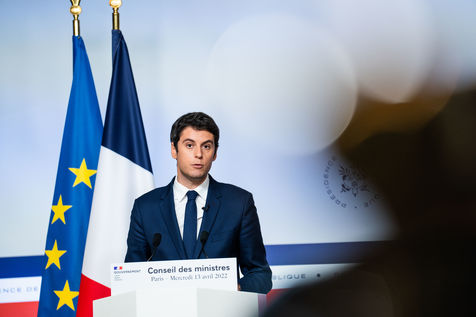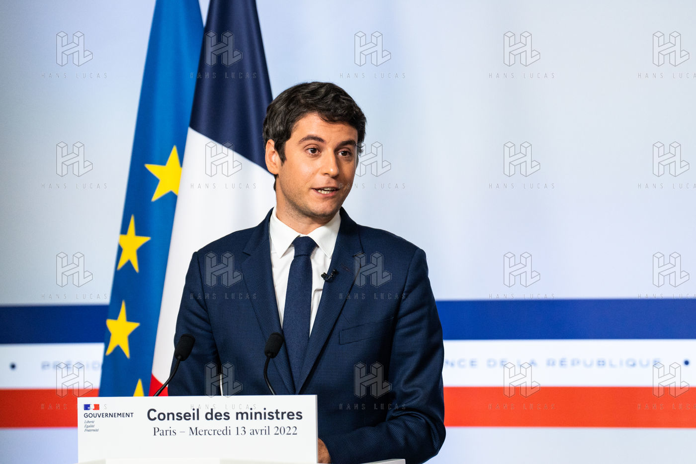 Gabriel Attal, porte-parole du gouvernement, fait un compte-rendu à l'issue du conseil des ministres, dans la salle du porte-parole, Paris 13 avril 2022.