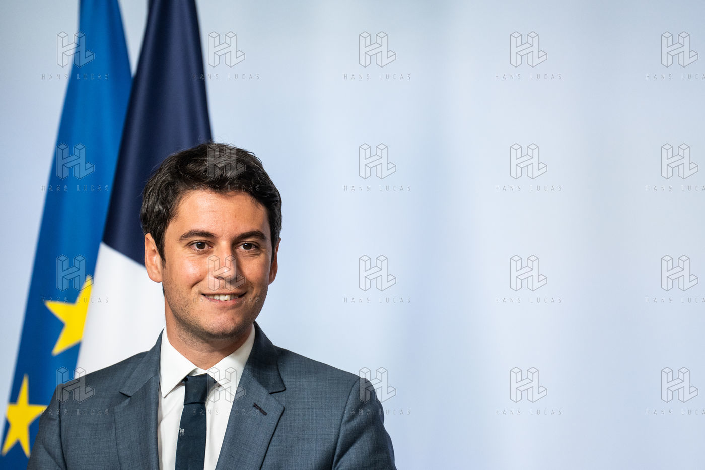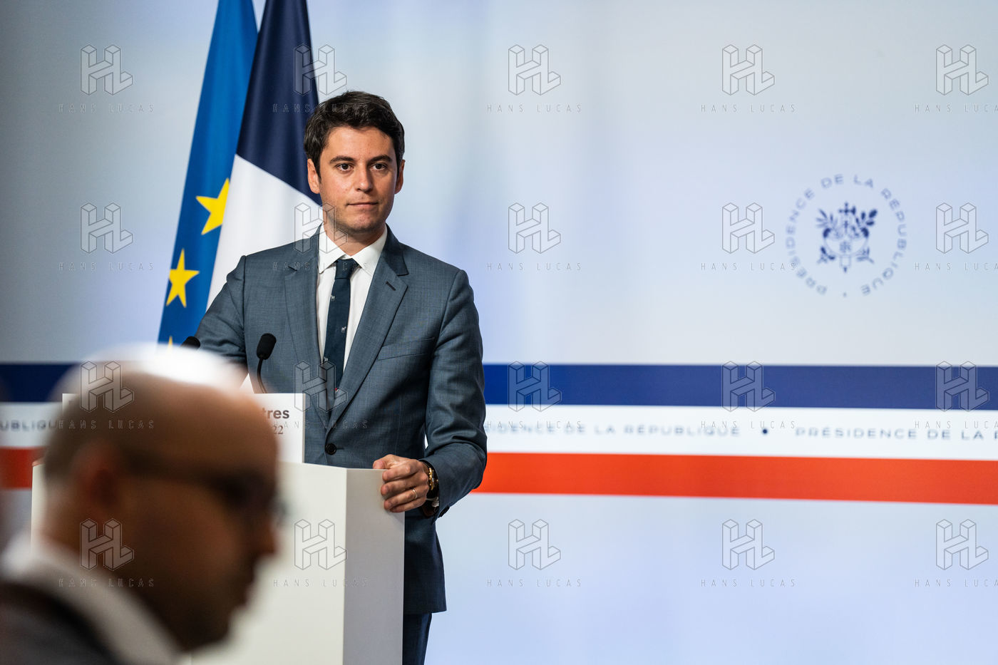 Gabriel Attal, porte-parole du gouvernement, fait un compte-rendu à l'issue du conseil des ministres, dans la salle du porte-parole, Paris 20 avril 2022.