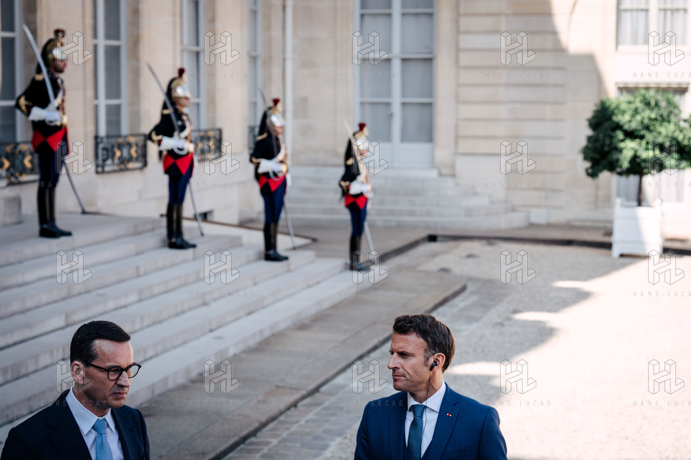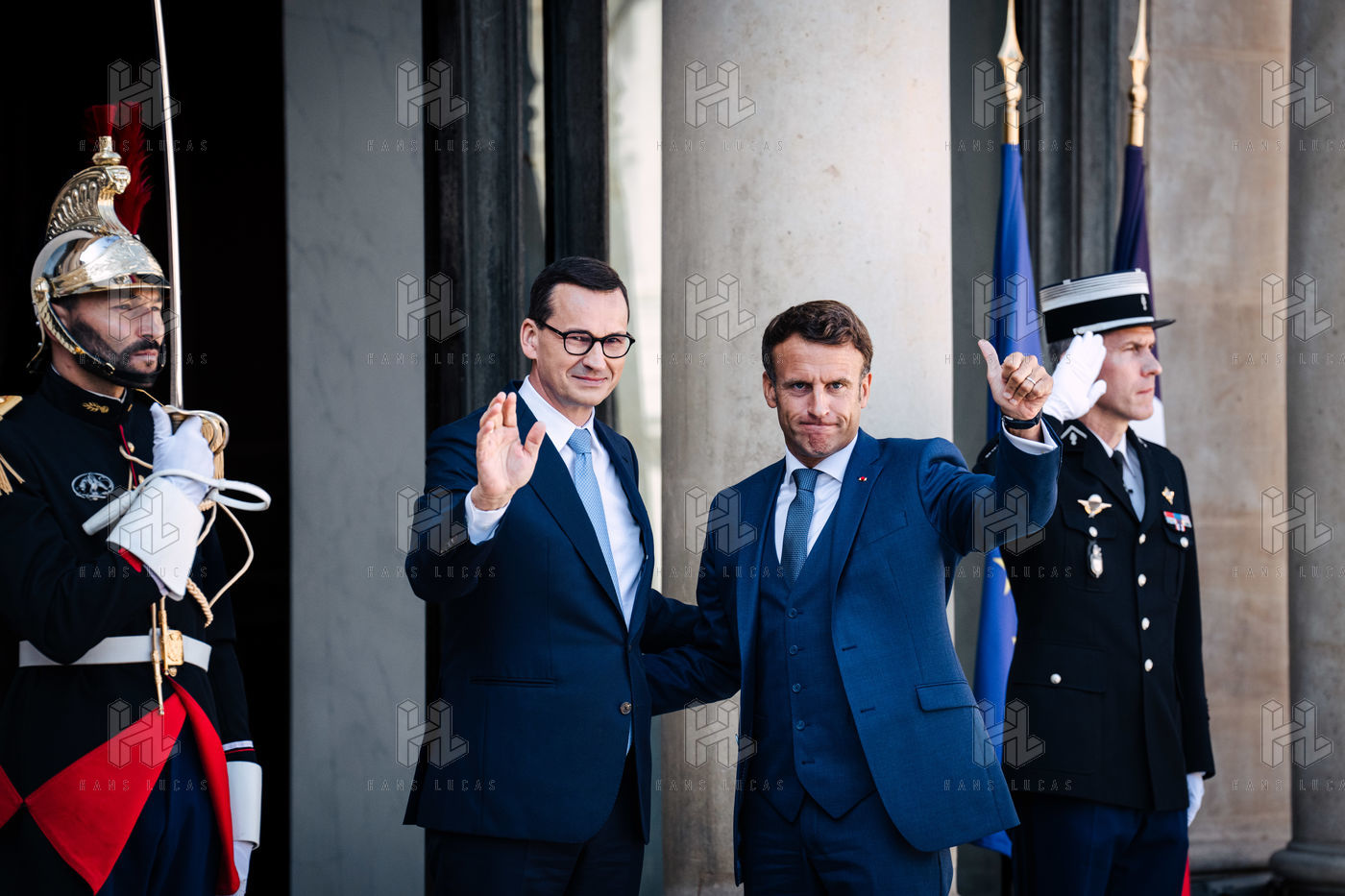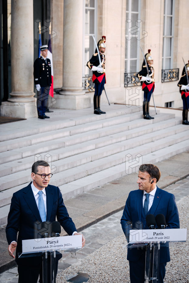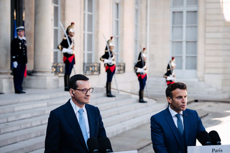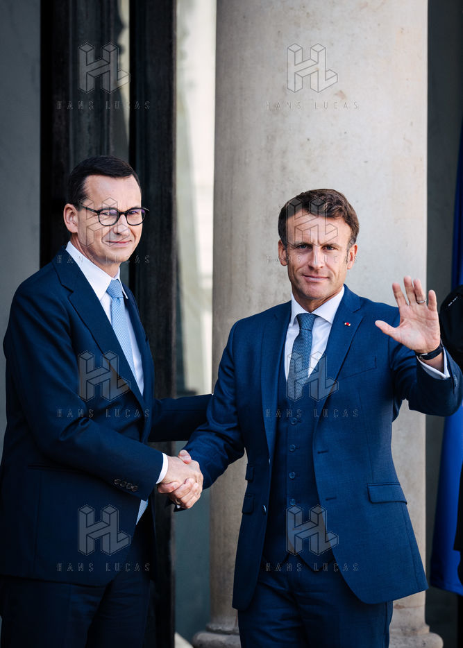 Rencontre entre Mateusz Morawiecki, président du Conseil des ministres de Pologne, et Emmanuel Macron, président de la République française, au palais de l'Élysée.