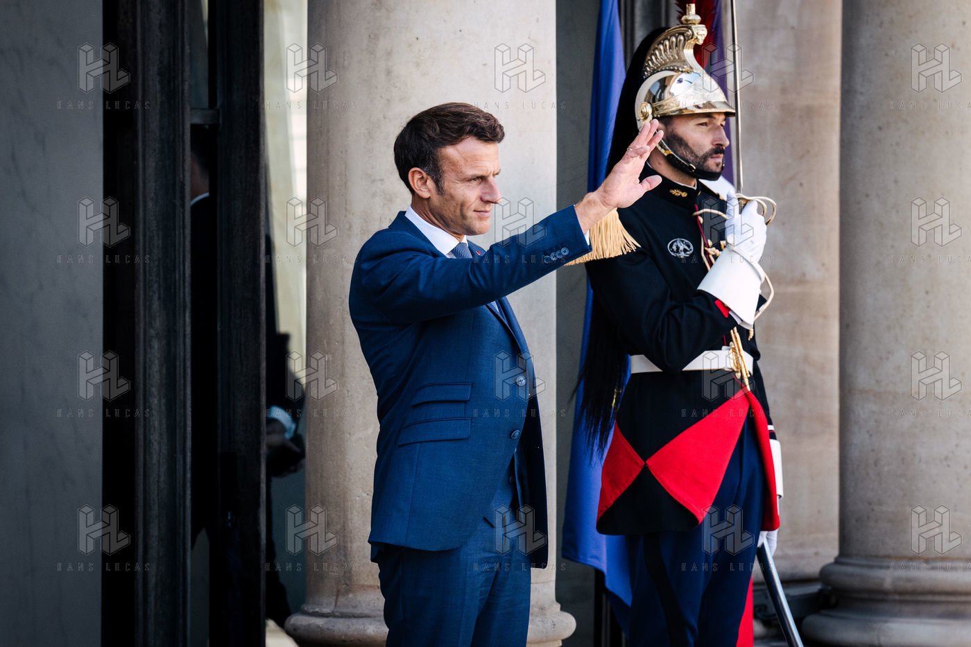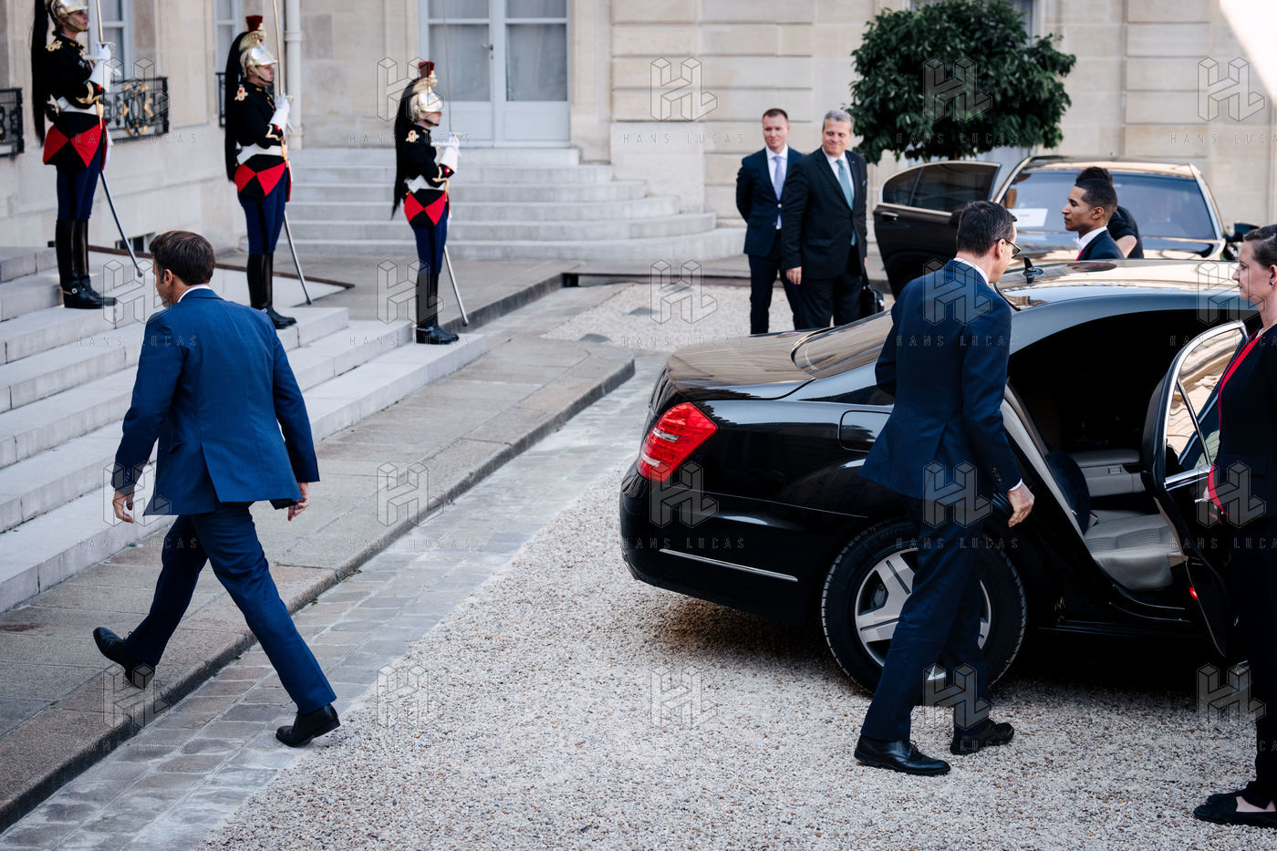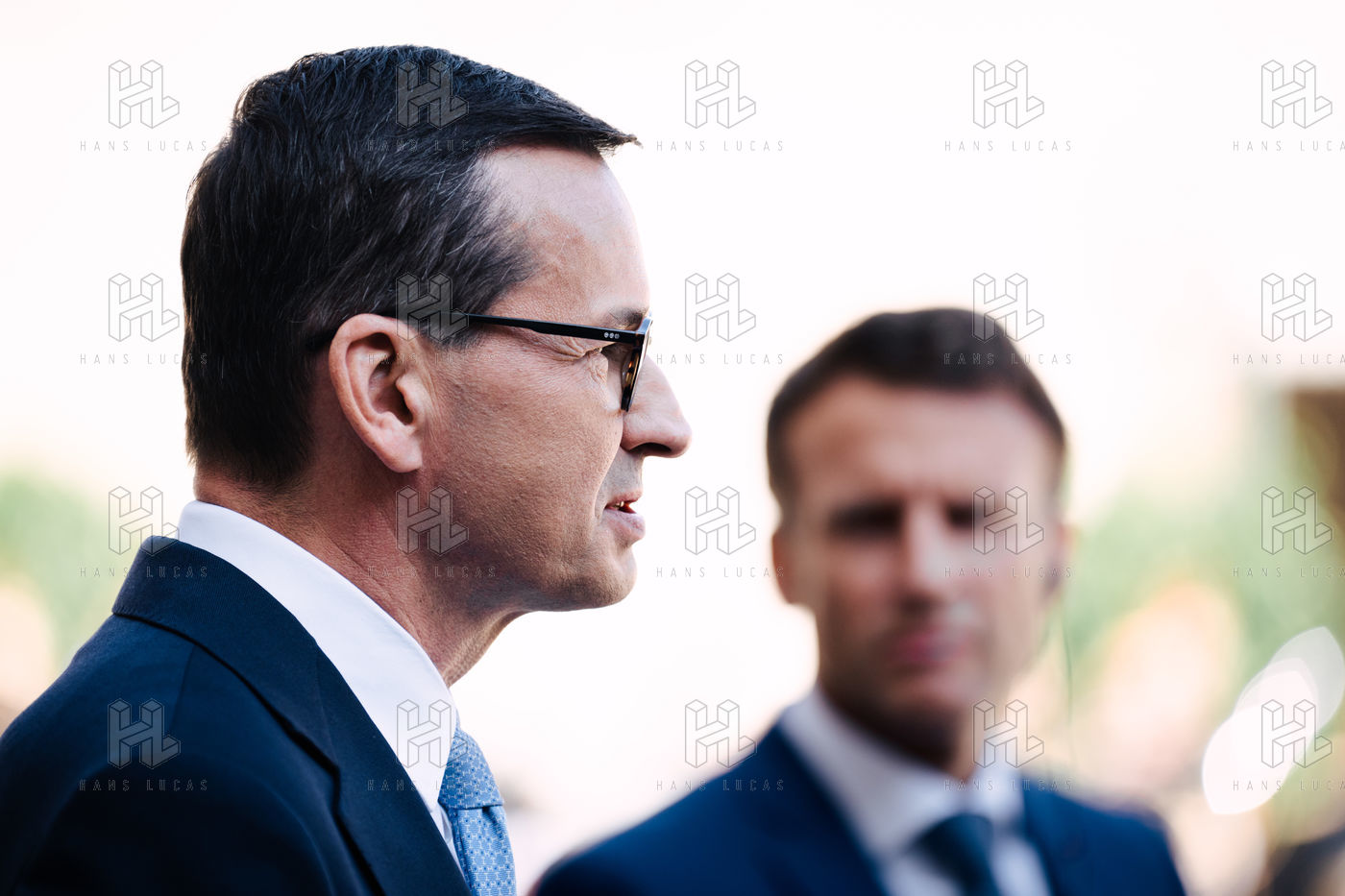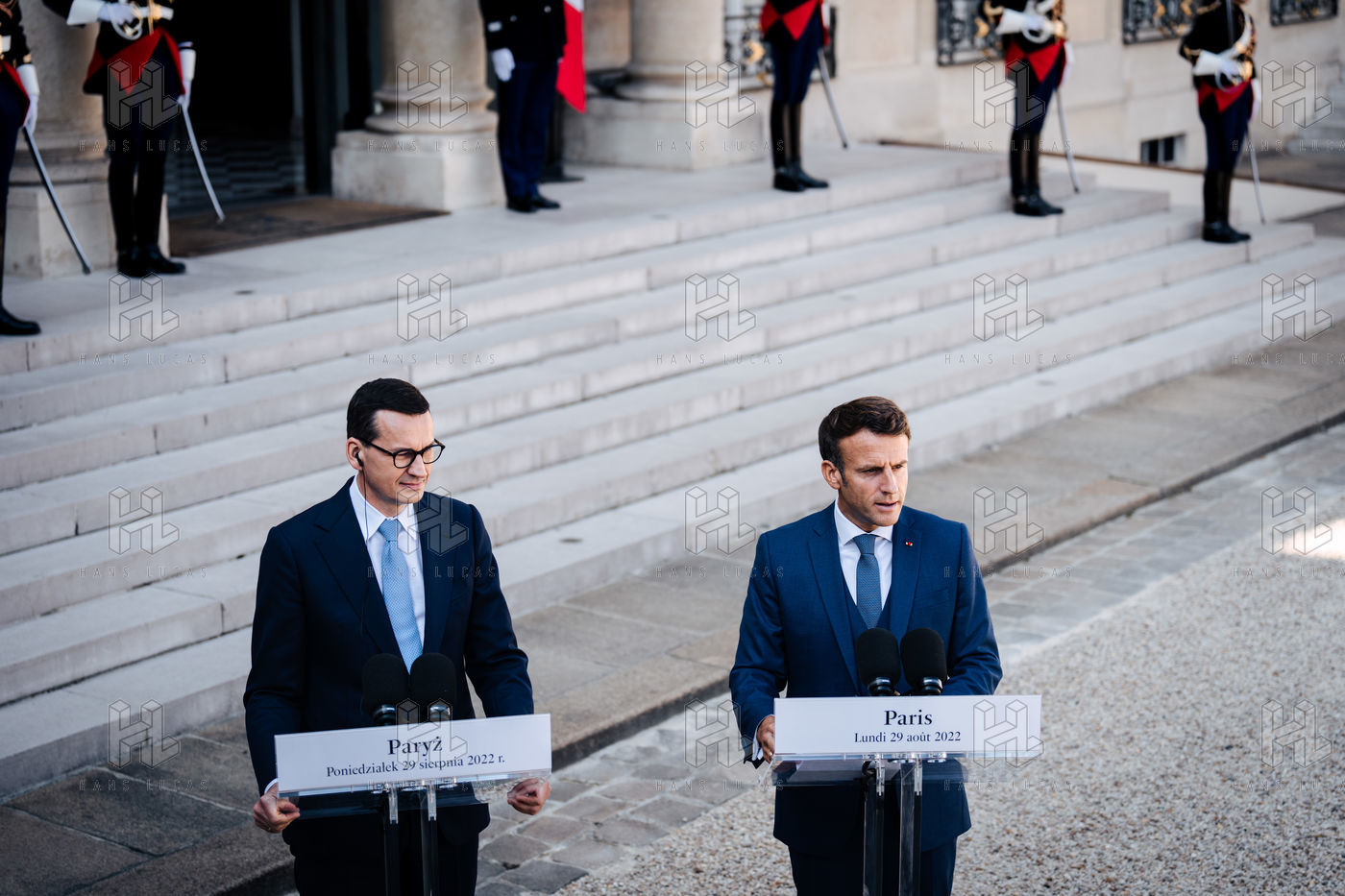 Rencontre entre Mateusz Morawiecki, président du Conseil des ministres de Pologne, et Emmanuel Macron, président de la République française, au palais de l'Élysée.