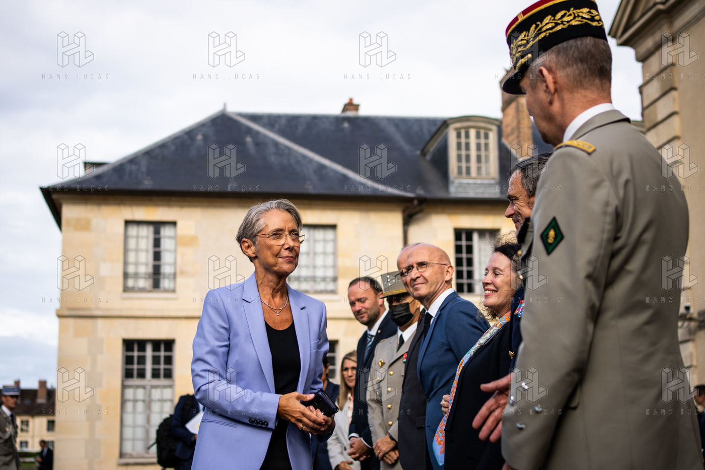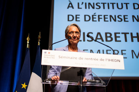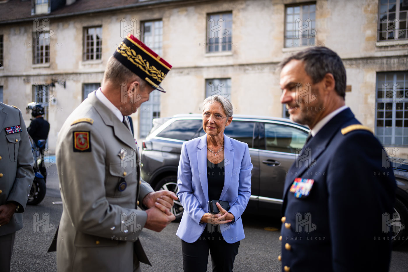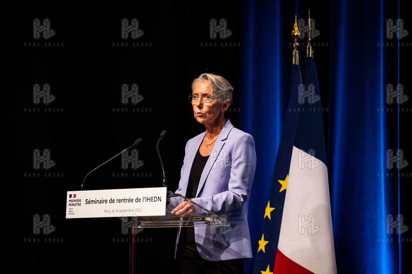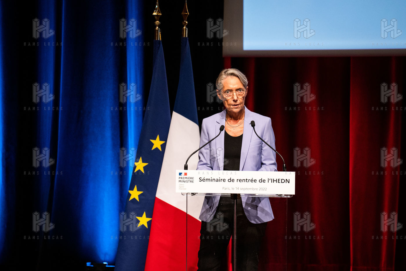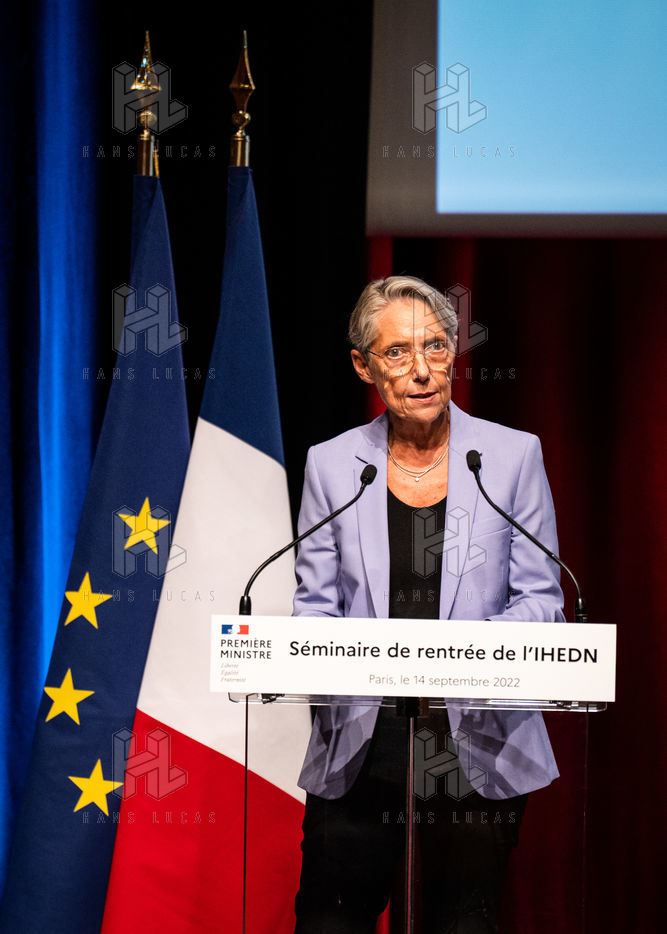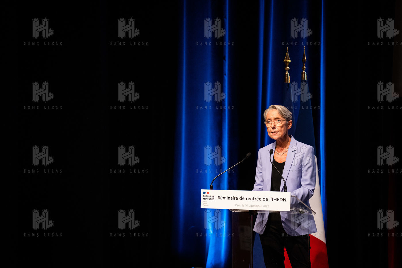 Visite d'Elisabeth Borne, Premier ministre française, à l'occasion de la leçon inaugurale du séminaire de rentrée des auditeurs de l'Institut des Hautes Etudes de la Défense Nationale (IHEDN) à l'Ecole Militaire. Le Premier ministre prononce un discours devant les membres de la session nationale.