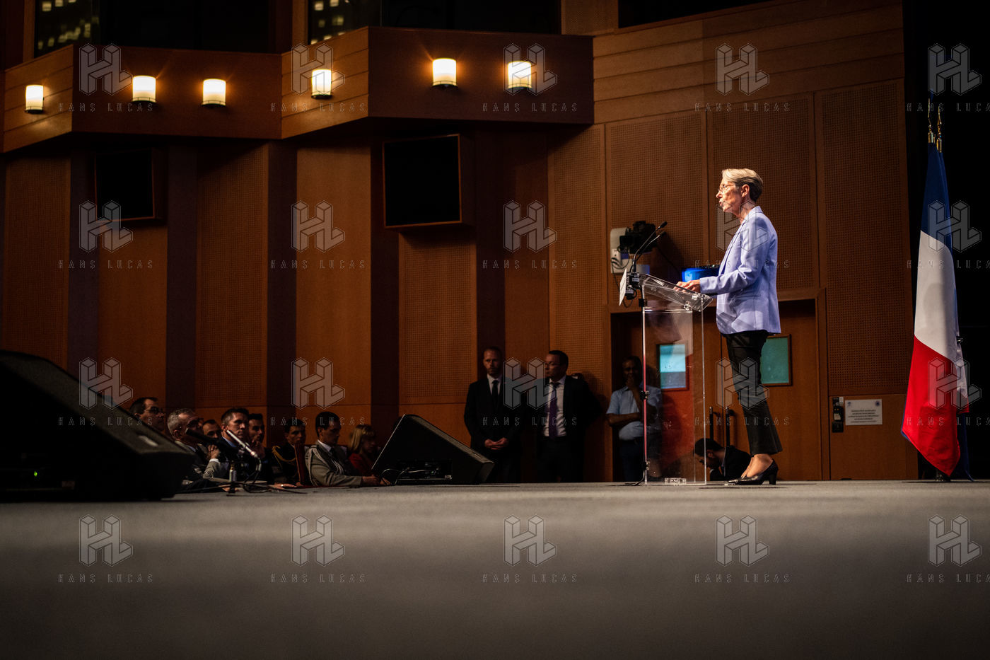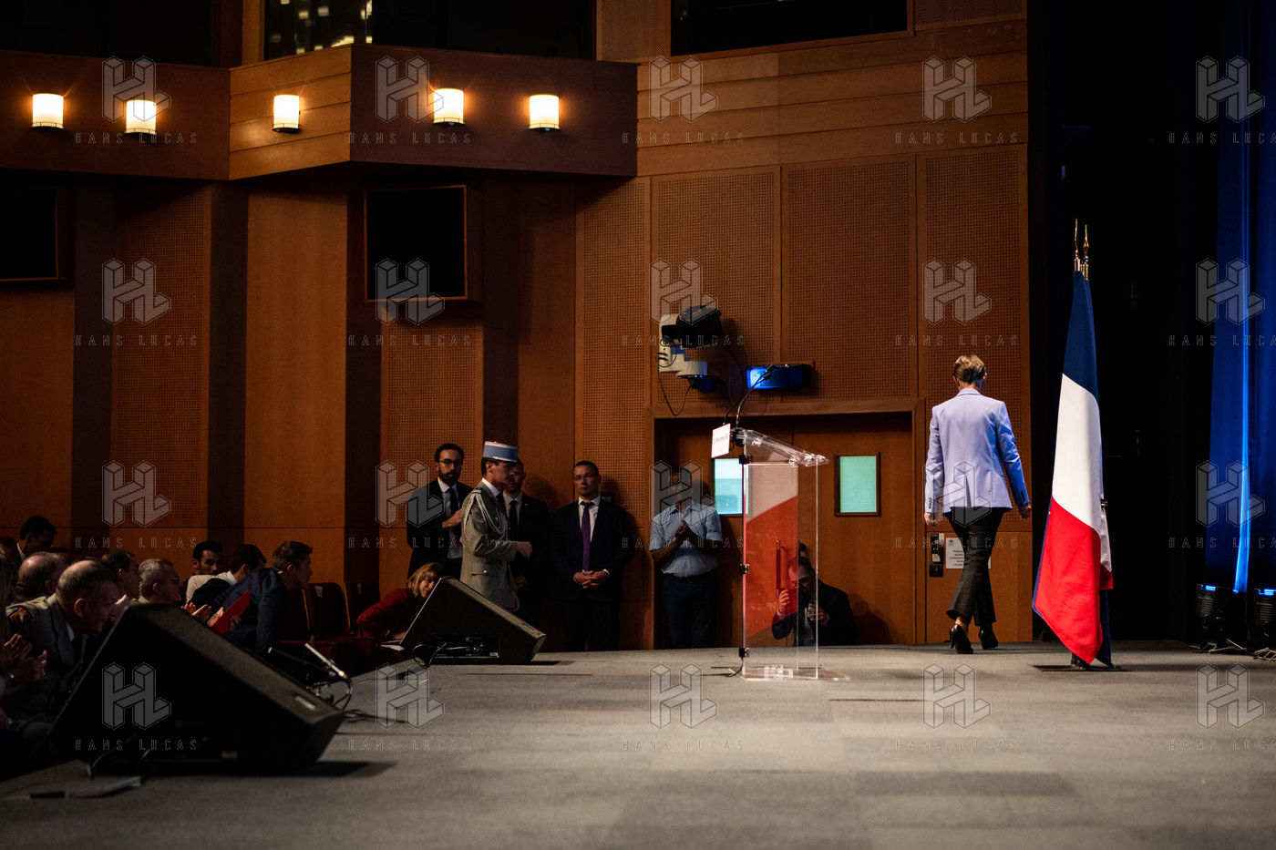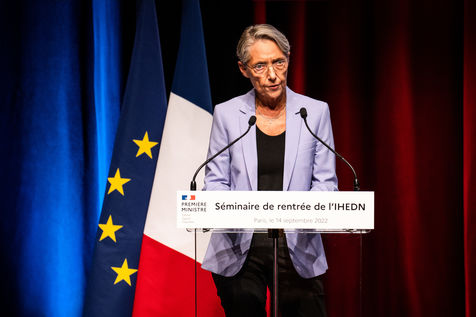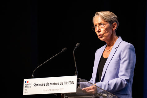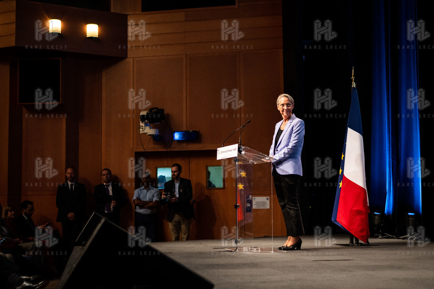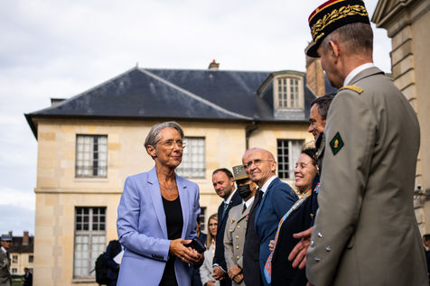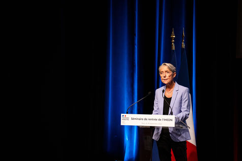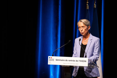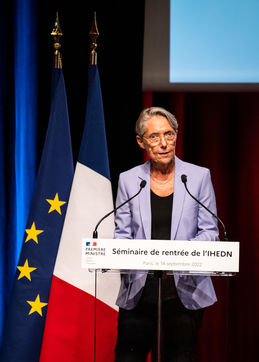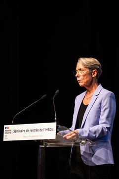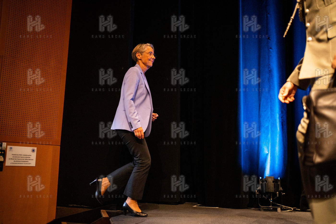 Visite d'Elisabeth Borne, Premier ministre française, à l'occasion de la leçon inaugurale du séminaire de rentrée des auditeurs de l'Institut des Hautes Etudes de la Défense Nationale (IHEDN) à l'Ecole Militaire. Le Premier ministre prononce un discours devant les membres de la session nationale.