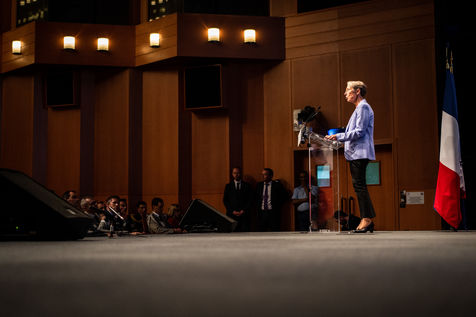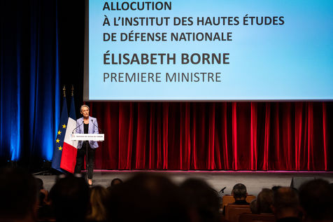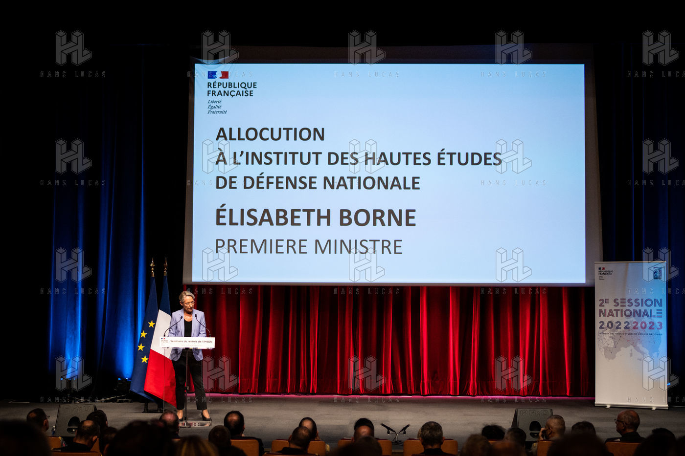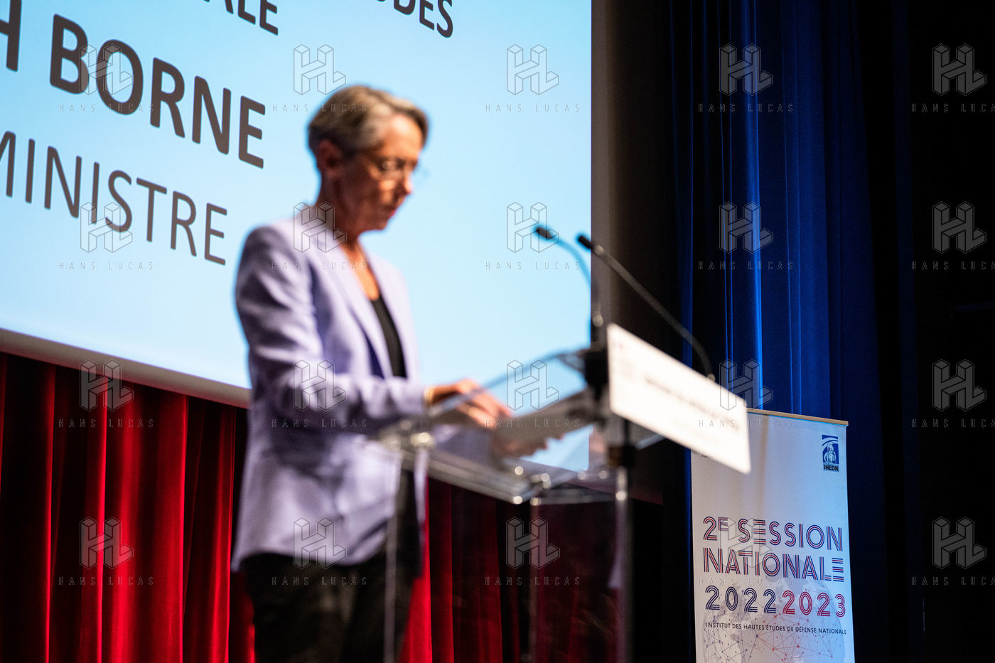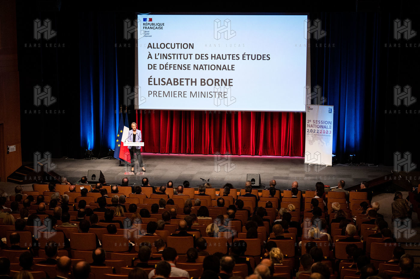 Visit of Elisabeth Borne, French Prime Minister, on the occasion of the inaugural lesson of the seminar of the Institut des Hautes Etudes de la Défense Nationale (IHEDN) at the Ecole Militaire. The Prime Minister delivers a speech to the members of the national session.