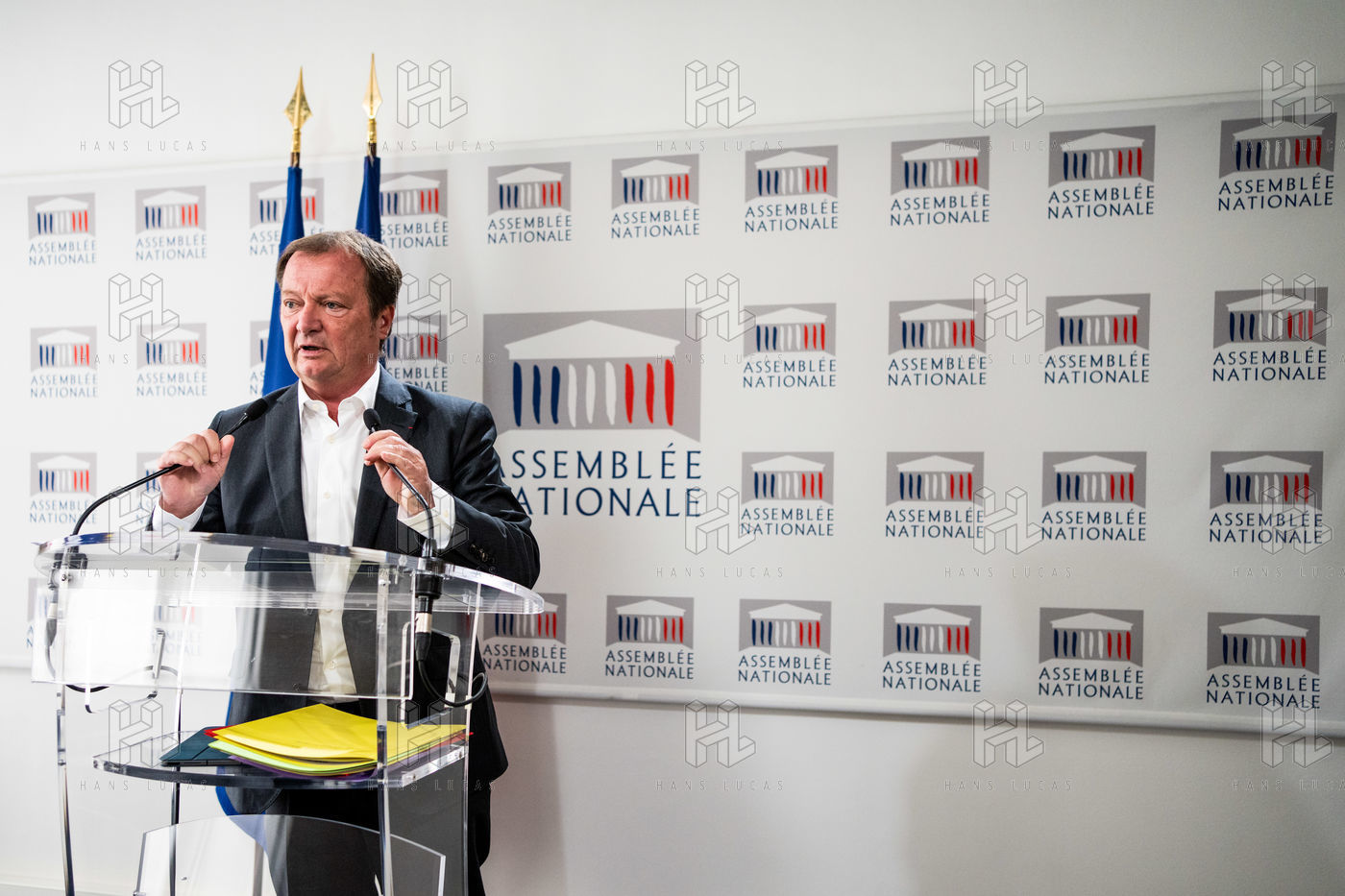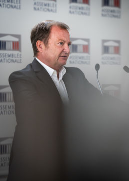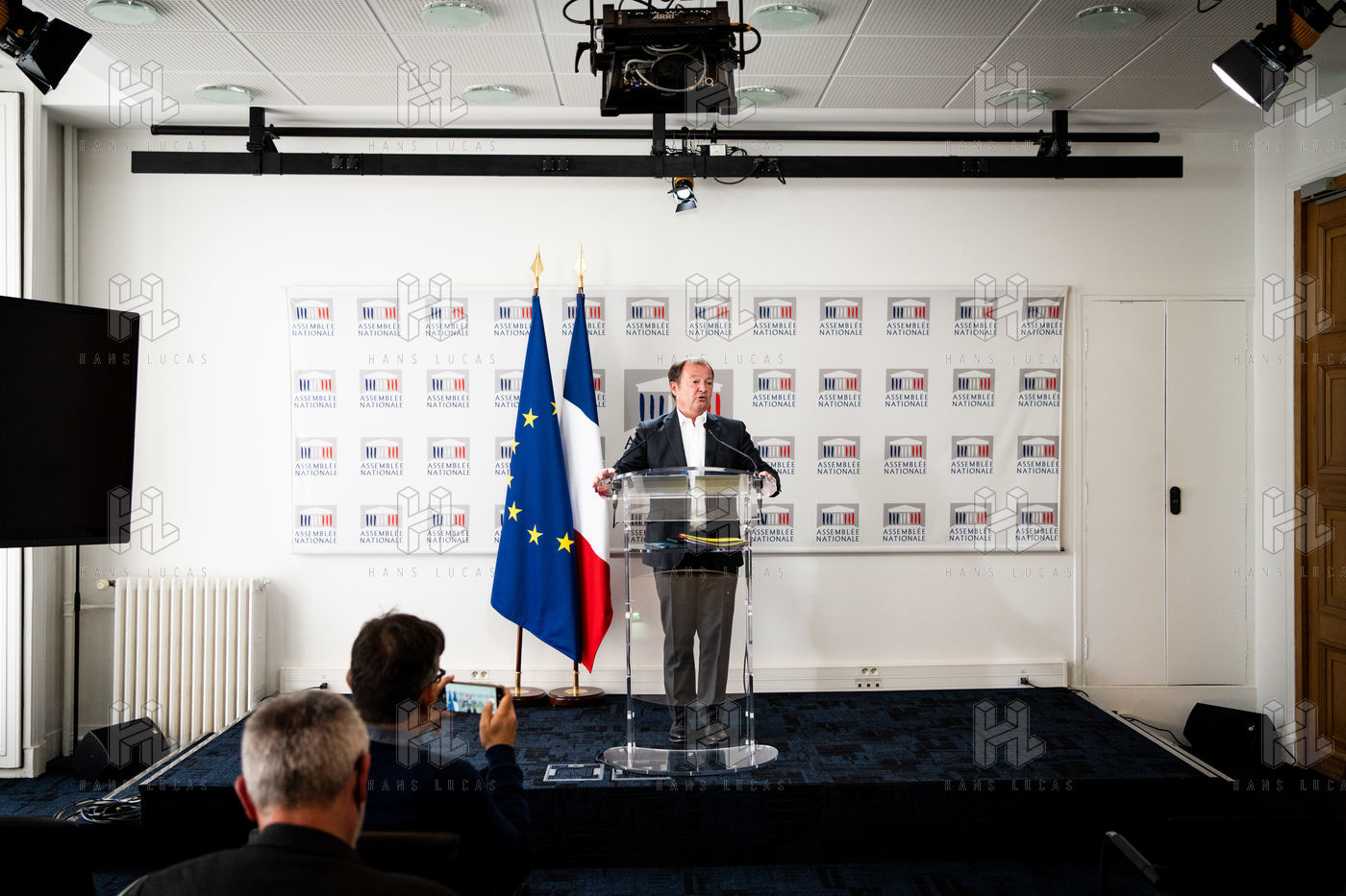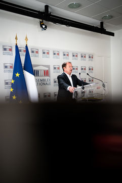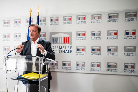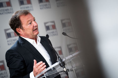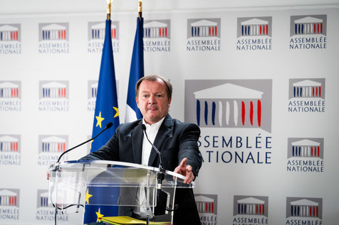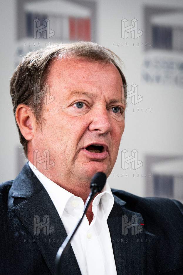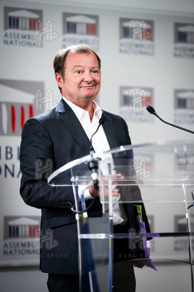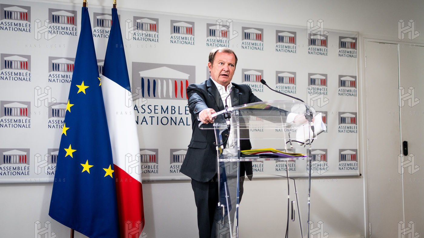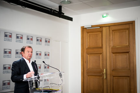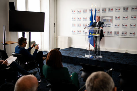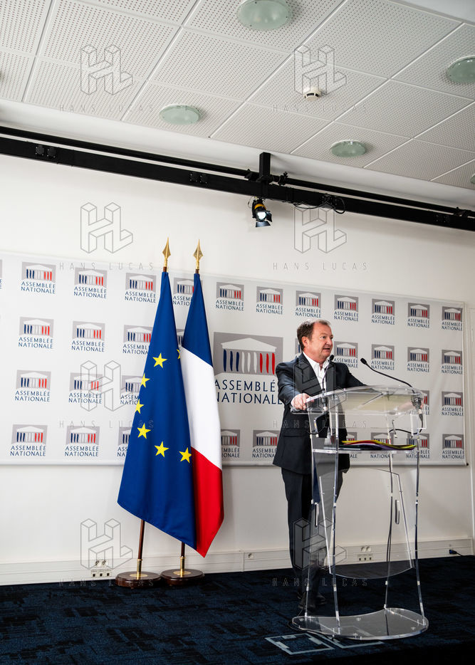 Presentation by Stéphane Peu, deputy of Seine Saint Denis of the communist party, democratic and republican left, GDR, member of the NUPES, of the bill relating to the answer to the crisis of recruitment of the teachers of the National Education, in the conference room of the National Assembly.