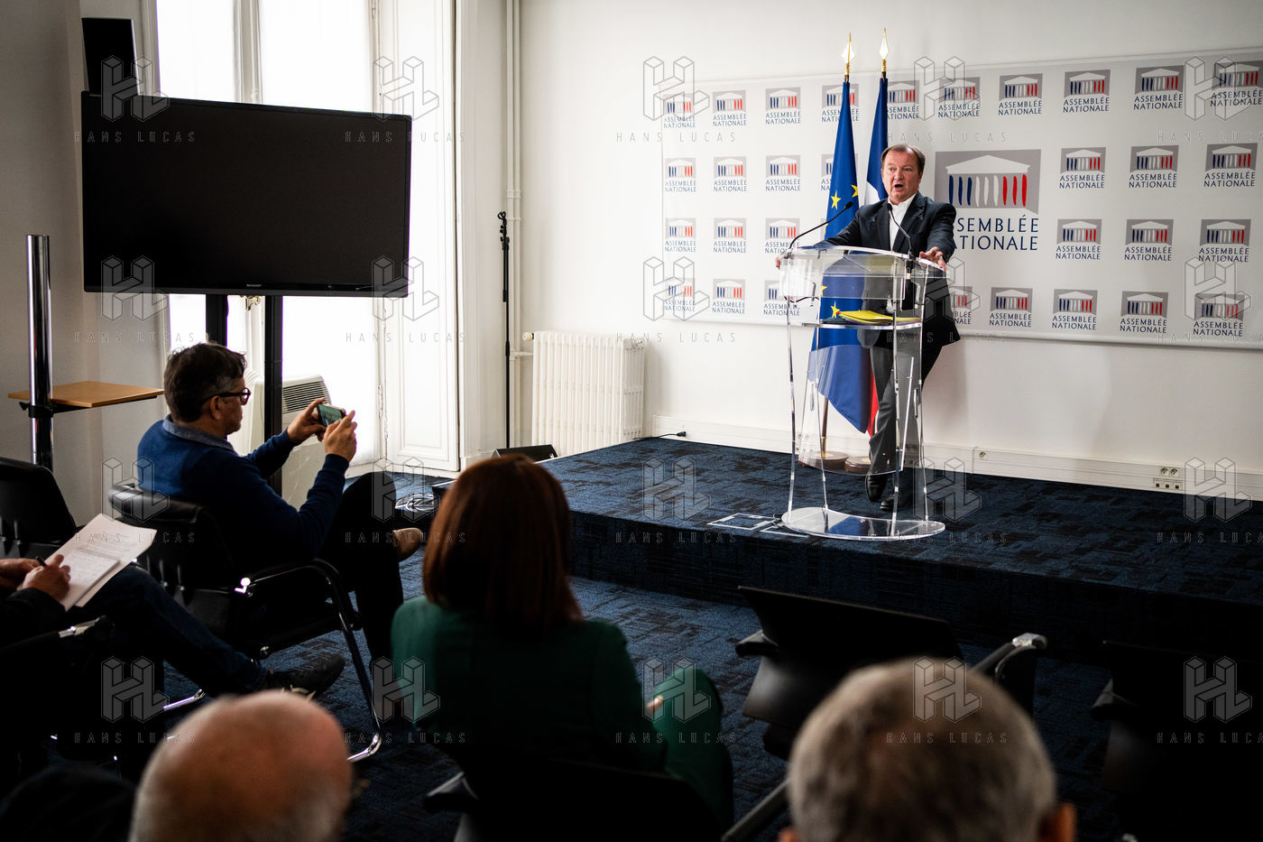 Présentation par Stéphane Peu, député de Seine Saint Denis du parti communiste, gauche démocratique et républicaine, GDR, membre du NUPES, de la proposition de loi relative à la réponse à la crise de recrutement des enseignants de l'Education Nationale, dans la salle de conférence de l'Assemblée Nationale.