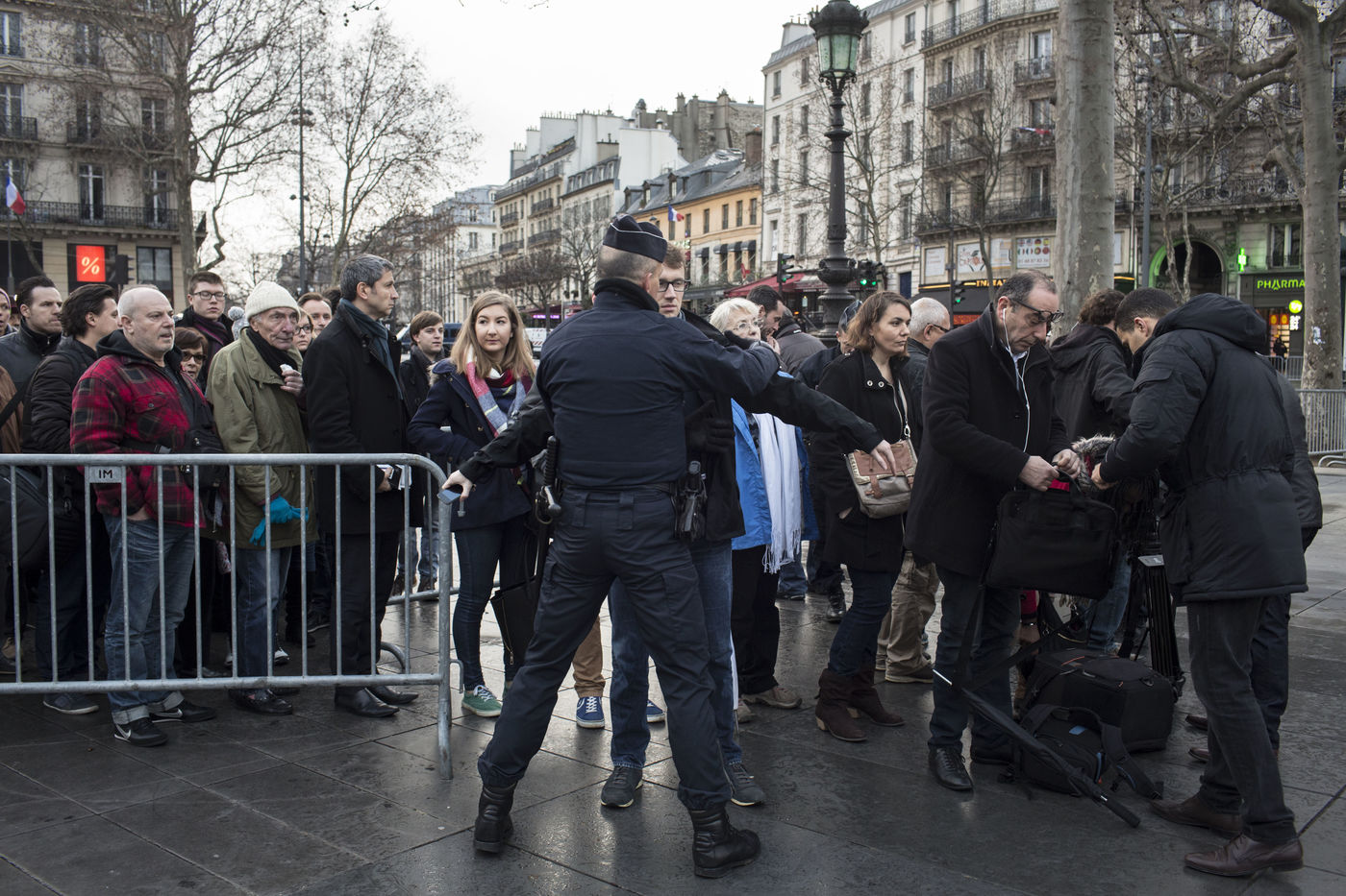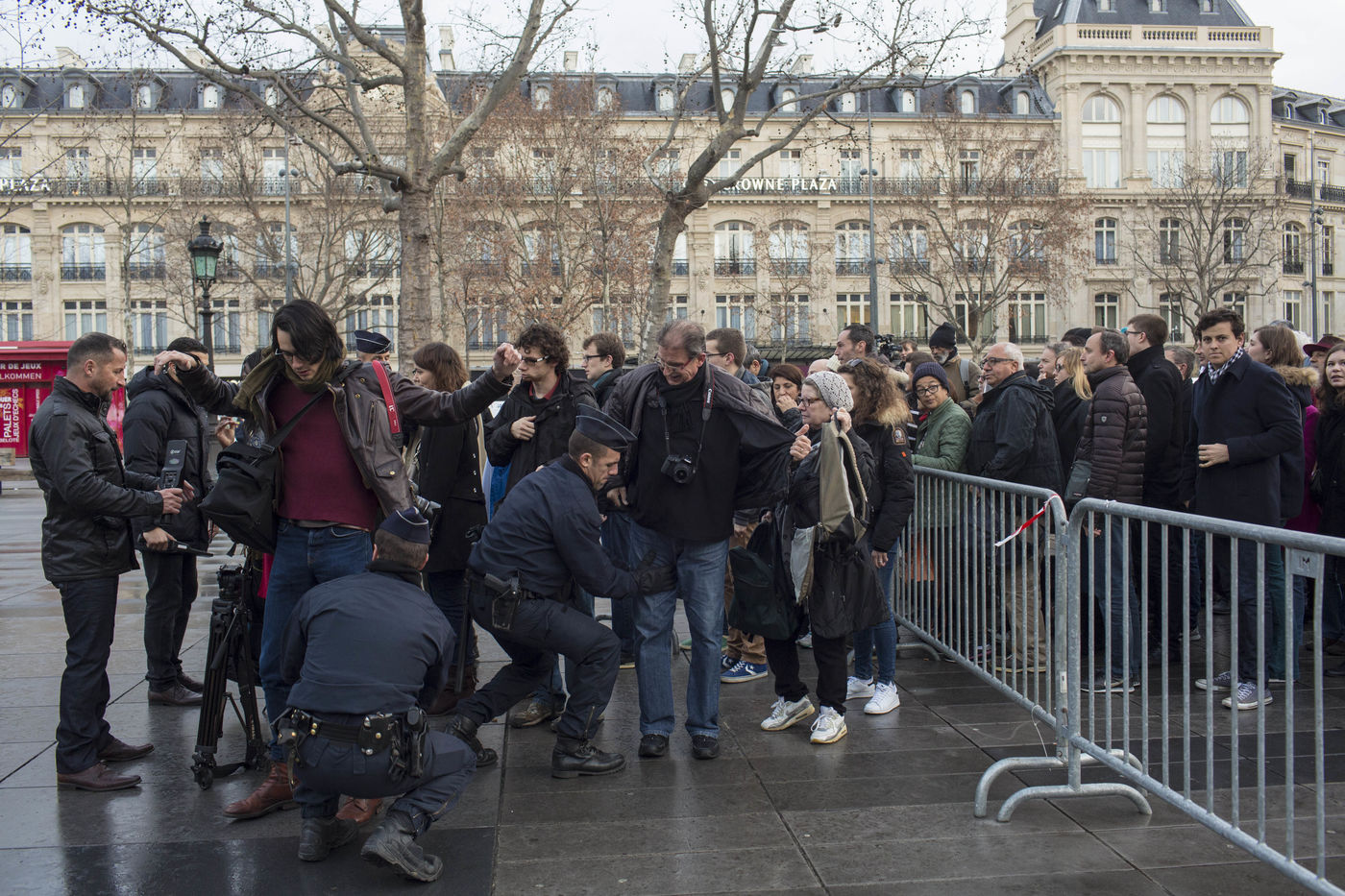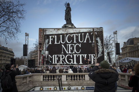Paris, France le 10 janvier 2016. Place de la Republique. Commemoration des attentats de l hebdomadaire Charlie Hebdo et du magasin l Hyper Cacher de la porte de Vincennes. / Paris, France January 10, 2016. Place of the Republic. Commemoration of the attacks of the satirical weekly newspaper Charlie Hebdo and the Jewish store Hyper Cacher at the door of Vincennes.