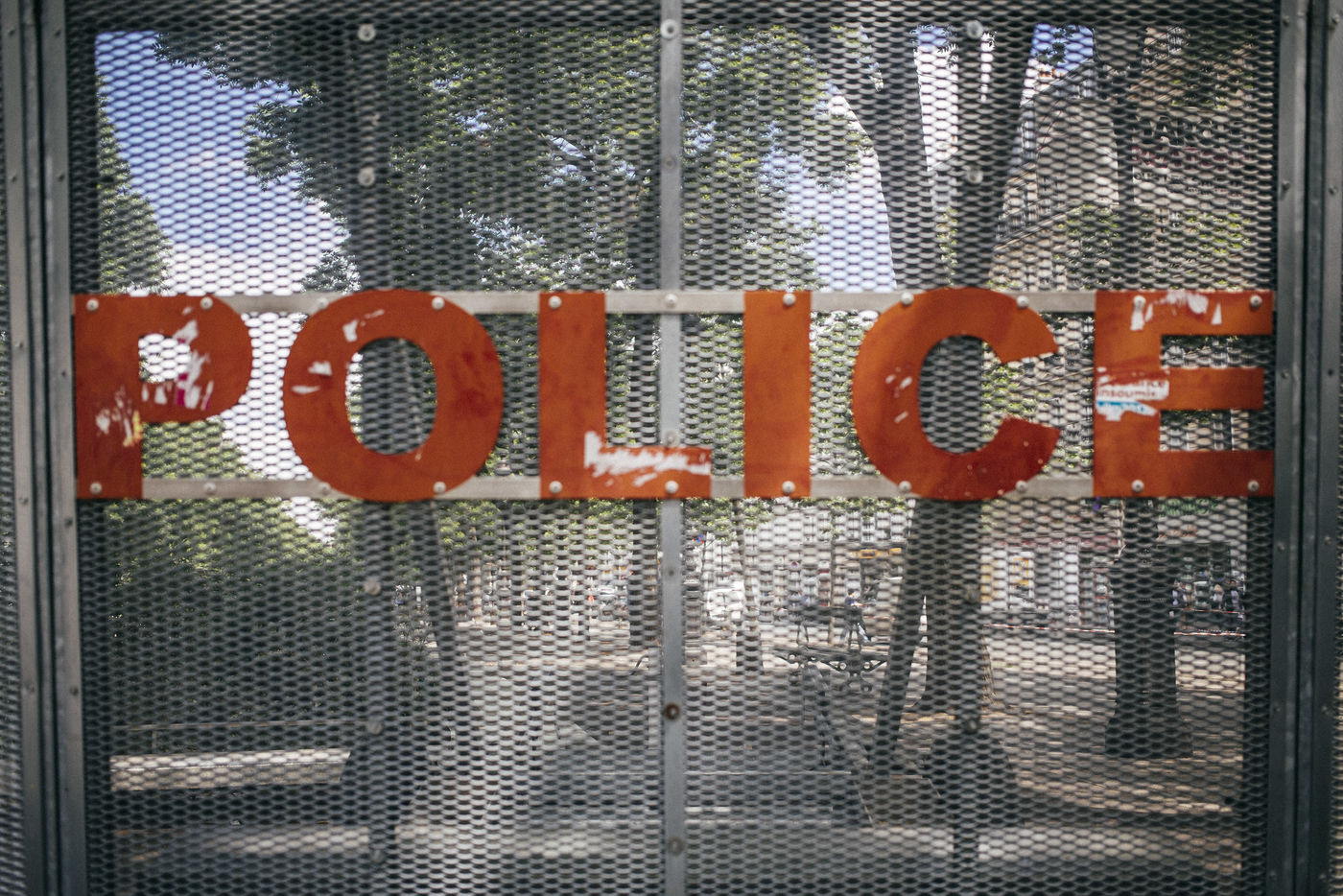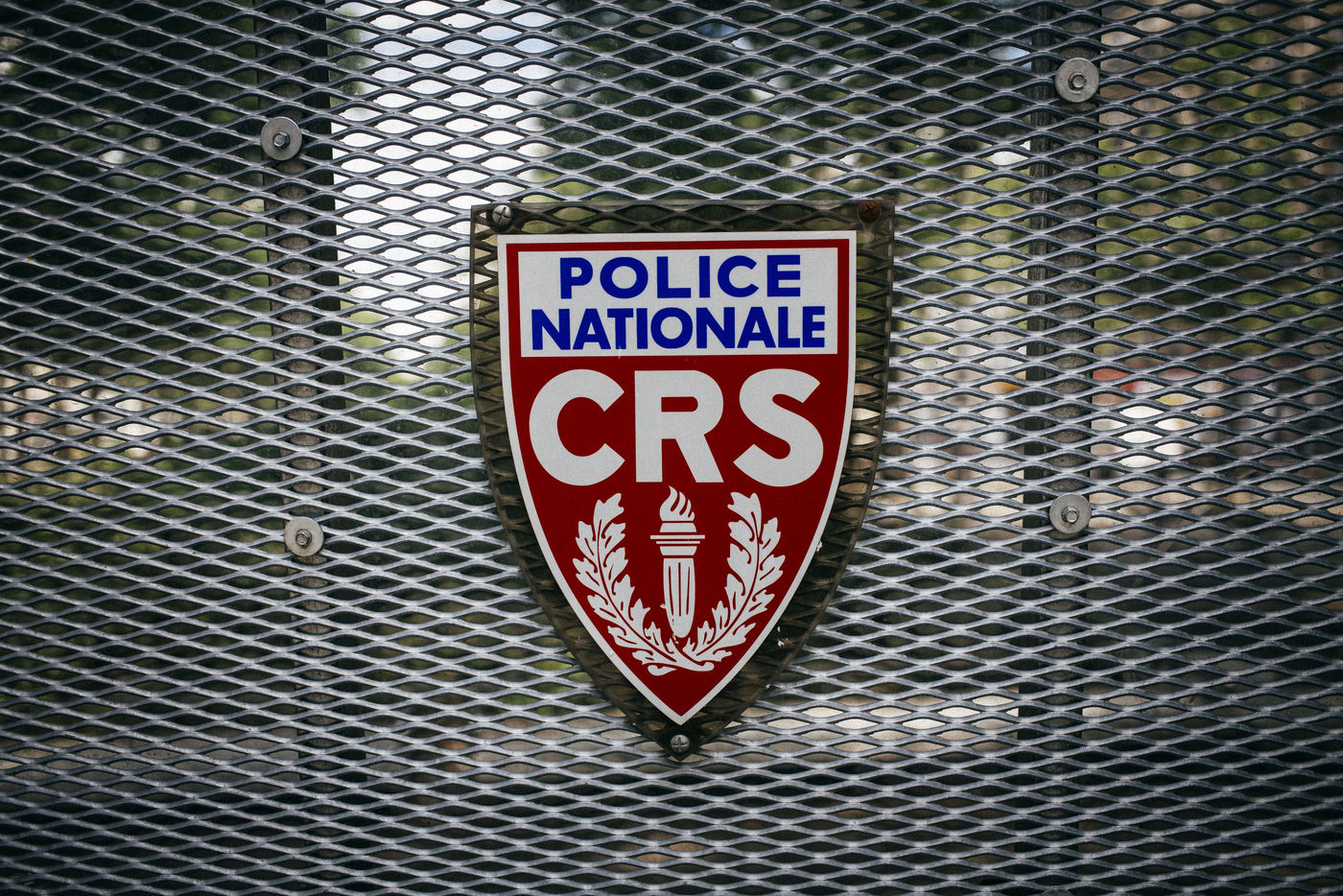 Paris. France le 28 juin 2016. Entre la place de la Bastille et la Place d Italie. Onzieme journee de mobilisation syndicale contre le projet de loi El Khomri coincidant avec son vote au Senat, qui a ete adopte a 185 voix contre 156. Pour encadre la manifestation des grilles anti emeute ont ete deployees sur tout le trajet, ici l l embleme des CRS.